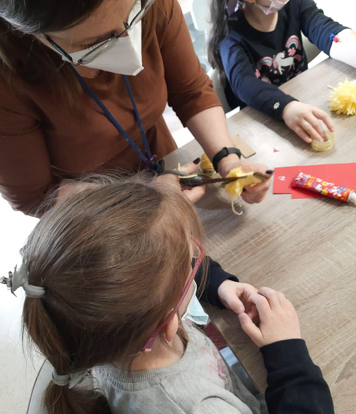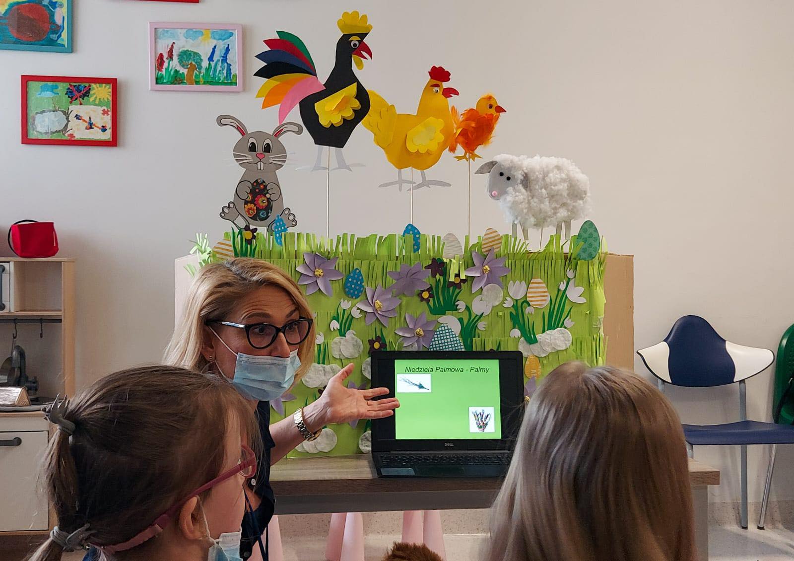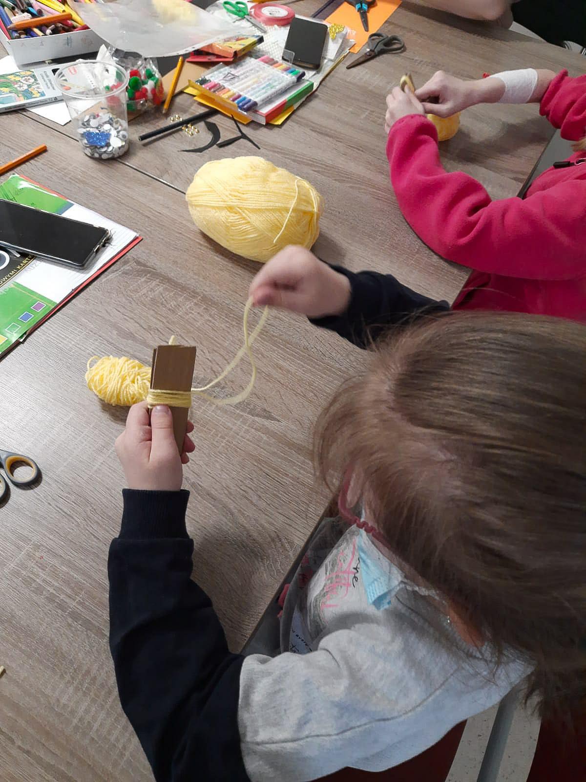 Po obejrzeniu przedstawienia dzieci poznały obyczaje związane ze Świętami Wielkanocnymi i w trakcie warsztatów plastycznych wykonały kurczaczki z włóczki.