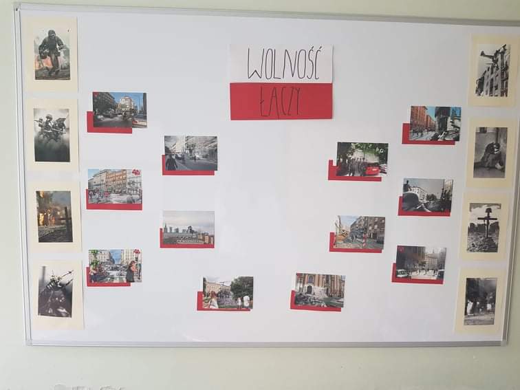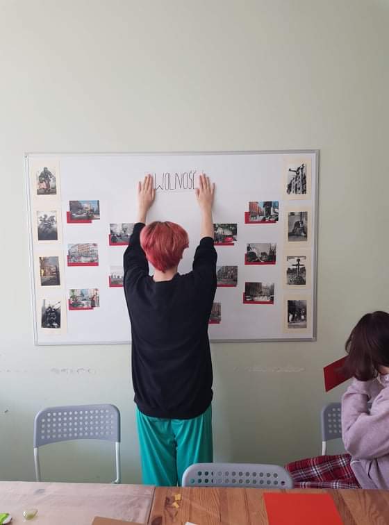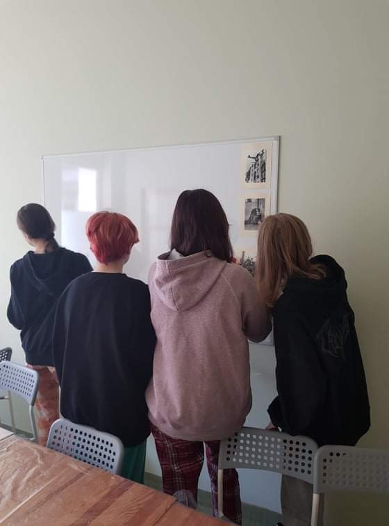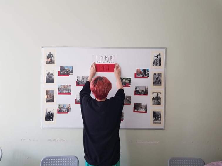 Na pierwszym spotkaniu poznaliśmy literaturę wojenną dla dzieci i młodzieży, obrazy Andrzeja Wróblewskiego i wysłuchaliśmy przemówienia Mariana Turskiego z okazji 76.rocznicy wyzwolenia obozu koncentracyjnego Auschwitz-Birkenau. A na koniec wspólnie stworzyliśmy gazetkę.