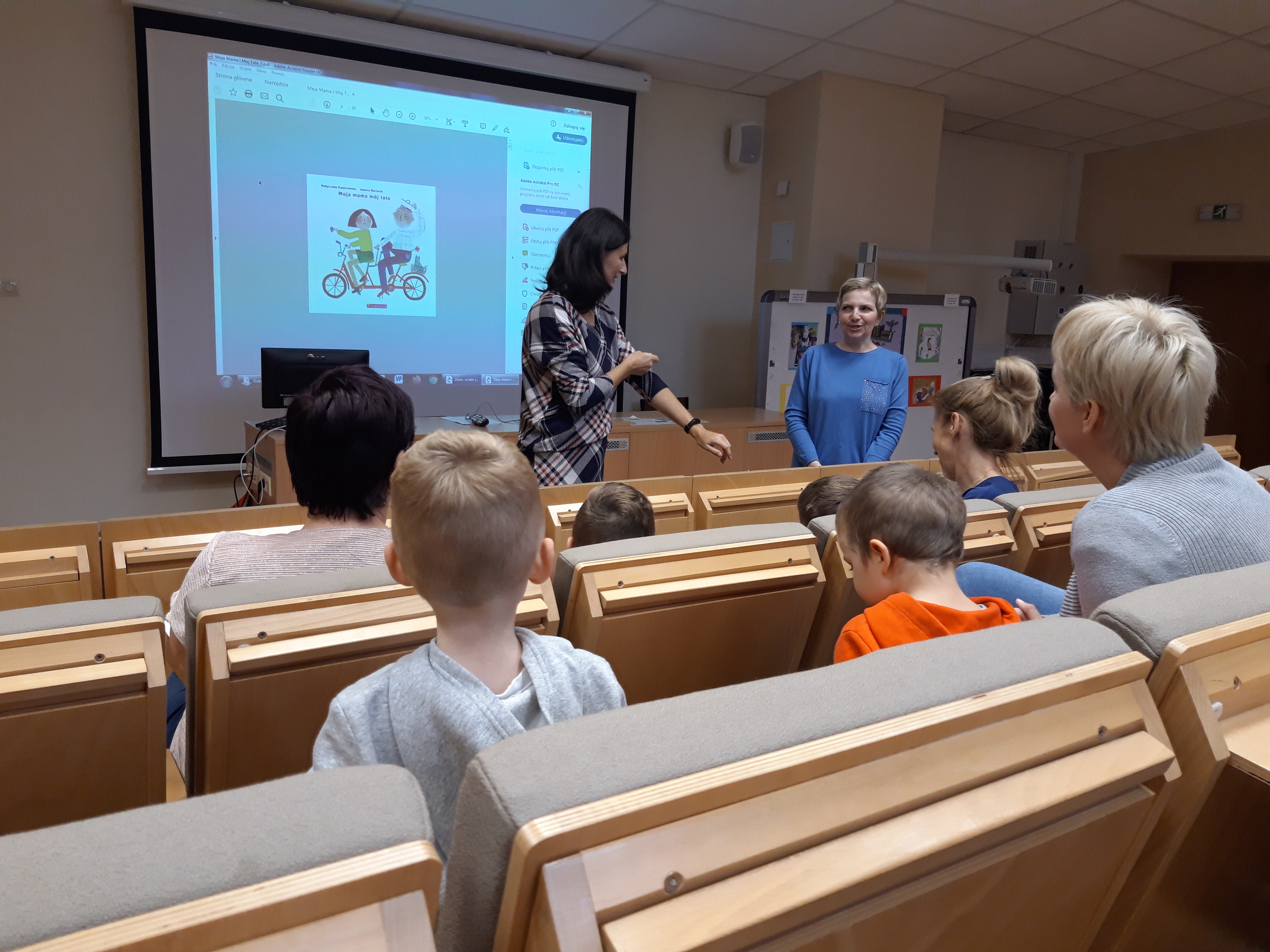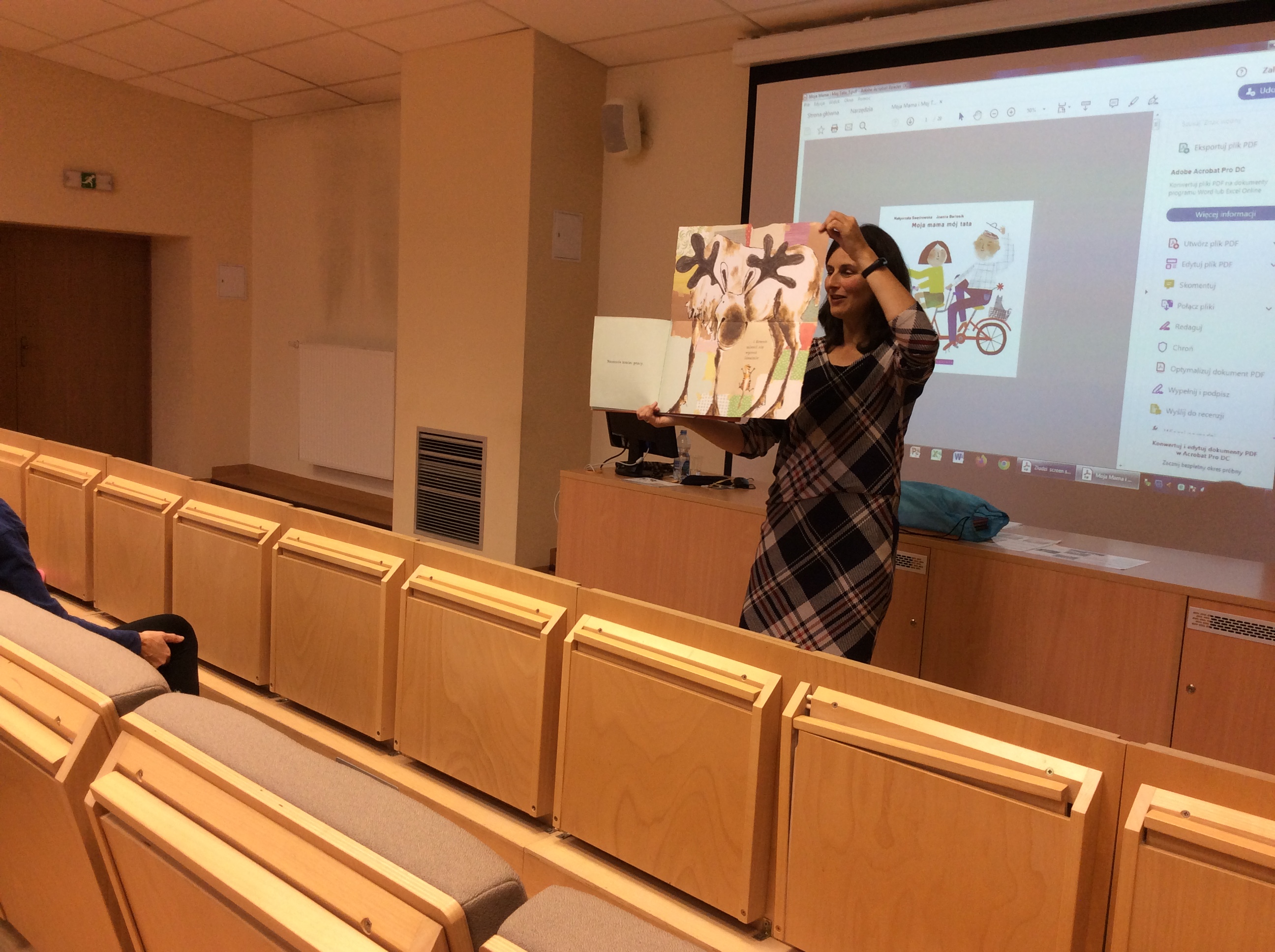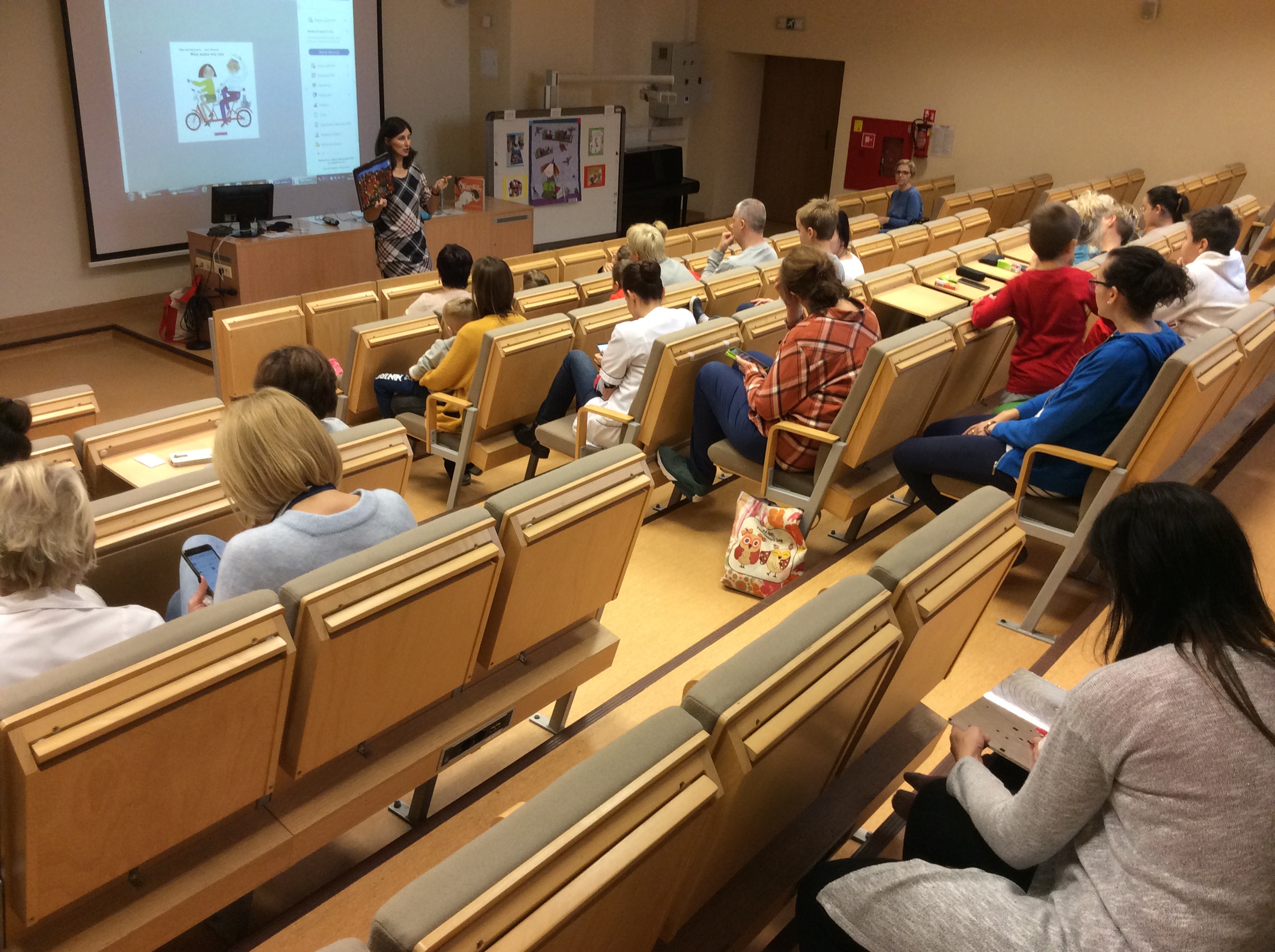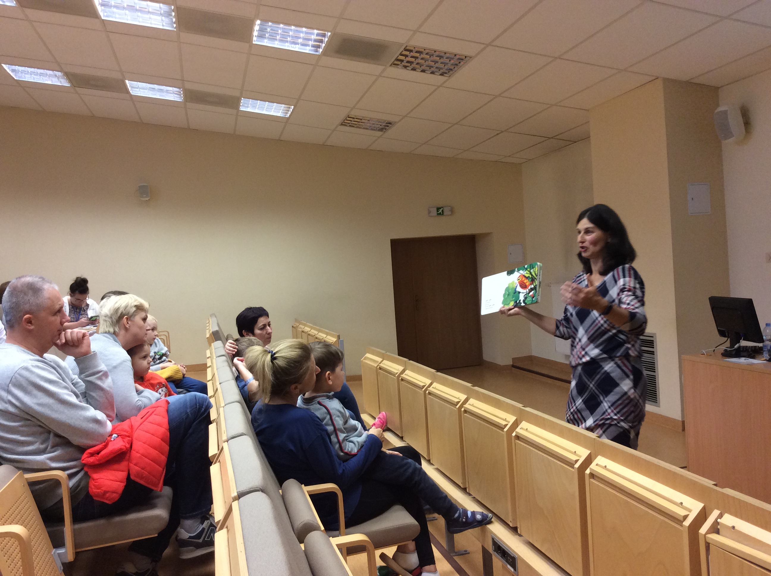 Dnia 12 listopada 2019r. spotkaliśmy się z Panią Małgorzatą Swędrowską, czyli Bajką Gadajką, która nawiązując do obchodzonego niedawno Dnia Postaci z Bajek, przeniosła nas w niezwykły świat przygód bajkowych bohaterów.Z dużym zainteresowaniem wysłuchaliśmy przygody zabawnego łosia Ernesta, który nie mieścił się w książce. Zafascynowała nas także książka Doroty Gellner pt.: „Pisklak” w której główny bohater tuż po narodzinach nie zachwycał otoczenia swoim wyglądem. Natomiast bajka Małgorzaty Swędrowskiej pt.: „Moja Mama, Mój Tata”, ukazała jak ważna dla nas jest rodzina. Z wielką przyjemnością wysłuchaliśmy oraz oglądaliśmy bogato ilustrowaną książkę Wioli Wołoszyn pt.: „Jano i Wito.W trawie”. W świat fantazji przeniosła nas tajemnicza książka pt.: „The game of Mirrors” H. Tulleta.