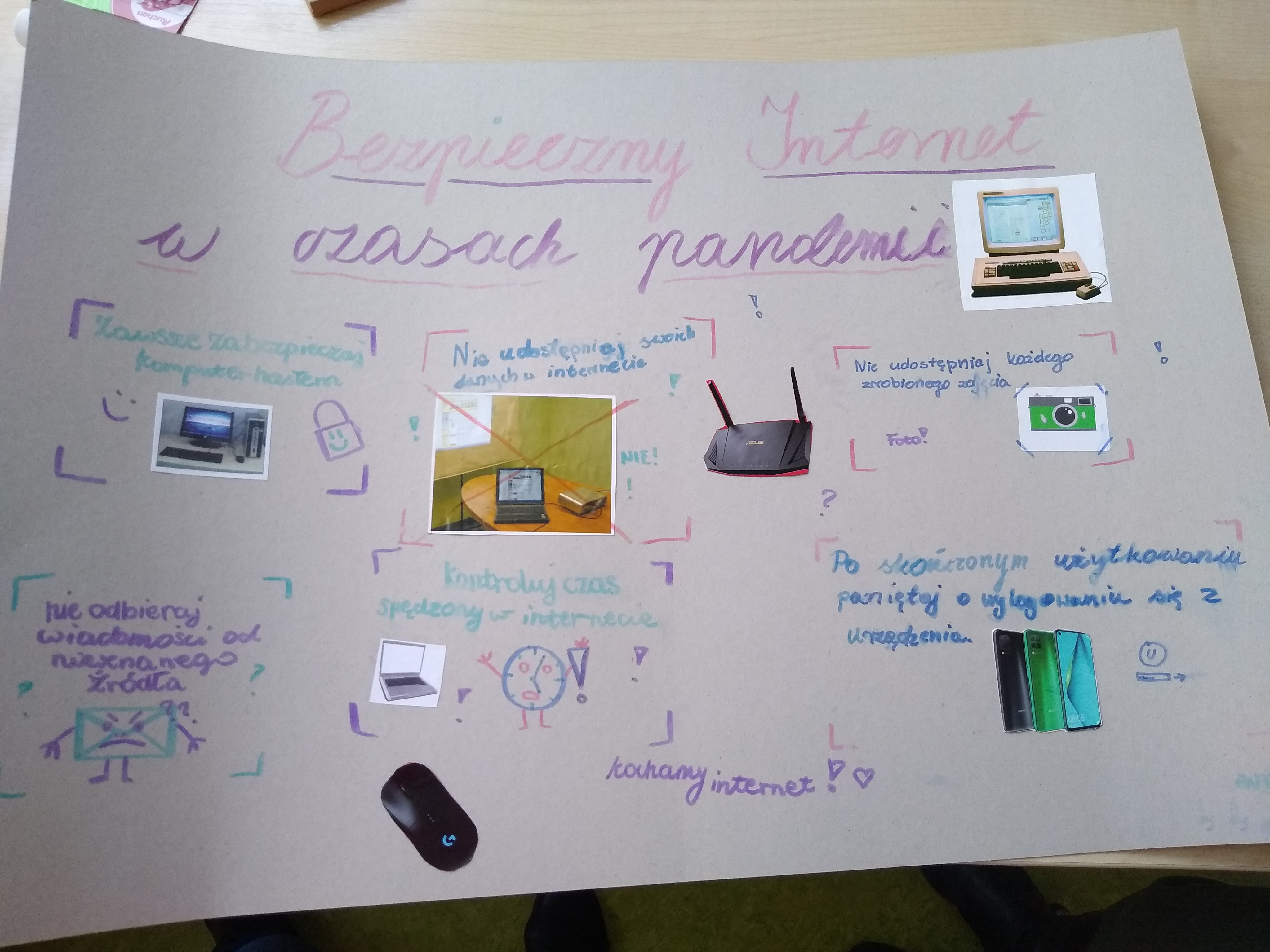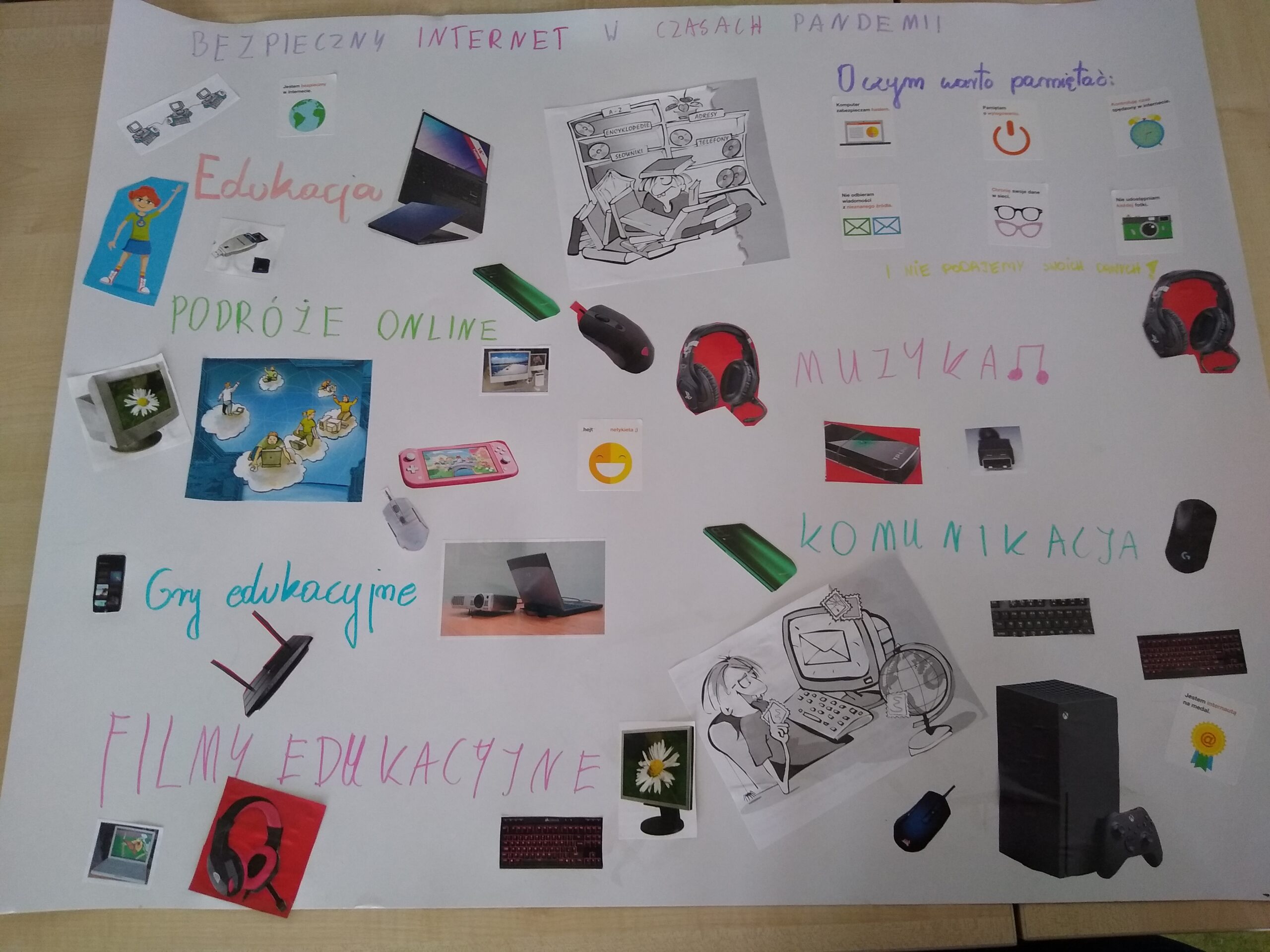 Zaprezentowano dziedziny życia w jakich wykorzystuję się aktualnie Internet i jego wpływ na nasze funkcjonowanie. Zwrócono uwagę, że Internet w obecnych czasach niesie większe zagrożenie uzależnienia niż wcześniej. Uczniowie wykonali plakaty związane z tematem zajęć.