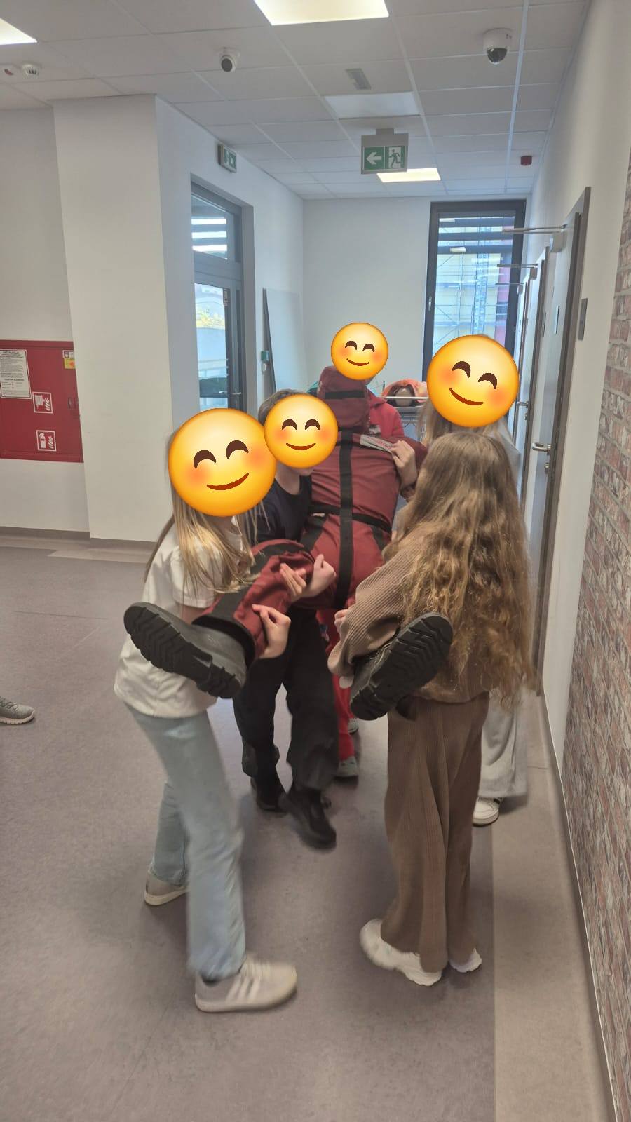 Mogliśmy zobaczyć, gdzie studenci zawodów medycznych uczą się praktycznych umiejętności. Podpatrzyliśmy też strażaków- ratowników, podczas udzielania pierwszej pomocy „ poszkodowanym”. To było bardzo pouczające spotkanie.