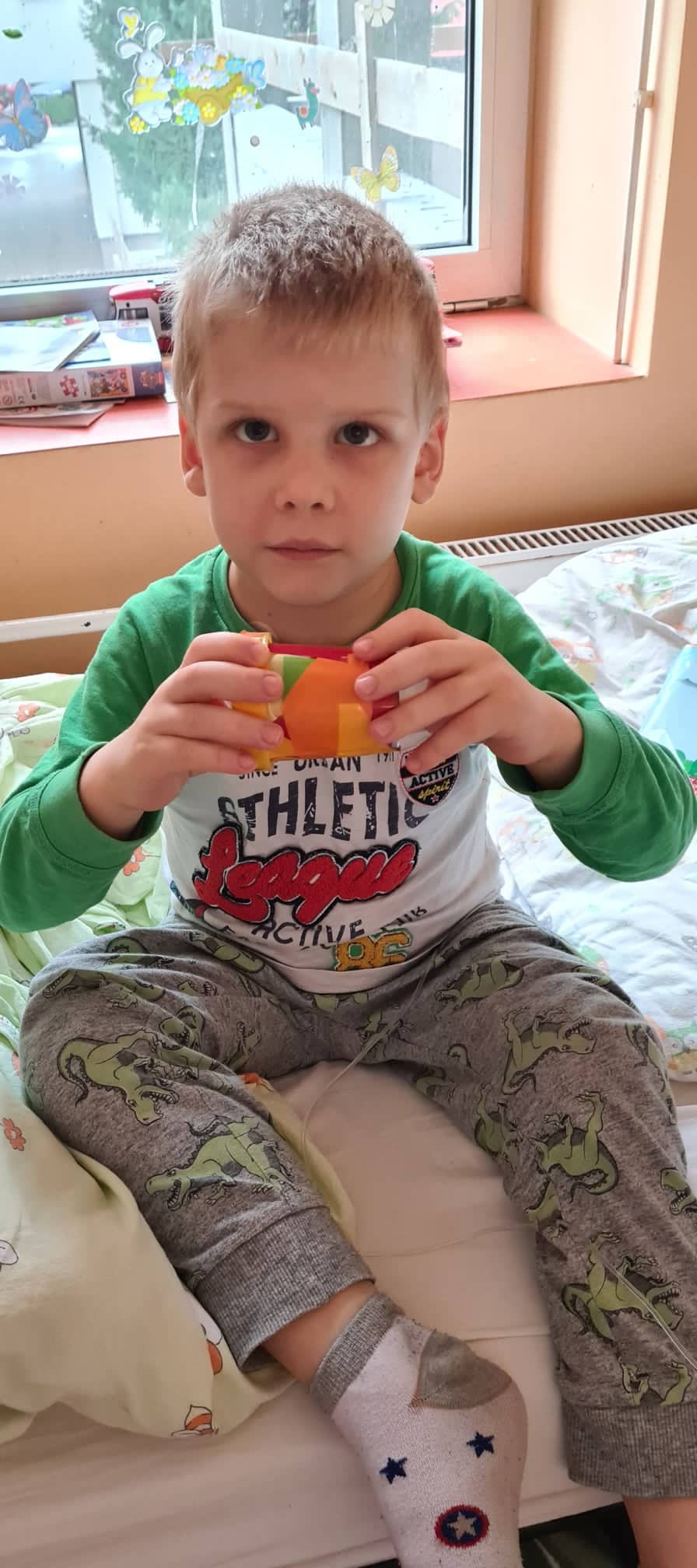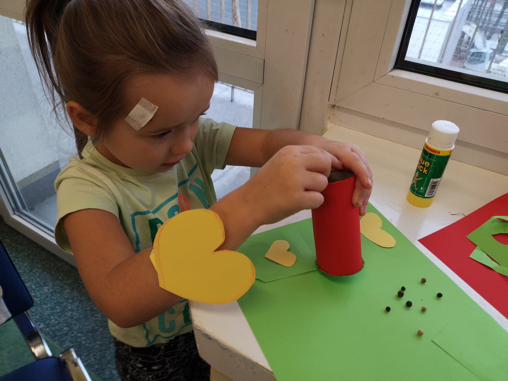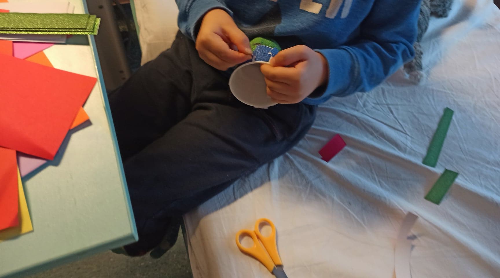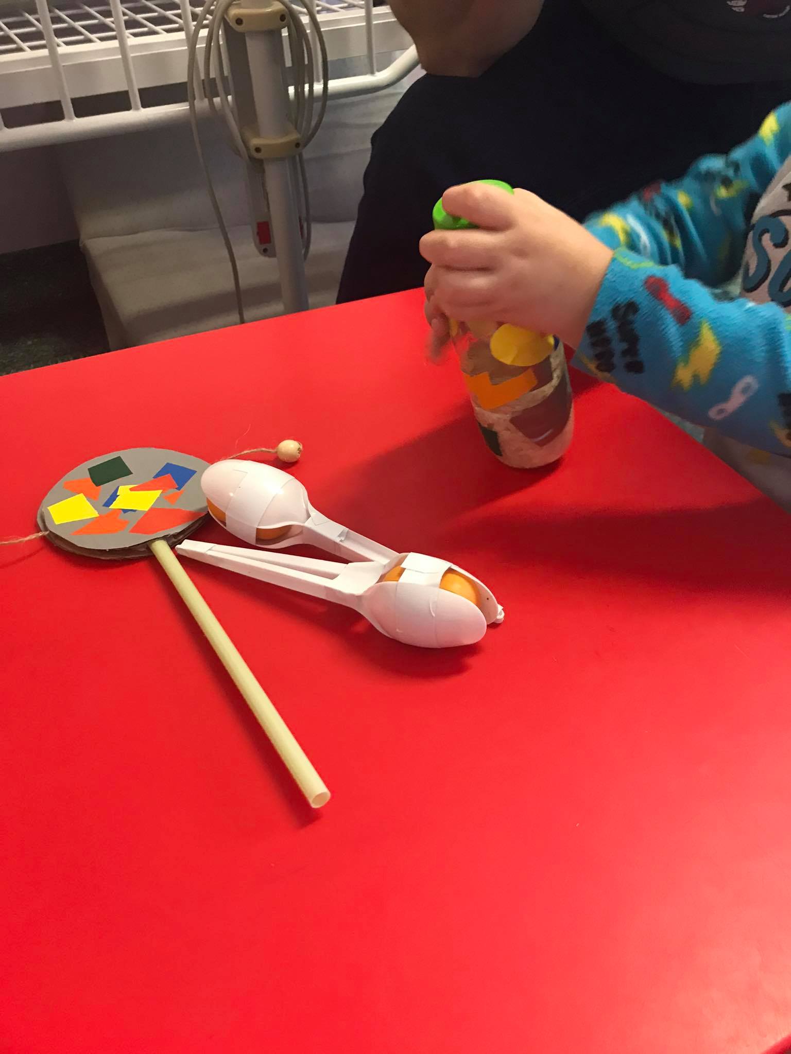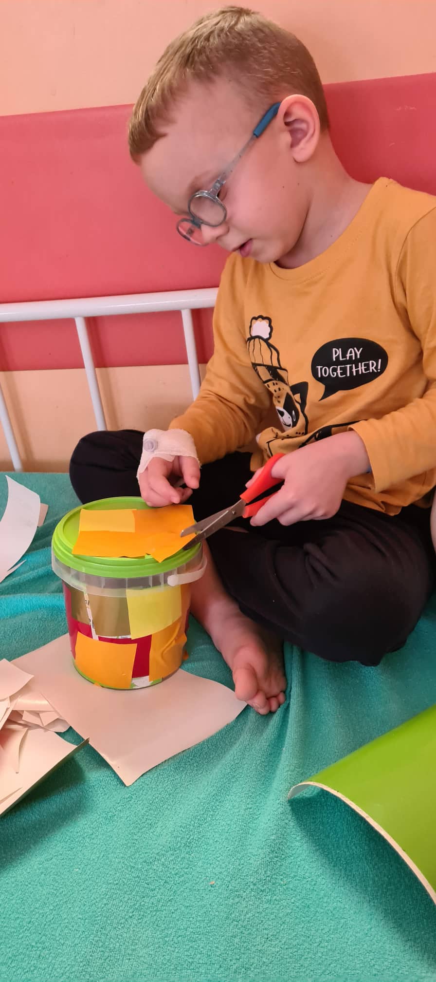 W ostatnim tygodniu, w nowej formule covidowej, czyli przy łóżkach dzieci na różnych oddziałach, odbyły się zajęcia z cyklu ” Coś z niczego”. W tym roku zdecydowałyśmy się na tematykę muzyczną i nadałyśmy im tytuł „Bębnimy i gramy na wszystkim co mamy”. Wykorzystując różne materiały recyklingowe: butelki, tekturowe rolki, plastikowe pojemniki, kapsle, nakrętki, nasiona wykonaliśmy kolekcję instrumentów perkusyjnych i strunowych :grzechotki , kastaniety, bębenki, kołatki, gitary. Instrumenty dekorowaliśmy papierem samoprzylepnym,naklejkami, rysunkami. Następnie próbowaliśmy jak działają, powtarzając rytmy grając cicho i głośno, szybko i wolno. Uczyliśmy się również reagować na znaki dyrygenta. Zabawę zakończyliśmy odgadując zagadki muzyczne.
