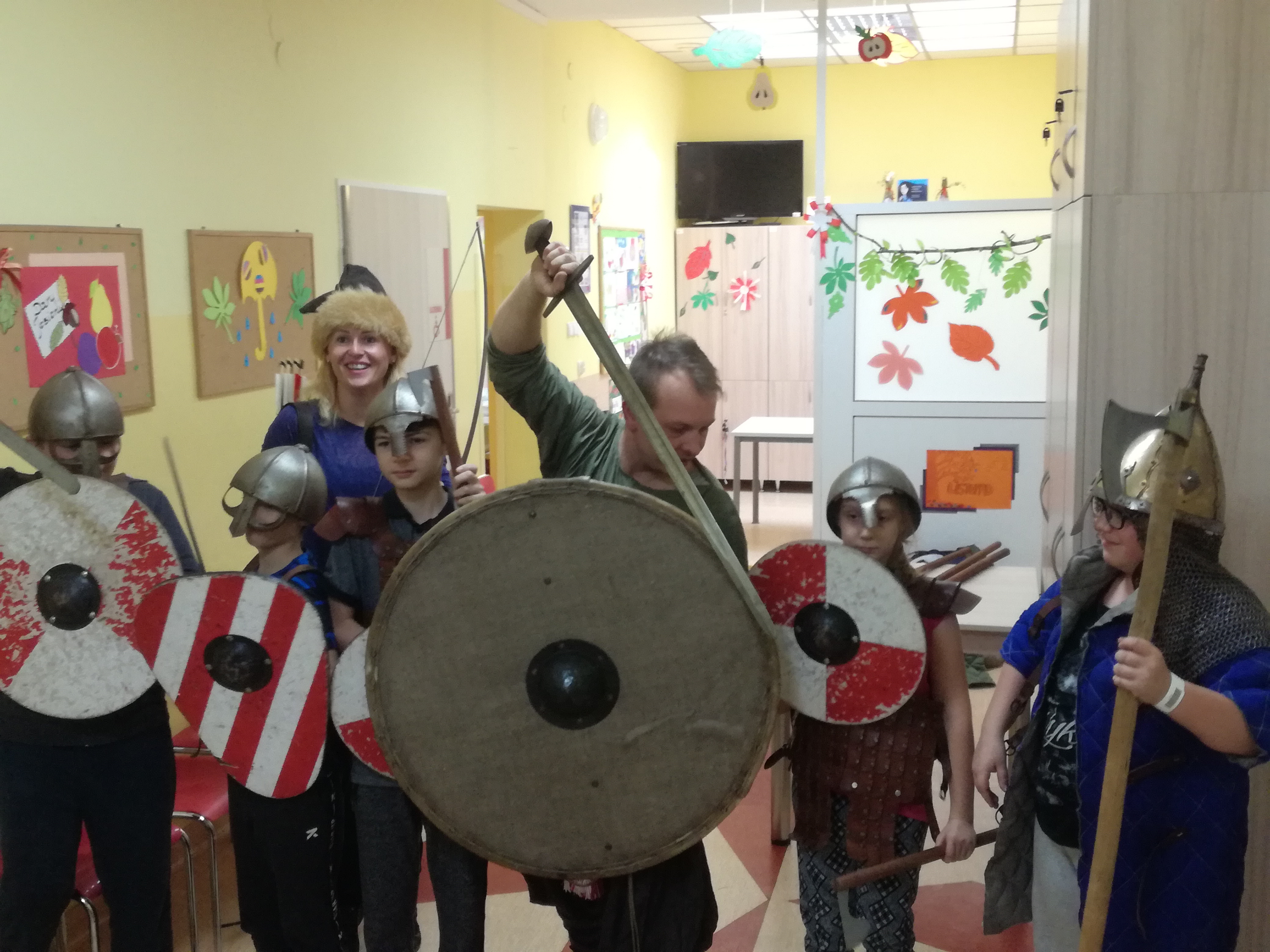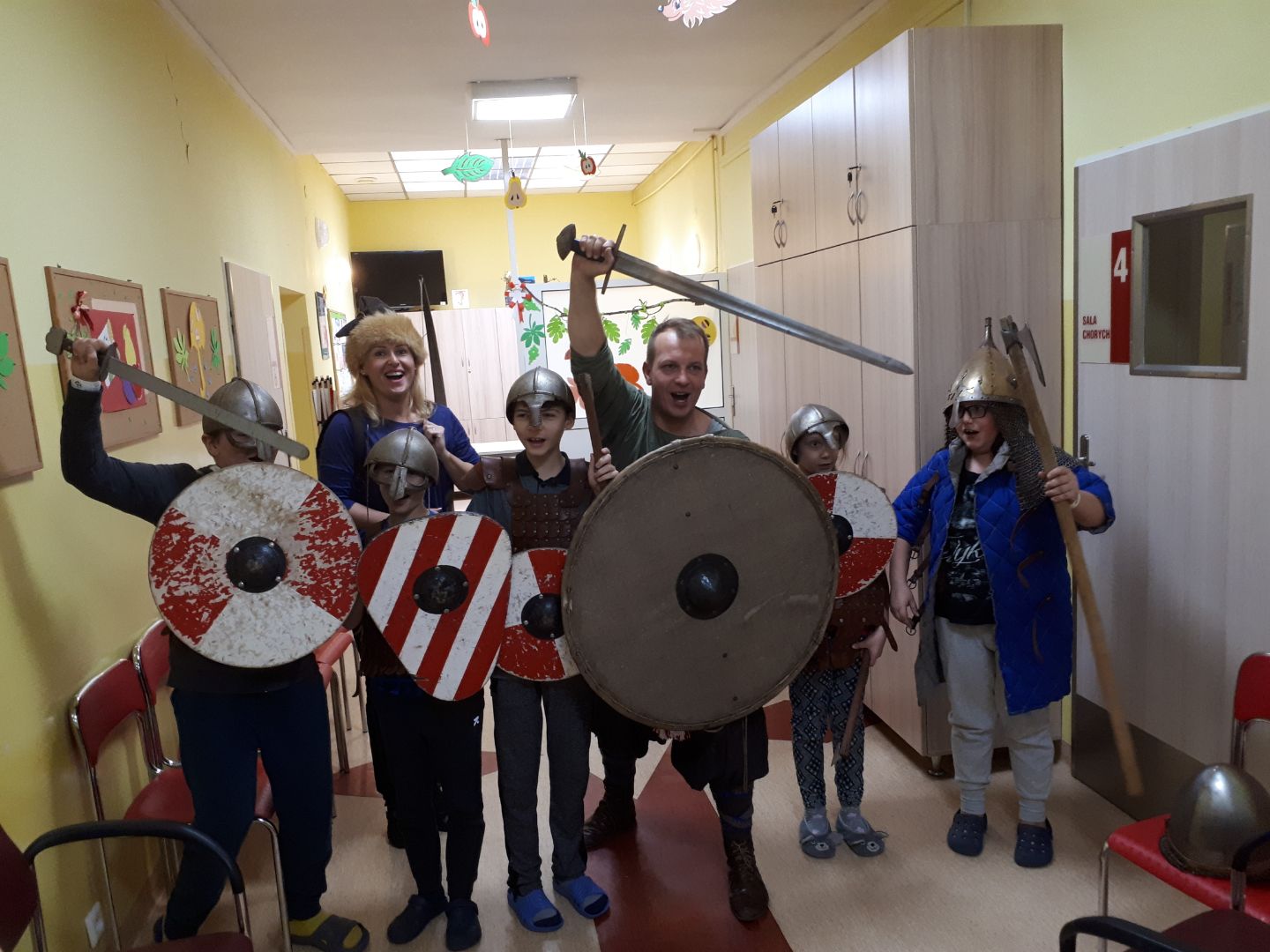 W naszej szkole gościliśmy pana Bartosza Styszyńskiego, założyciela „Grodu Pobiedziska”, który opowiedział o historycznym Szlaku Piastowskim i drewnianej fortecy z okresu wczesnego średniowiecza. Dowiedzieliśmy się, w jaki sposób zdobywano średniowieczne twierdze. Gość zapoznał dzieci z takimi machinami oblężniczymi, jak: trebusz, onager, wineja, pluteja, a także omówił przywiezione ze sobą eksponaty z czasów rycerzy. Każdy uczestnik spotkania mógł przymierzyć strój wojownika i przenieść się w czasy średniowiecza.