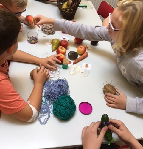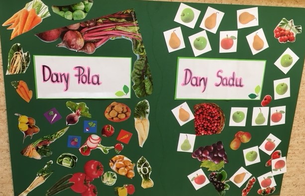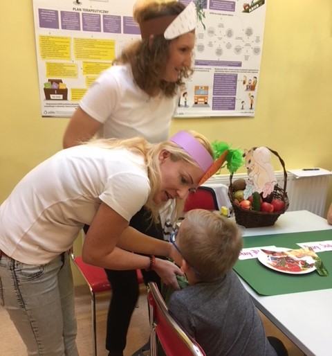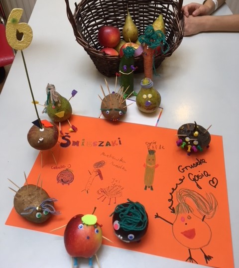 17 października na jednym z oddziałów odbyły się zajęcia pt.: „Dary jesieni”. Na początku zajęć wszyscy pacjenci wysłuchali muzyki Antonio Vivaldiego „Cztery pory roku – Jesień”. W jesiennych nastrojach wspólnie z dziećmi rozmawialiśmy na temat darów jesieni. Dzieci rozpoznawały warzywa i owoce przy pomocy zmysłu dotyku w trakcie zabawy pt.: „Zaczarowany worek”, nazywały i mówiły jaki mają kolor , w języku polskim i angielskim. Dzieci odpowiadały na pytania, jakie potrawy możemy zrobić z warzyw i owoców? Uczniowie wspólnie wykonały plakat dotyczący darów sadu i pola. Ostatnią aktywnością było wykonanie kukiełek z warzyw i owoców i wystawa pt.: „Śmieszaki”.