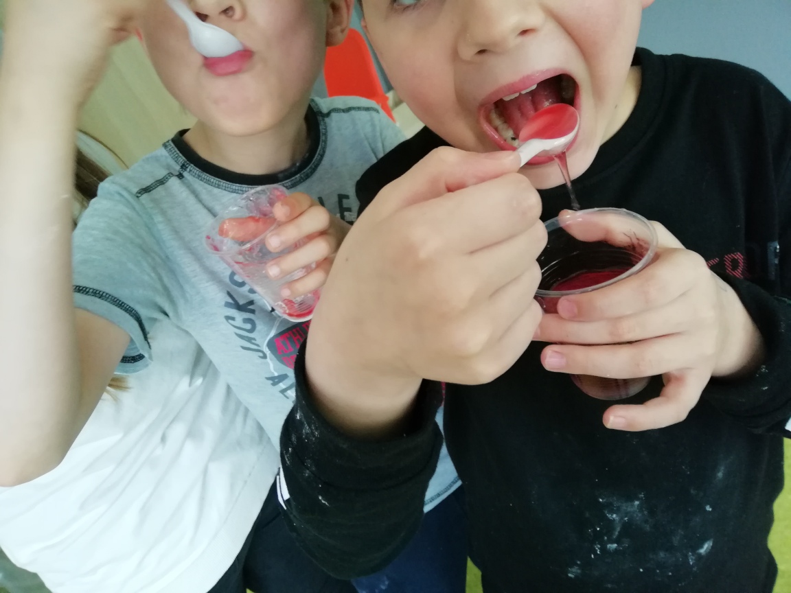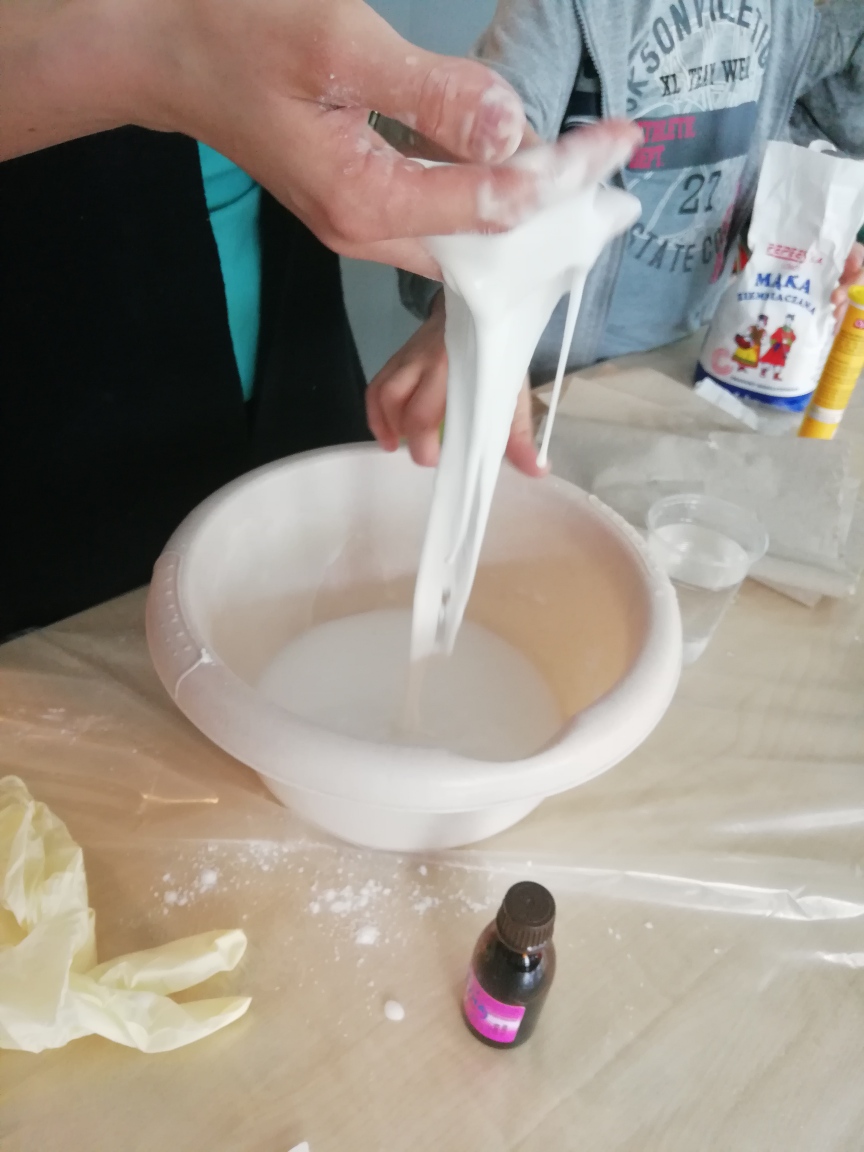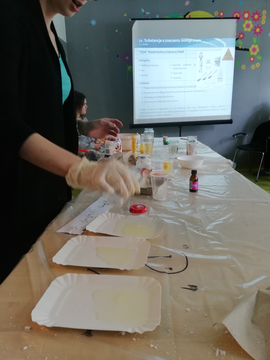 Okazało się, że wiele ciekawych doświadczeń chemicznych można wykonać wykorzystując podstawowe produkty domowego użytku, takie jak: ocet, jodyna, ziemniaki, jajka, mąka ziemniaczana czy woda utleniona. Zbadaliśmy właściwości białek, cukrów i tłuszczy. Nauczyliśmy się robić ciecz nienewtonowską i prawdziwy, smaczny kisiel. CHEMIA JEST SUPER!!! Dziękujemy p. Marii Bońkowskiej z Wydziału Chemii UAM.