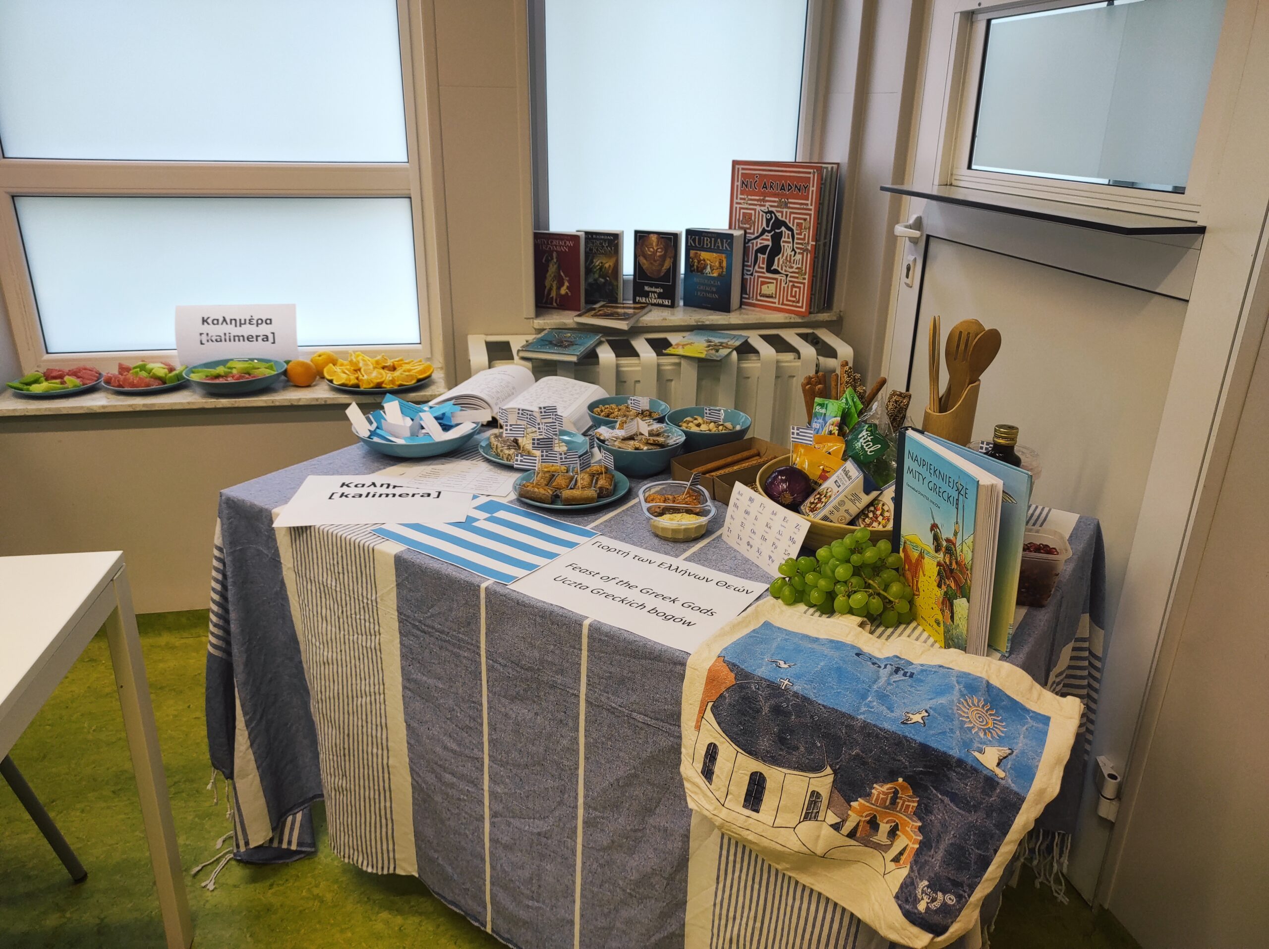 Poznawaliśmy tajniki języka greckiego, jej historii, geografii, kuchni i nie tylko! Był czas na sprawdzenie swojej wiedzy o Grecji, wspólne gotowanie, muzykę, taniec i śpiew. Po zajęciach uczniowie wspólnie przygotowali grecką sałatkę i degustowali przysmaki charakterystyczne dla tego słonecznego państwa. Zajęcia zakończyliśmy wspólnym tańcem syrtaki znanym jako Zorba.