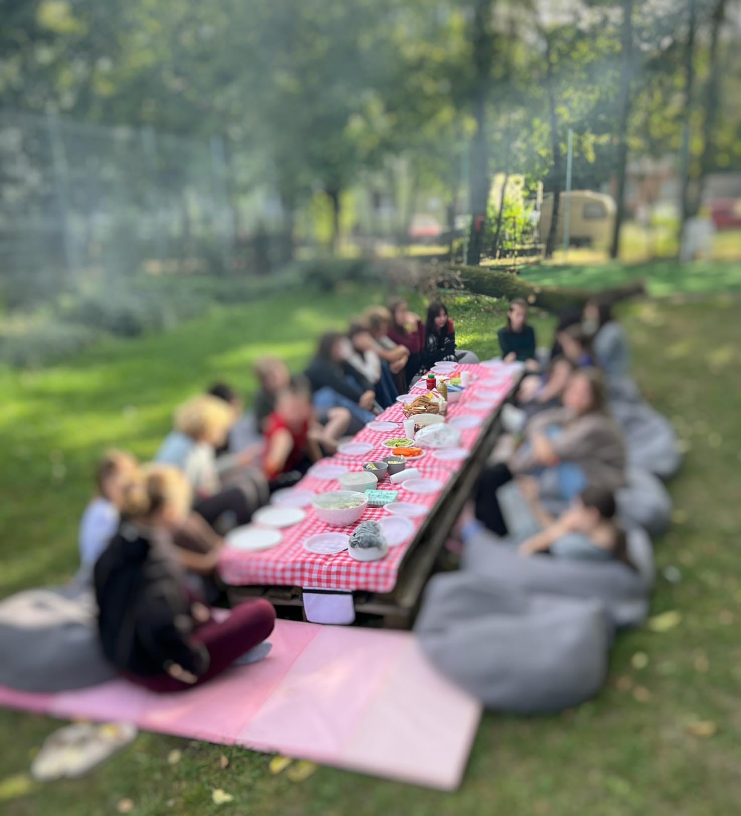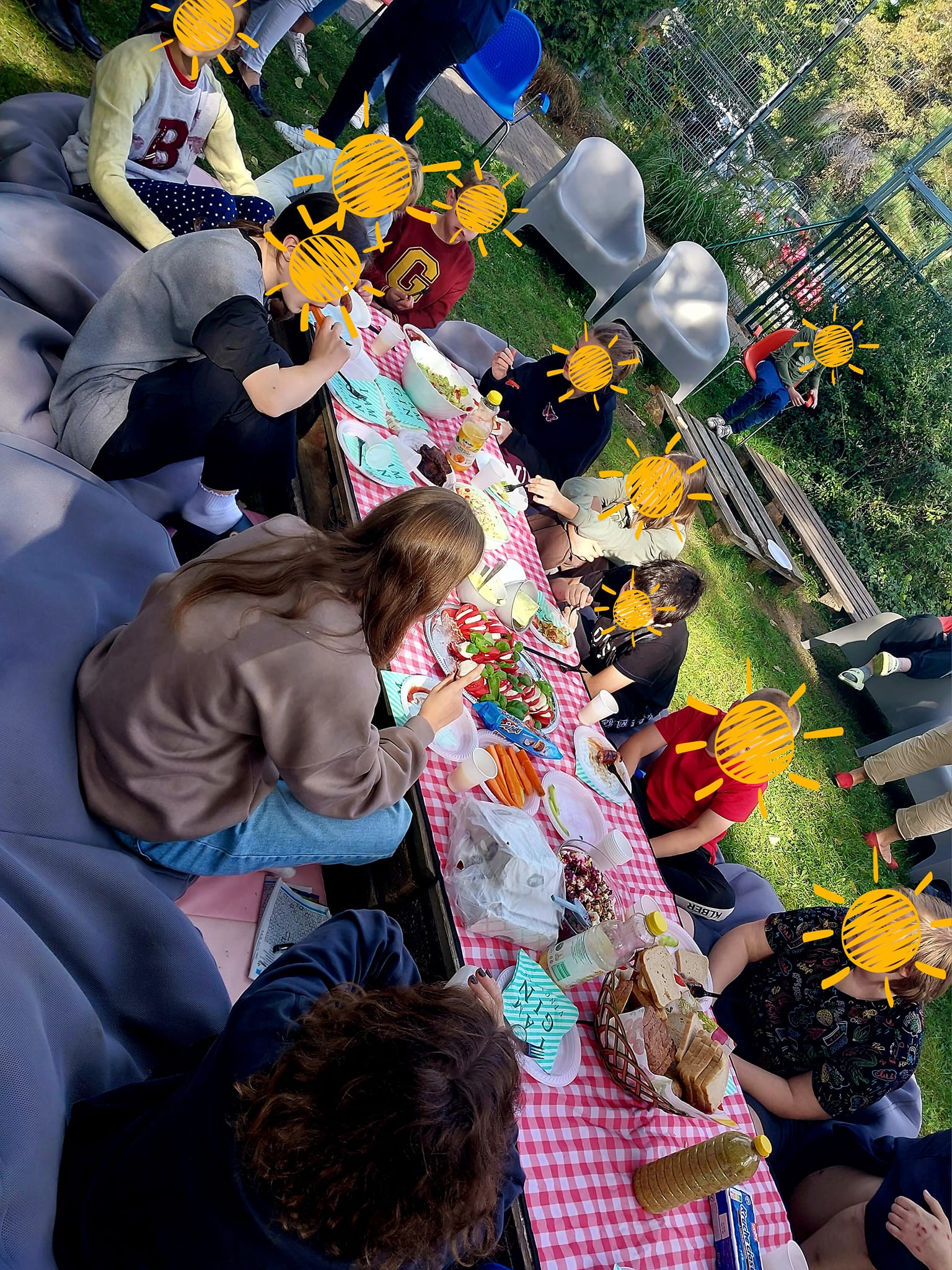 Nauczyciele wspólnie z lekarzami, psychologami i pielęgniarkami przygotowali dla dzieci sałatki, warzywka, kiełbaski, karkówkę i ciasto, aby wspólnie spędzić miło czas, porozmawiać, poznać się lepiej i pożegnać lato na rok. Było wesoło i bardzo smacznie!