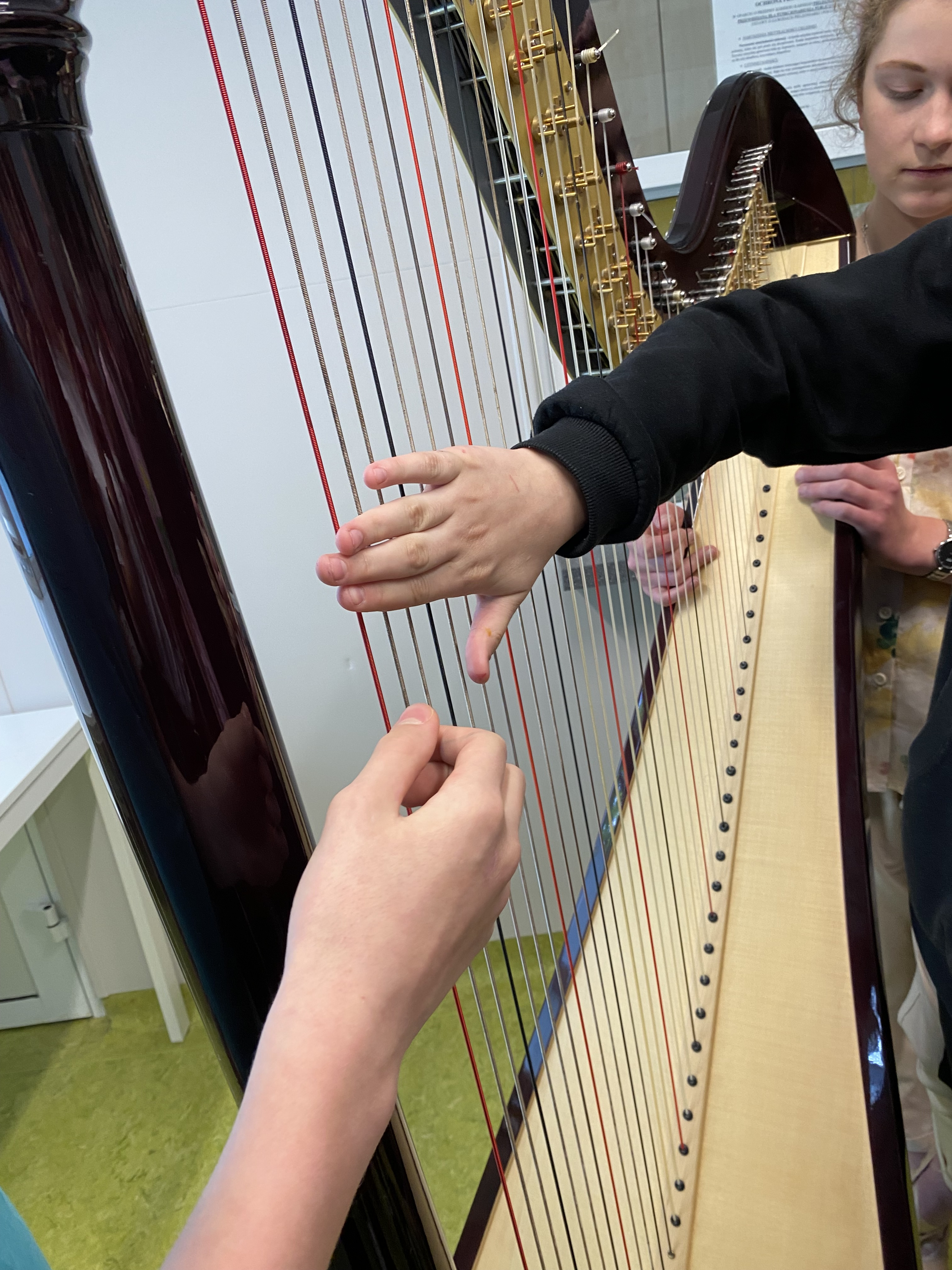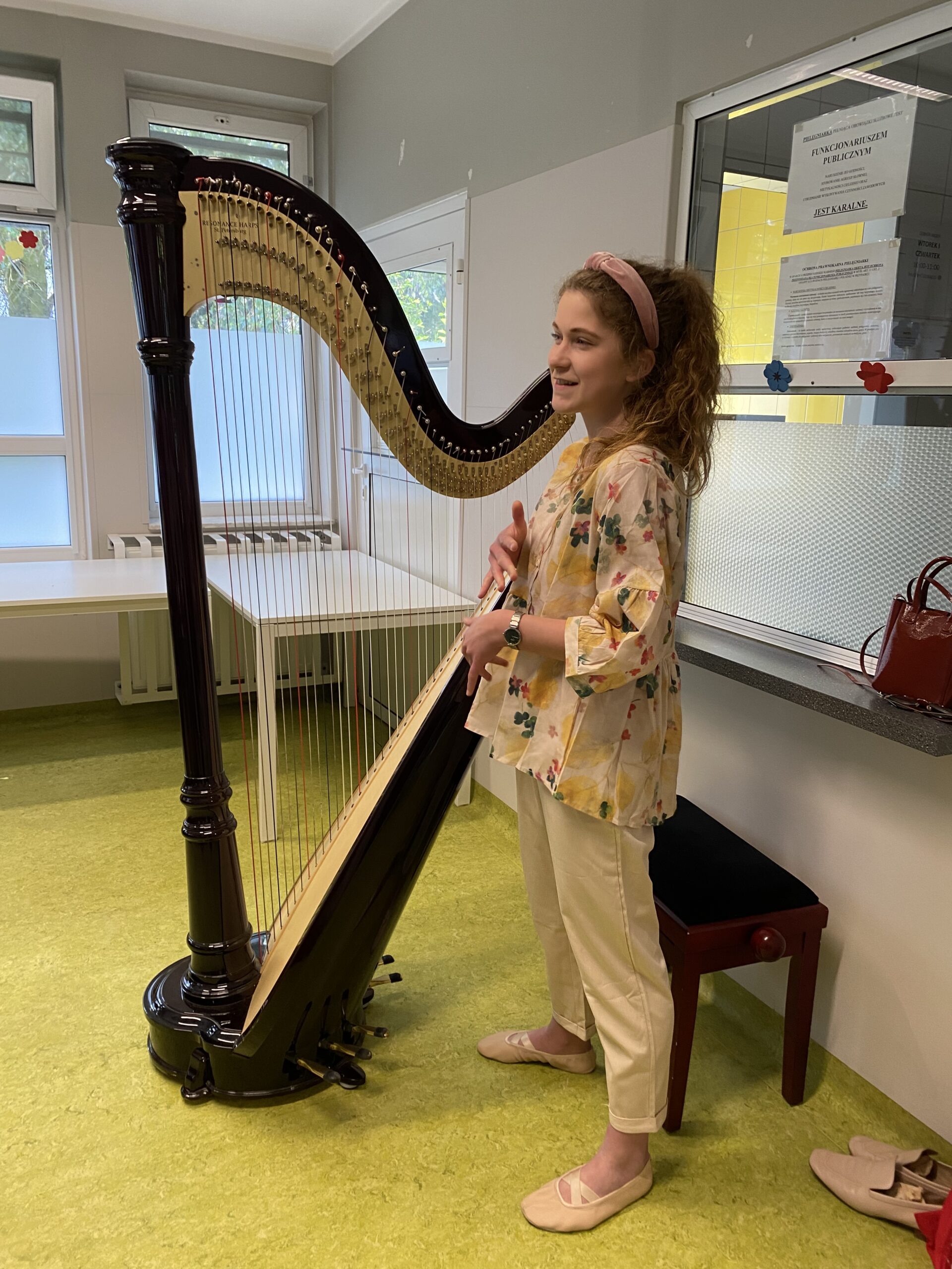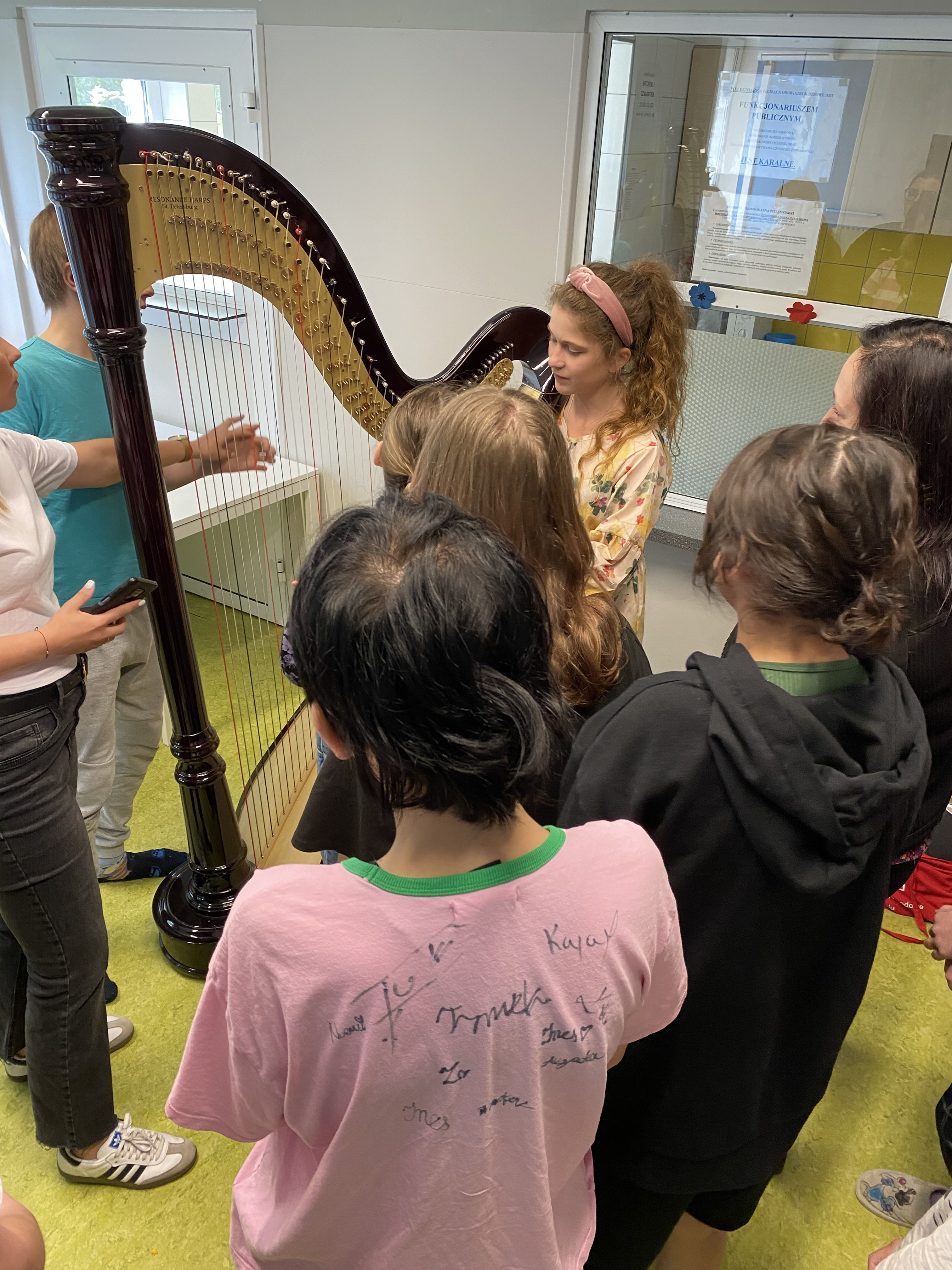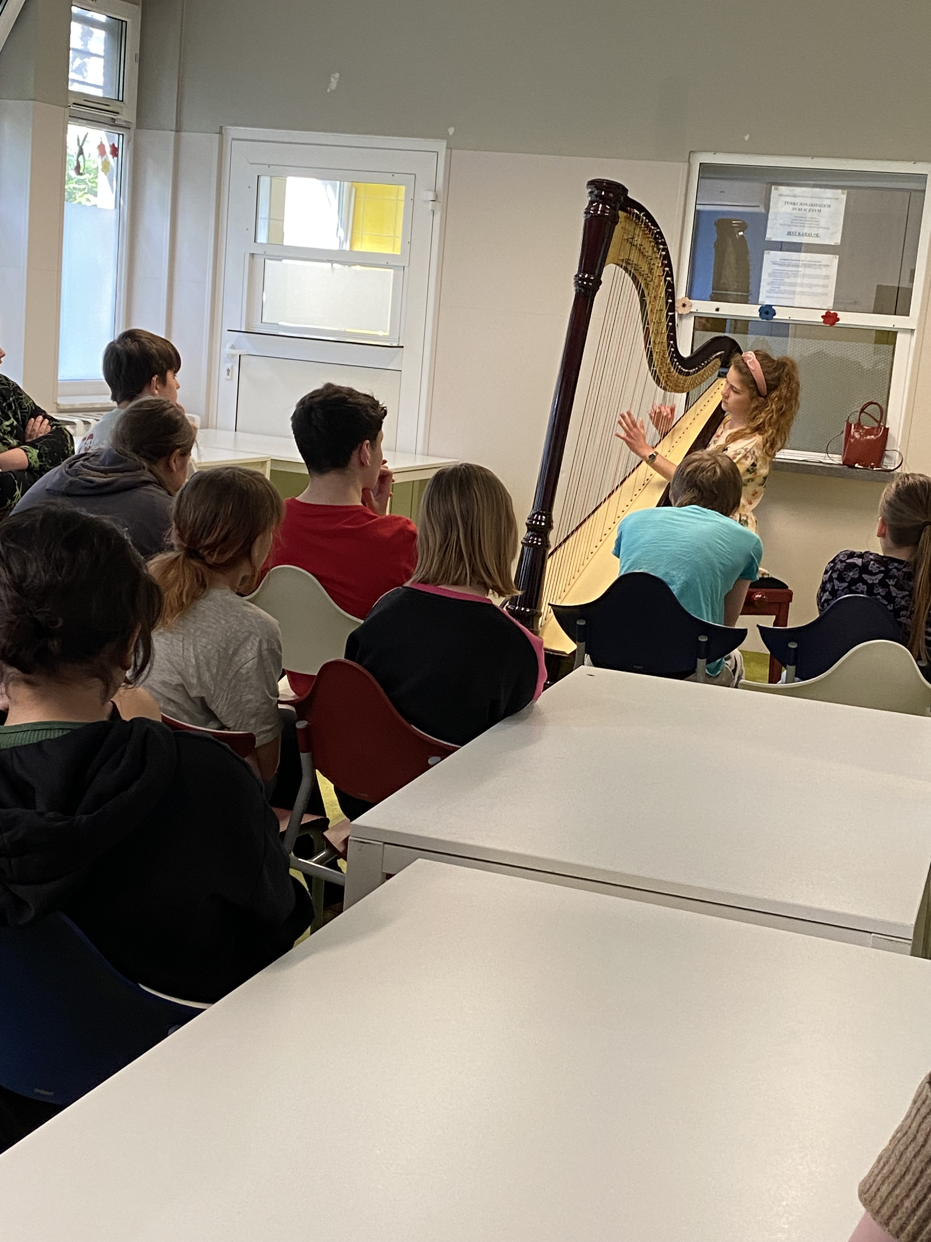Rozalia Dmochowska – harfistka i poetka zagrała repertuar, który poruszył całą publiczność. Wszyscy byli oczarowani magiczną atmosferą, jaką stworzyła podczas koncertu młoda artystka. Na zakończenie uczniowie mieli możliwość zagrania na harfie.