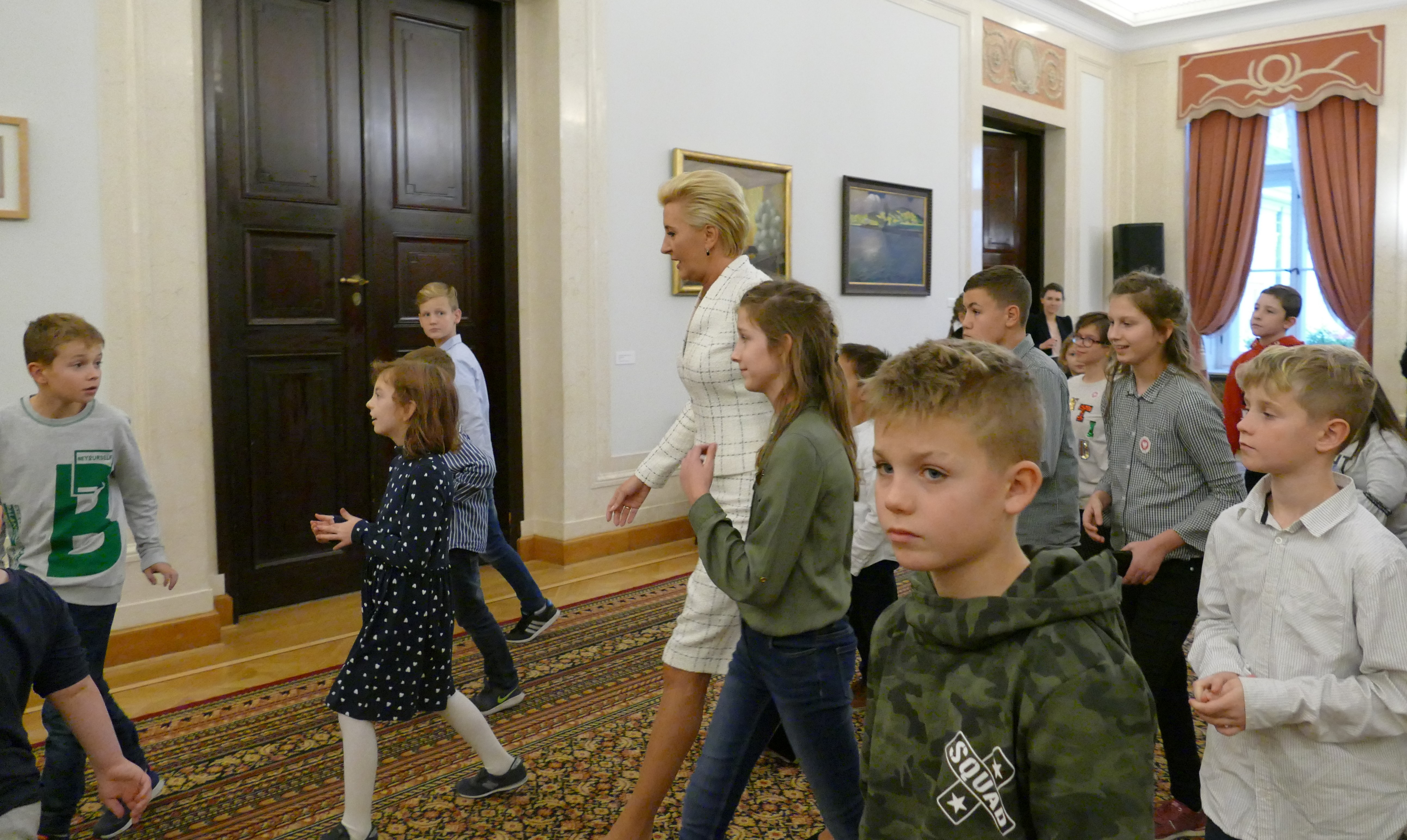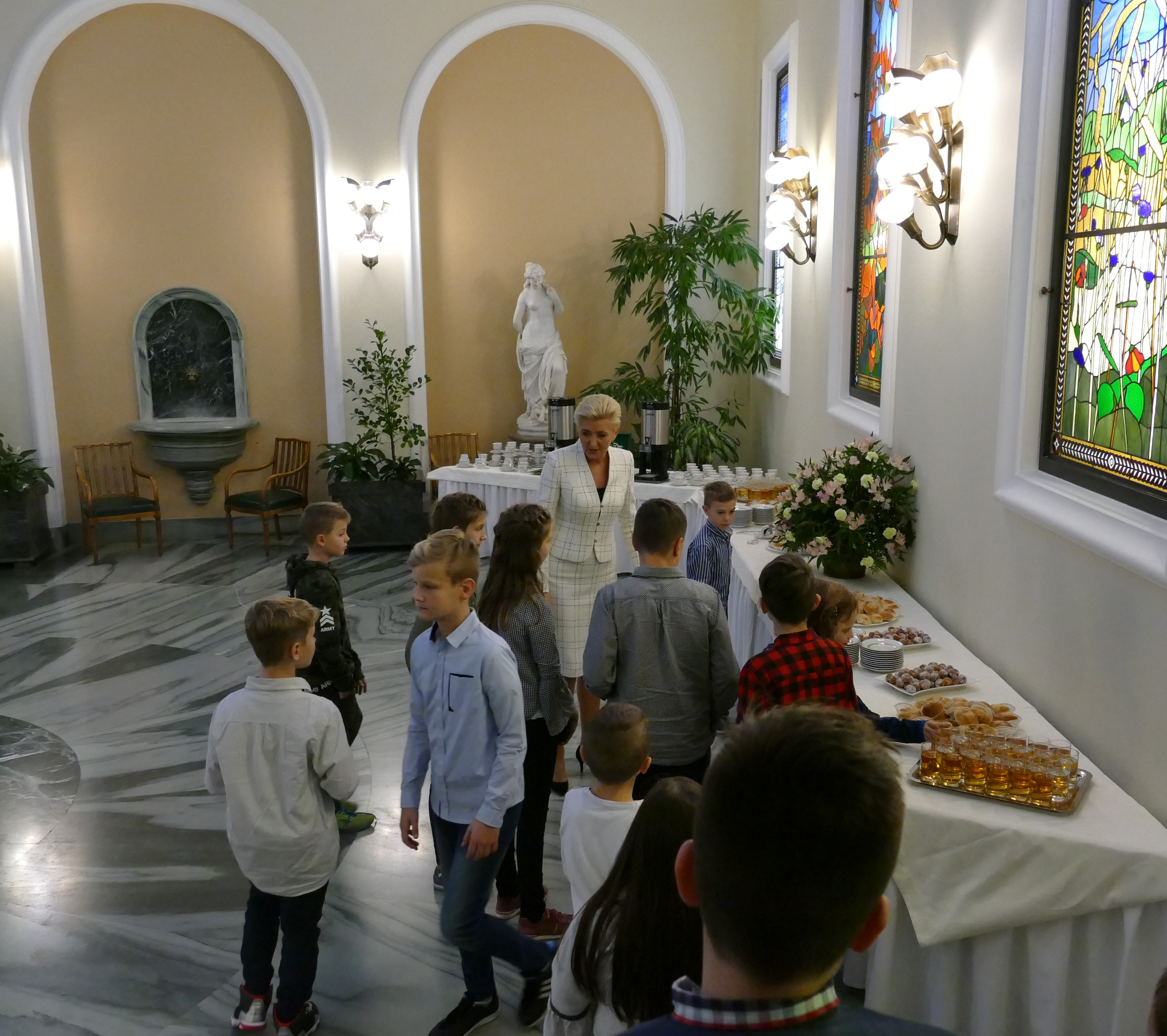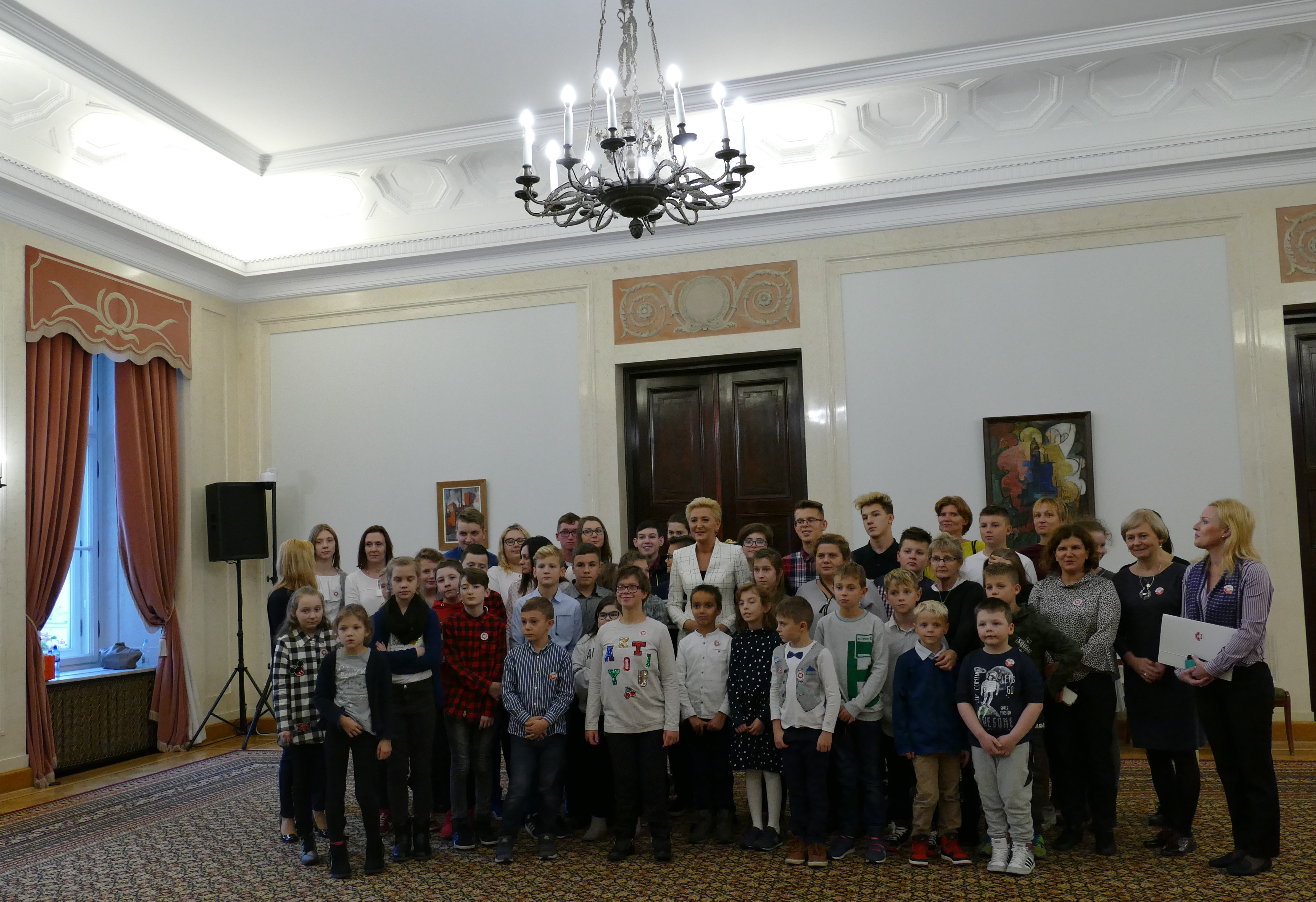 … I od razu do Pałacu Prezydenckiego. 13 listopada, tuż po wyjątkowych obchodach 100-lecia Odzyskania przez Polskę Niepodległości, grupa dzieci, po zakończonym leczeniu szpitalnym, wspólnie z rodzeństwem wybrała się do Warszawy. Stolica przywitała nas słońcem. Król Zygmunt z kolumny przyglądał się dzieciom podziwiającym Zamek Królewski, a Warszawska Syrenka chętnie „pozowała” do zdjęć. Spacer po Starówce był tylko wstępem do najważniejszego wydarzenia tego dnia. O 13.00 stawiliśmy przy Biurze Przepustek Pałacu Prezydenckiego. Wszyscy z napięciem poddali się kontroli dokumentów i drzwi do sal pałacowych stanęły przed nami otworem. Pani przewodnik Bożena Opioła w ciekawy sposób opowiadała o historii Pałacu Prezydenckiego i przeznaczeniu poszczególnych sal. Ogromne wrażenie zrobił na nas Okrągły Stół oraz kopia Konstytucji 3 Maja. O godzinie 14.00 przywitała nas Pani Prezydentowa Agata Kornhauser-Duda. Pierwsza Dama zauroczyła nas swoją naturalnością i ciepłem. Rozmawiała z dziećmi i rodzicami o trudach choroby, specyfice szkoły szpitalnej i zainteresowaniach. Zachęcała dzieci do czytania książek. Zwieńczeniem spotkania był poczęstunek i wspólne zdjęcia, często selfie. Z radością zaprosiliśmy Panią Prezydentową do naszej szkoły przy okazji jej wizyty w Poznaniu.