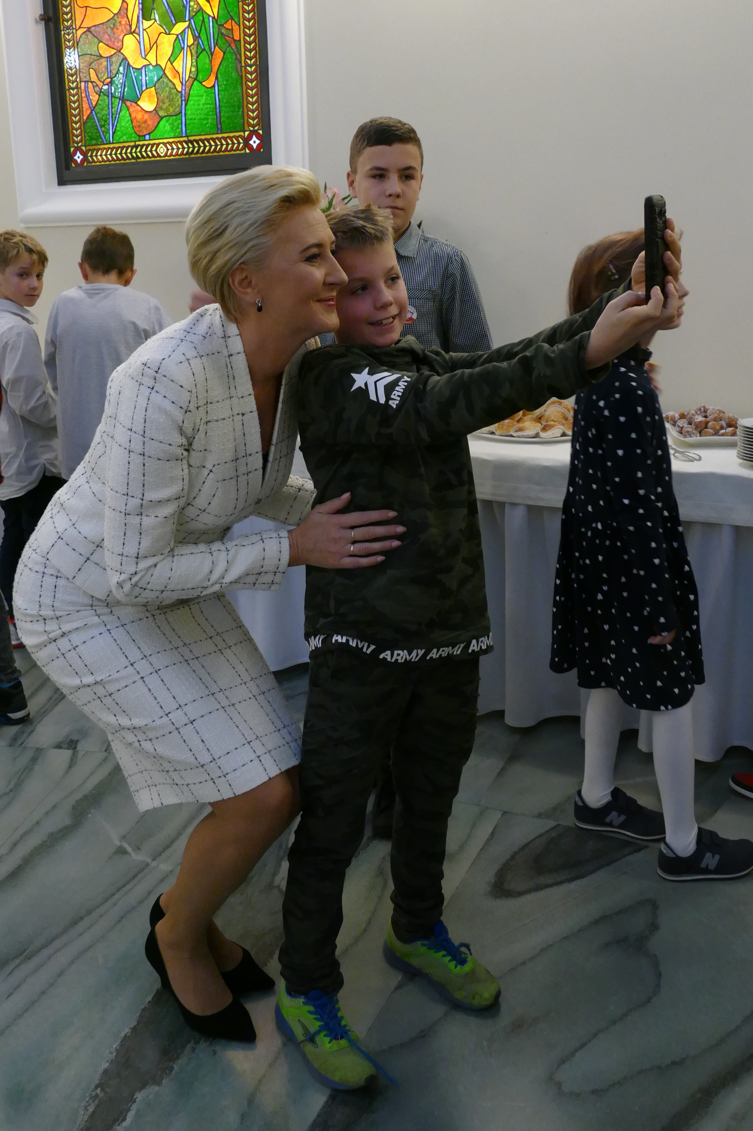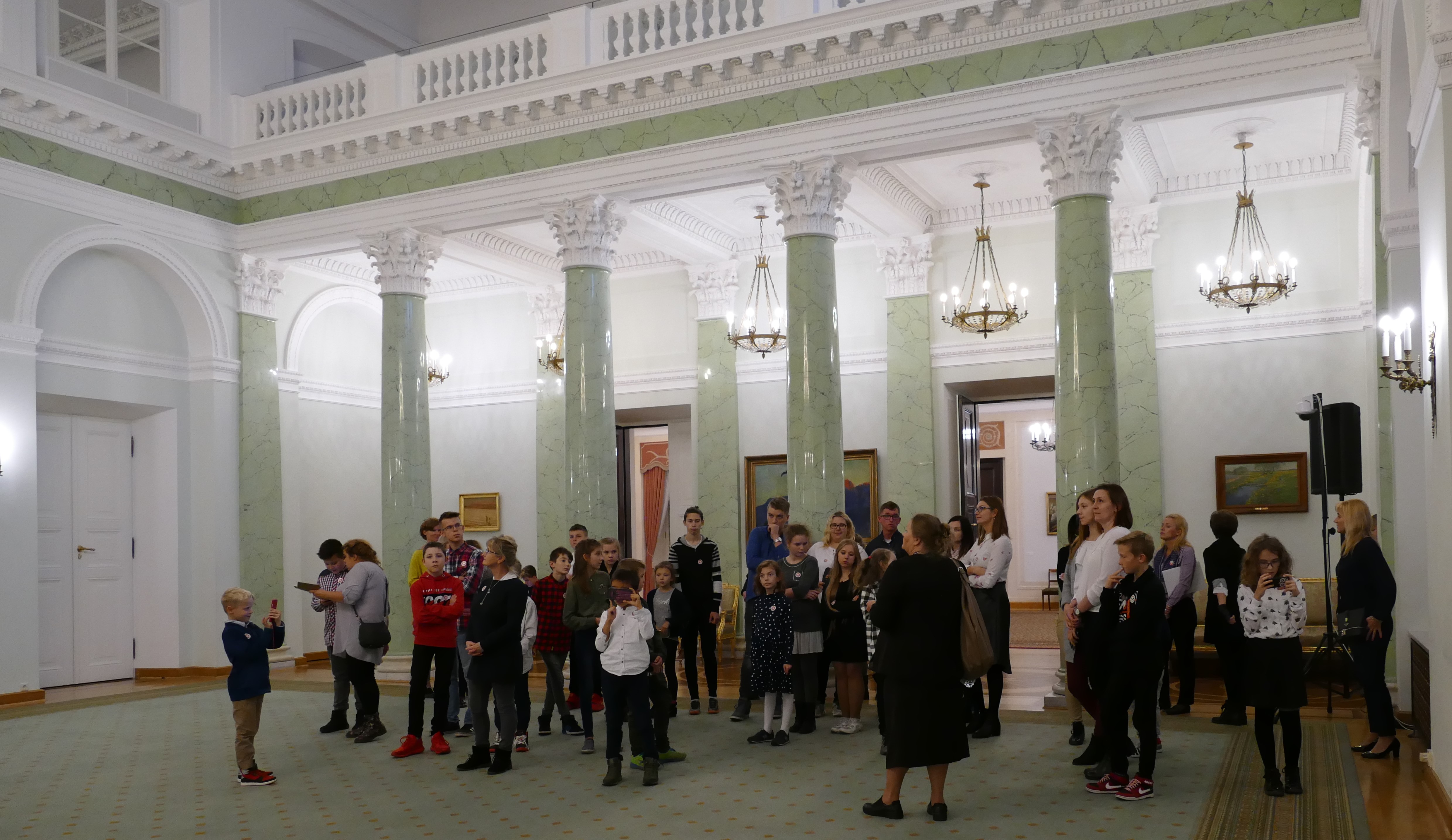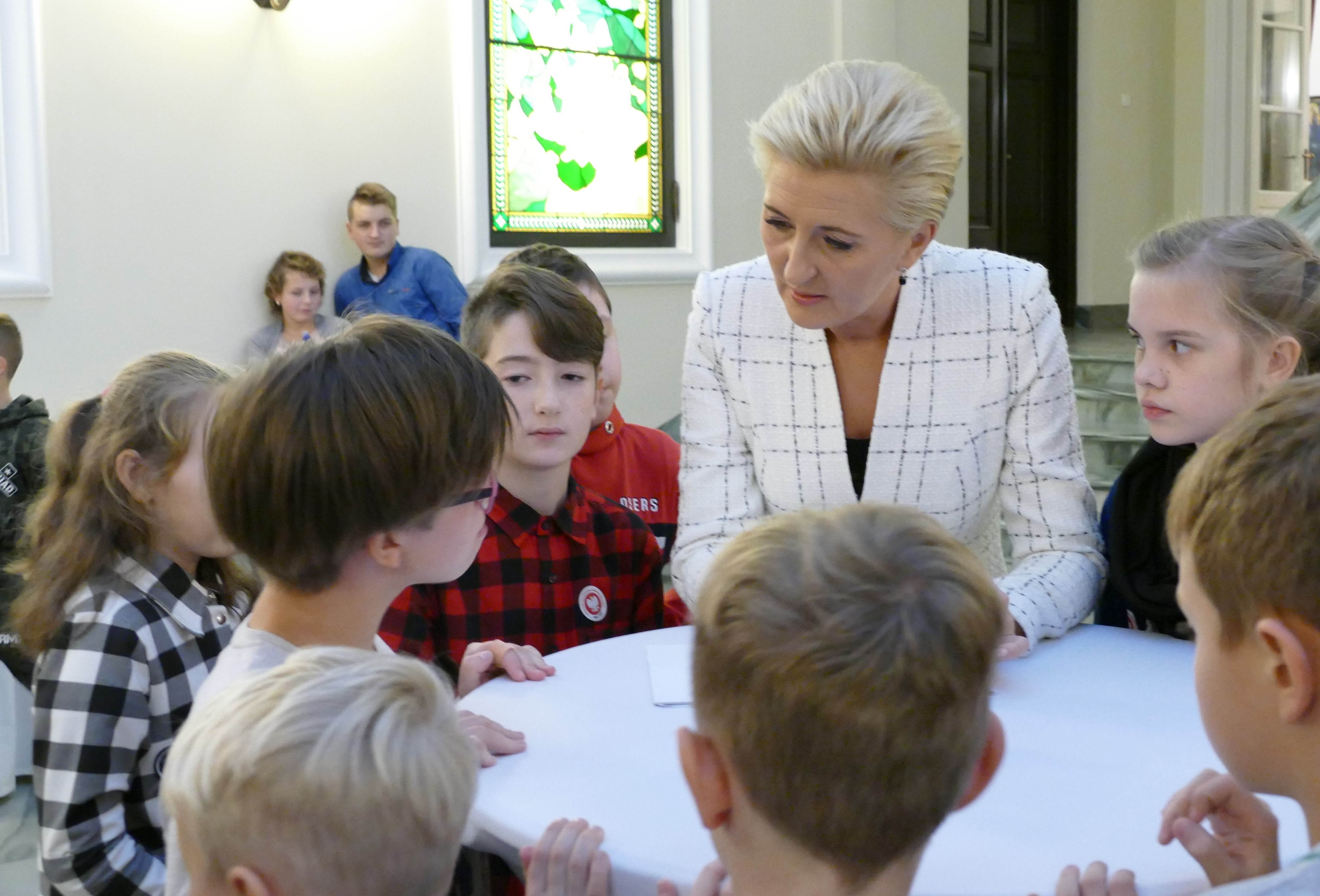 … I od razu do Pałacu Prezydenckiego. 13 listopada, tuż po wyjątkowych obchodach 100-lecia Odzyskania przez Polskę Niepodległości, grupa dzieci, po zakończonym leczeniu szpitalnym, wspólnie z rodzeństwem wybrała się do Warszawy. Stolica przywitała nas słońcem. Król Zygmunt z kolumny przyglądał się dzieciom podziwiającym Zamek Królewski, a Warszawska Syrenka chętnie „pozowała” do zdjęć. Spacer po Starówce był tylko wstępem do najważniejszego wydarzenia tego dnia. O 13.00 stawiliśmy przy Biurze Przepustek Pałacu Prezydenckiego. Wszyscy z napięciem poddali się kontroli dokumentów i drzwi do sal pałacowych stanęły przed nami otworem. Pani przewodnik Bożena Opioła w ciekawy sposób opowiadała o historii Pałacu Prezydenckiego i przeznaczeniu poszczególnych sal. Ogromne wrażenie zrobił na nas Okrągły Stół oraz kopia Konstytucji 3 Maja. O godzinie 14.00 przywitała nas Pani Prezydentowa Agata Kornhauser-Duda. Pierwsza Dama zauroczyła nas swoją naturalnością i ciepłem. Rozmawiała z dziećmi i rodzicami o trudach choroby, specyfice szkoły szpitalnej i zainteresowaniach. Zachęcała dzieci do czytania książek. Zwieńczeniem spotkania był poczęstunek i wspólne zdjęcia, często selfie. Z radością zaprosiliśmy Panią Prezydentową do naszej szkoły przy okazji jej wizyty w Poznaniu.