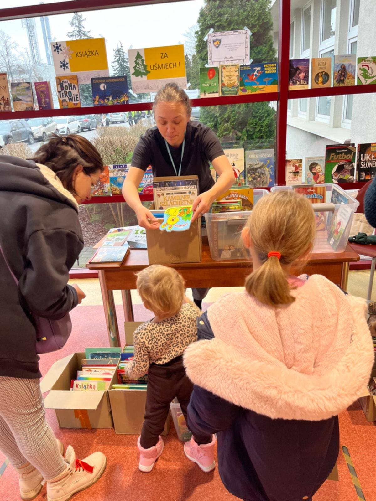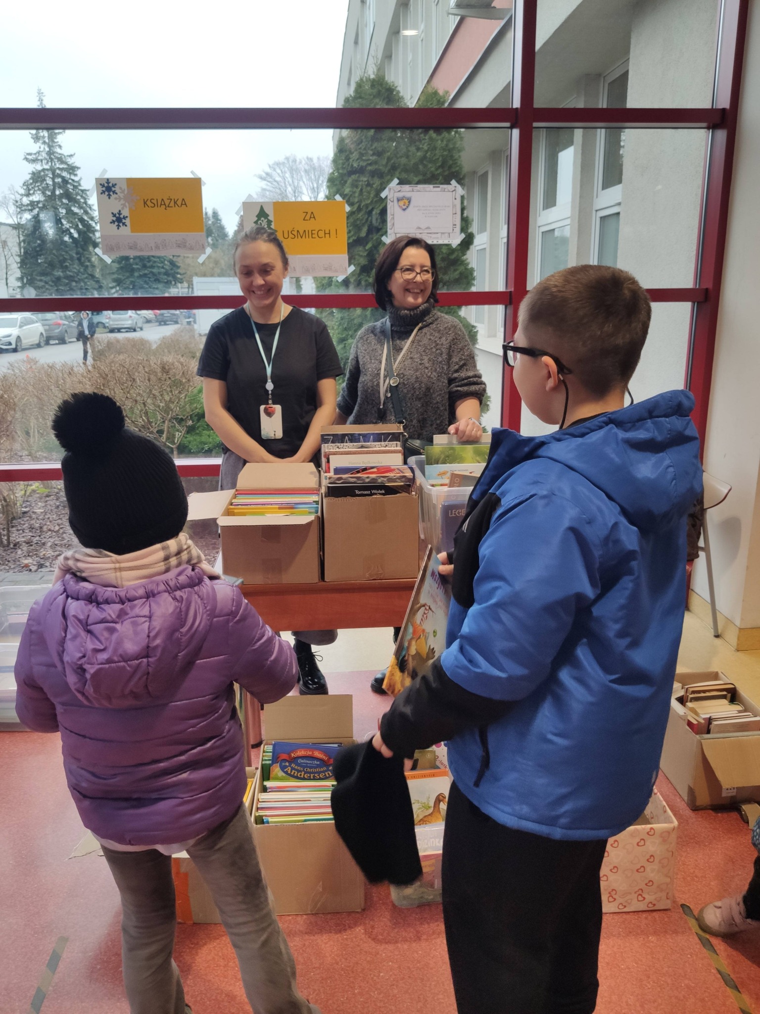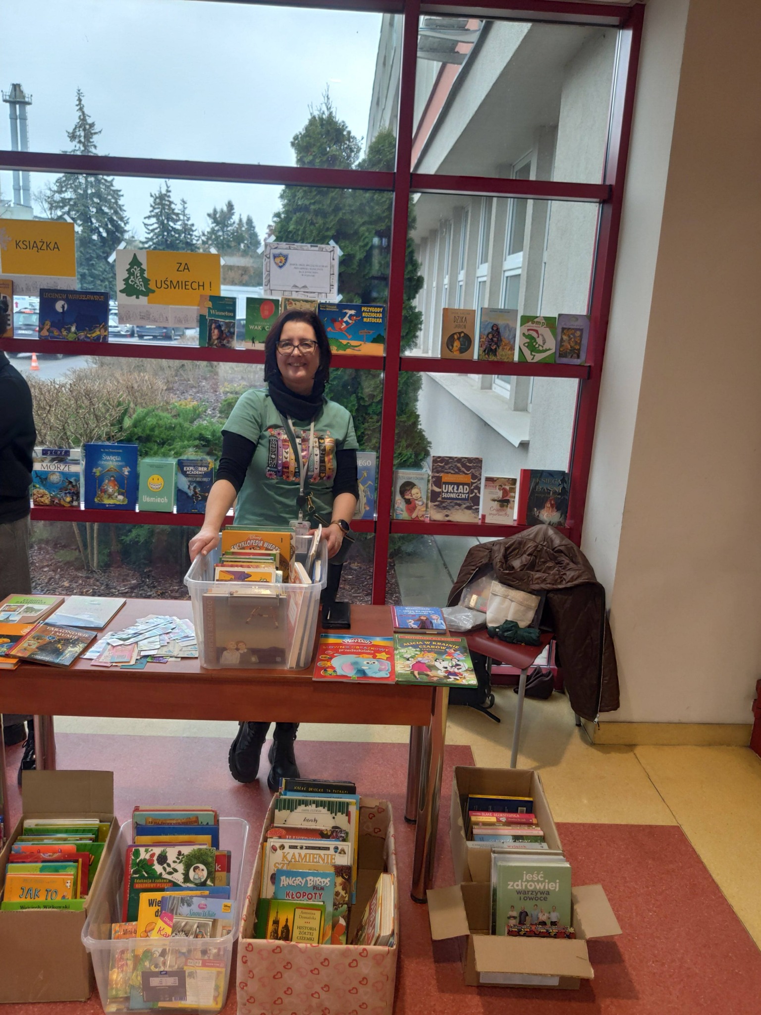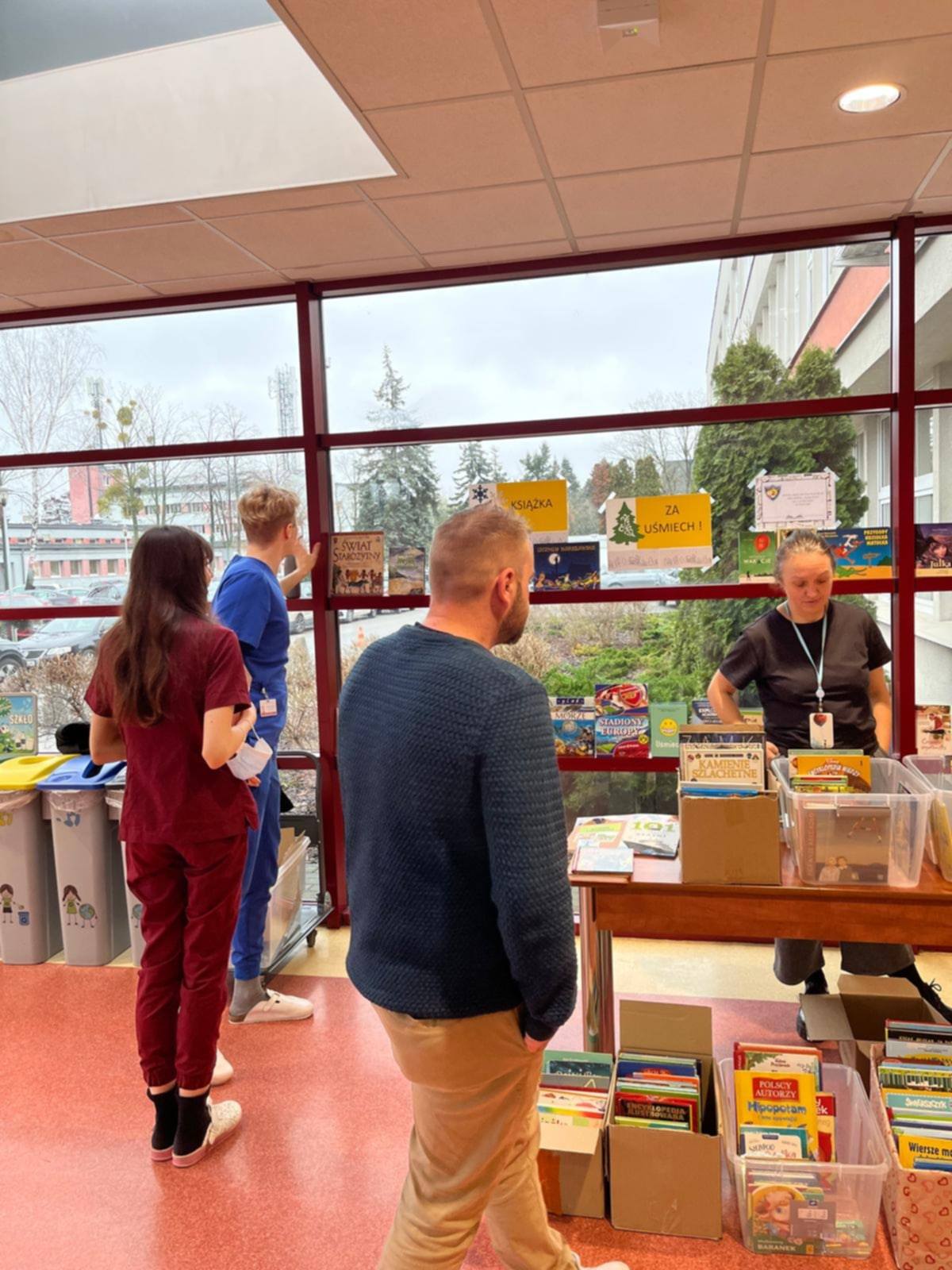 Zorganizowaliśmy więc kiermasz „Książka za uśmiech” poprzedzony zbiórką książek wśród nauczycieli i pracowników szkoły.  9 grudnia w holu szpitala zapanował miły książkowy rozgardiasz – dzieci, rodzice i personel szpitala przeglądali znajdujące się w pudłach i na wystawce książki, wspominali swoje przygody z lekturą, a na koniec z uśmiechem zabierali upatrzoną pozycję, oczywiście bezpłatnie. Dla dzieci była to świetna okazja, aby samodzielnie wybrać książkę, która stanie się ich najlepszym przyjacielem! Podziękowaniom i uśmiechom nie było końca, a wiele książek znalazło swoich nowych opiekunów.