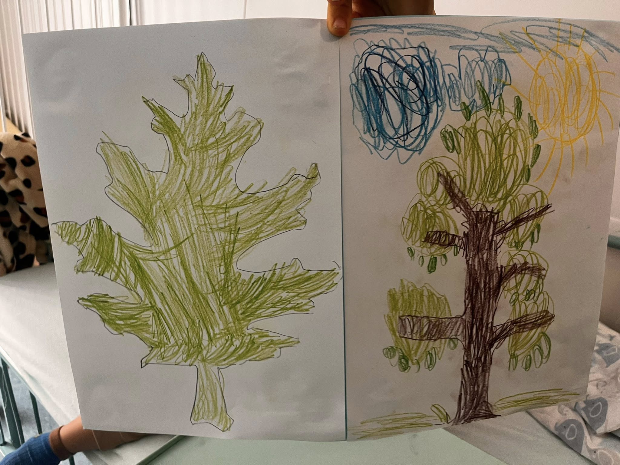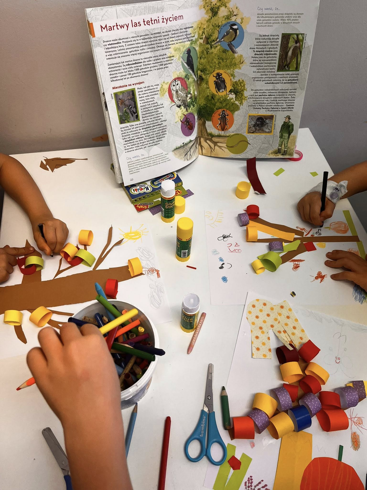 W trakcie zajęć przedszkolaki wysłuchały opowiadania o drzewach i ich roli w przyrodzie, brały udział w rozmowie na temat tego, jak możemy dbać o drzewa i środowisko oraz wspólnie wykonały prace plastyczne przedstawiające drzewa w różnych porach roku.