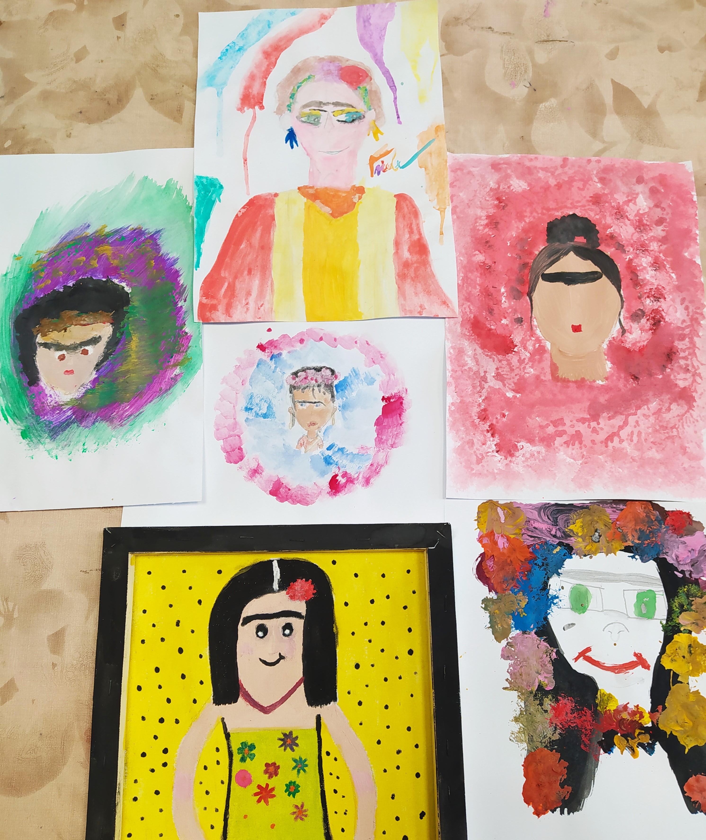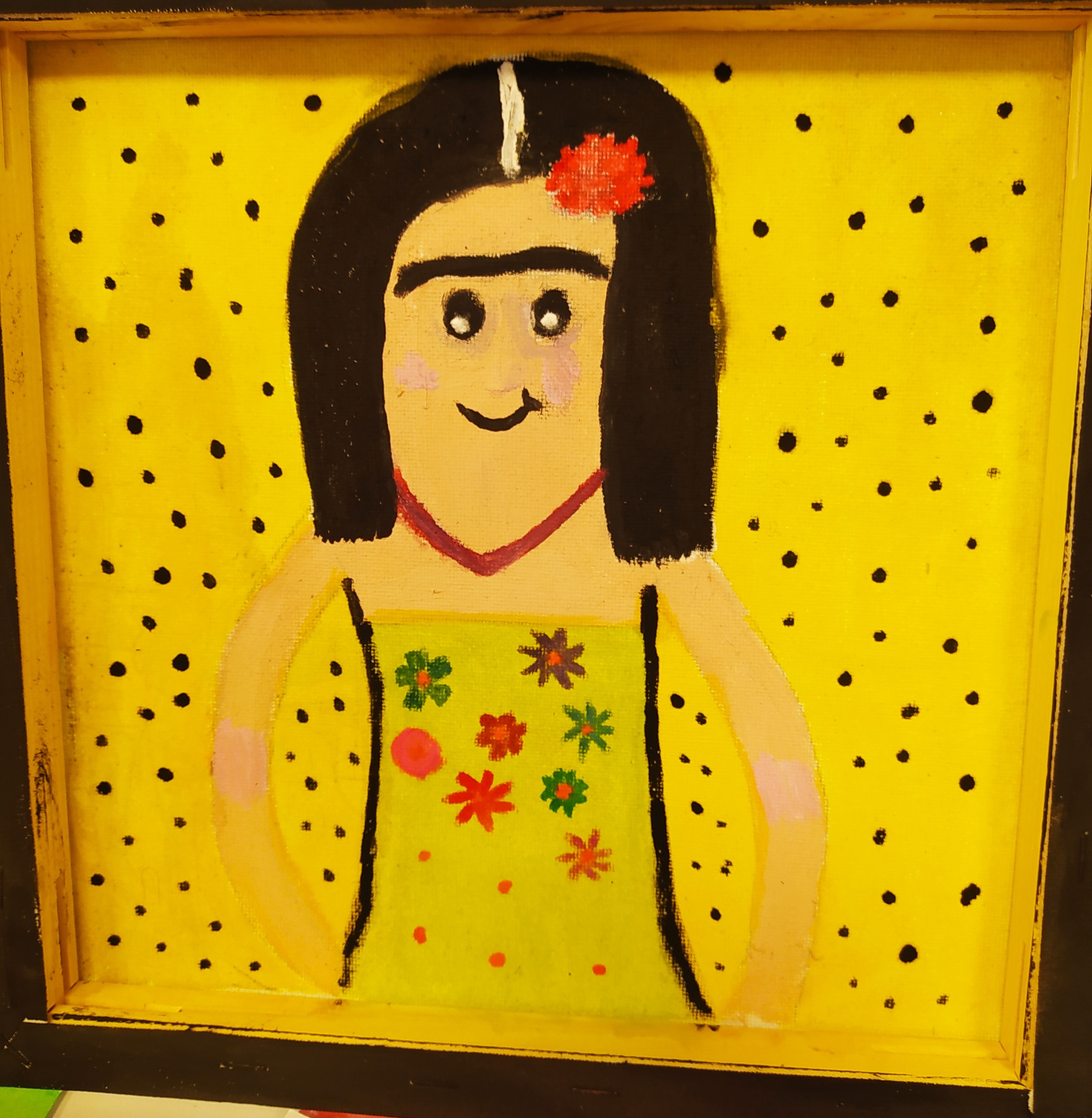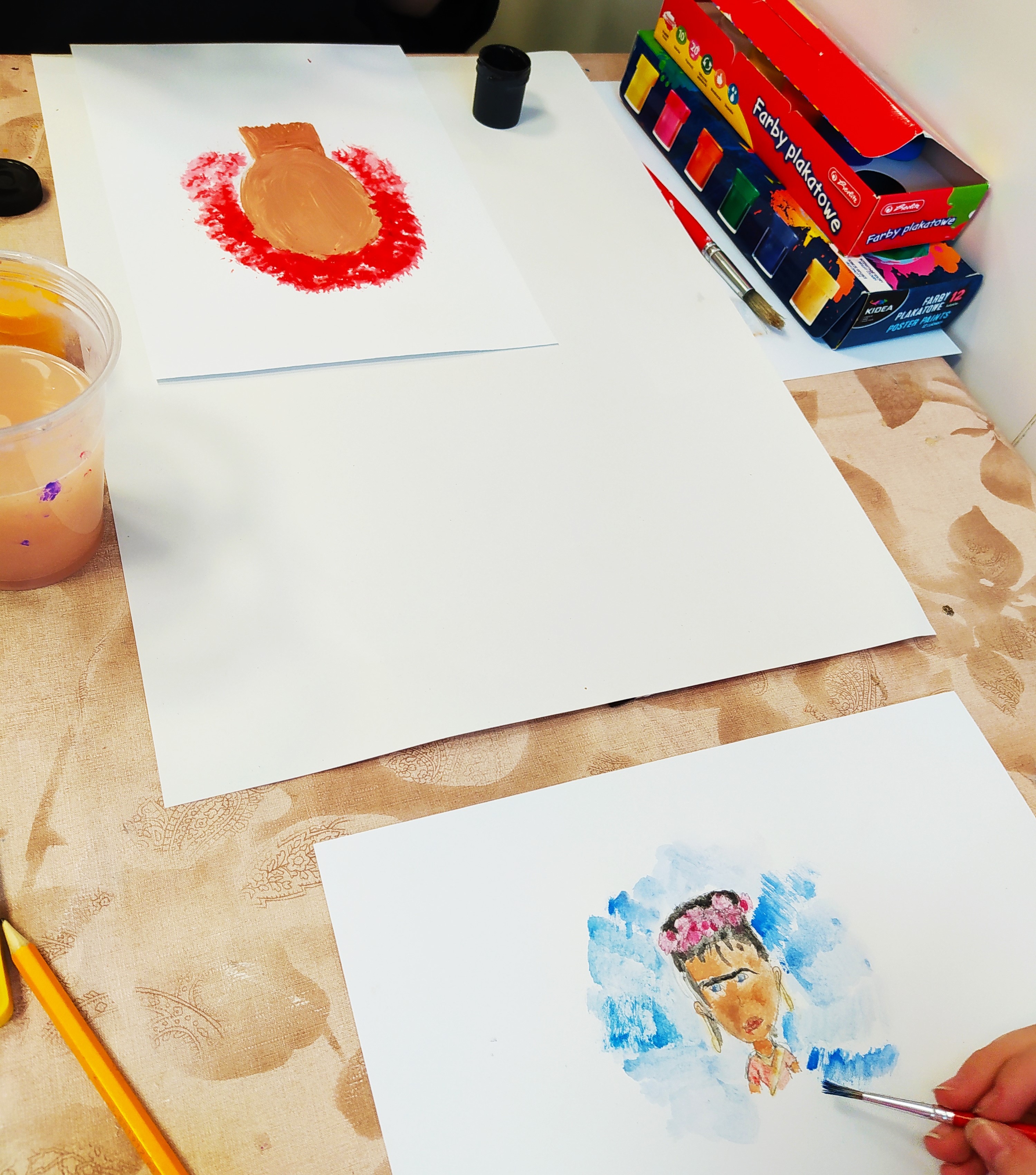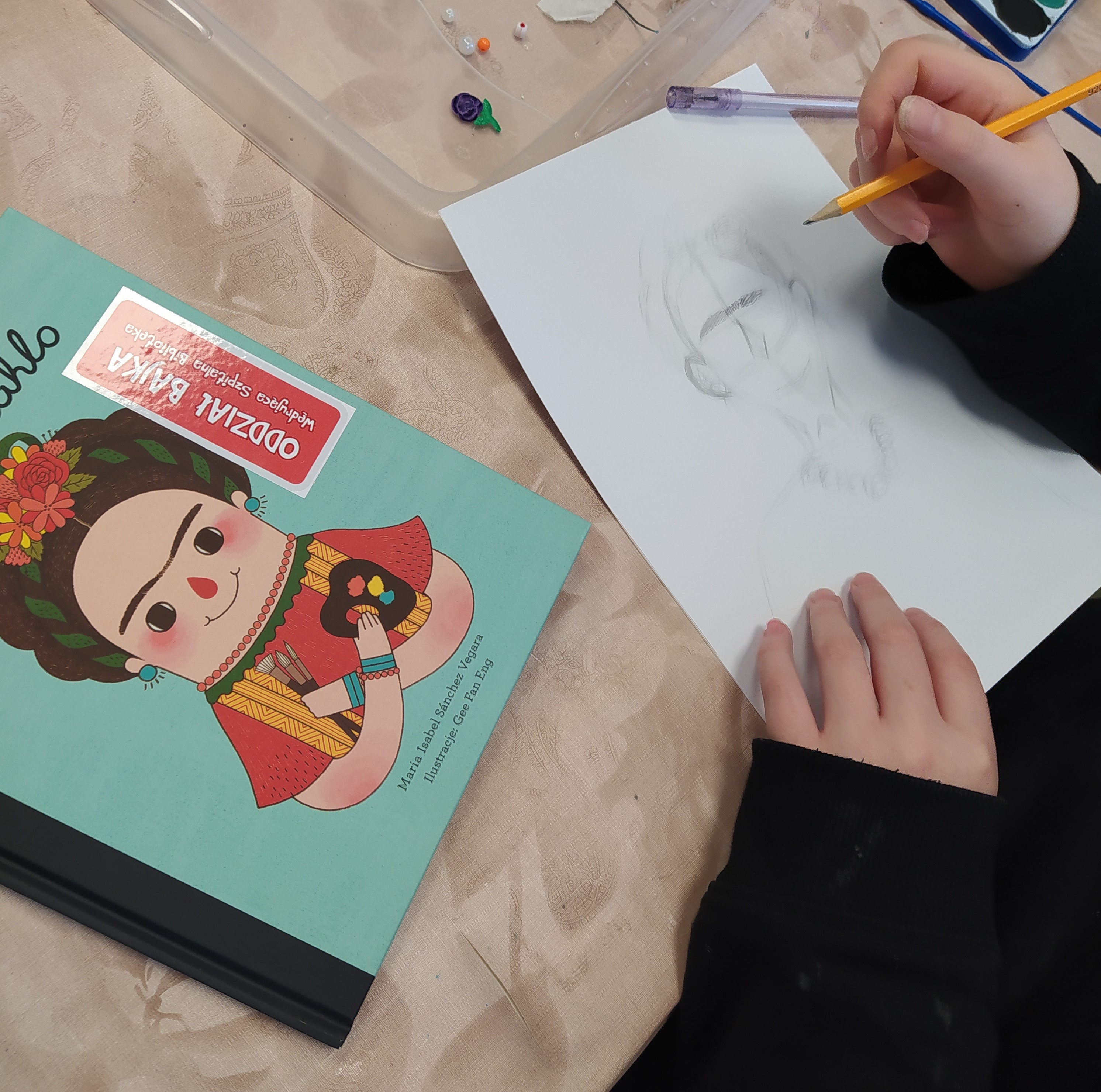 W ramach zajęć z Bajkowozem poznawaliśmy książkę z z serii „Mali WIELCY” o Fridzie Kahlo. Kiedy Frida była dzieckiem, ciężko zachorowała, a kilka lat później straszny wypadek całkowicie odmienił jej życie. Przykuta miesiącami do łóżka zajęła się malarstwem. Jej autoportrety wyrażające ból i cierpienie, miłość do życia i wolę walki uczyniły ją jedną z najbardziej znanych artystek na świecie.