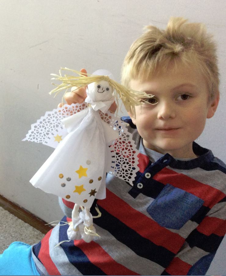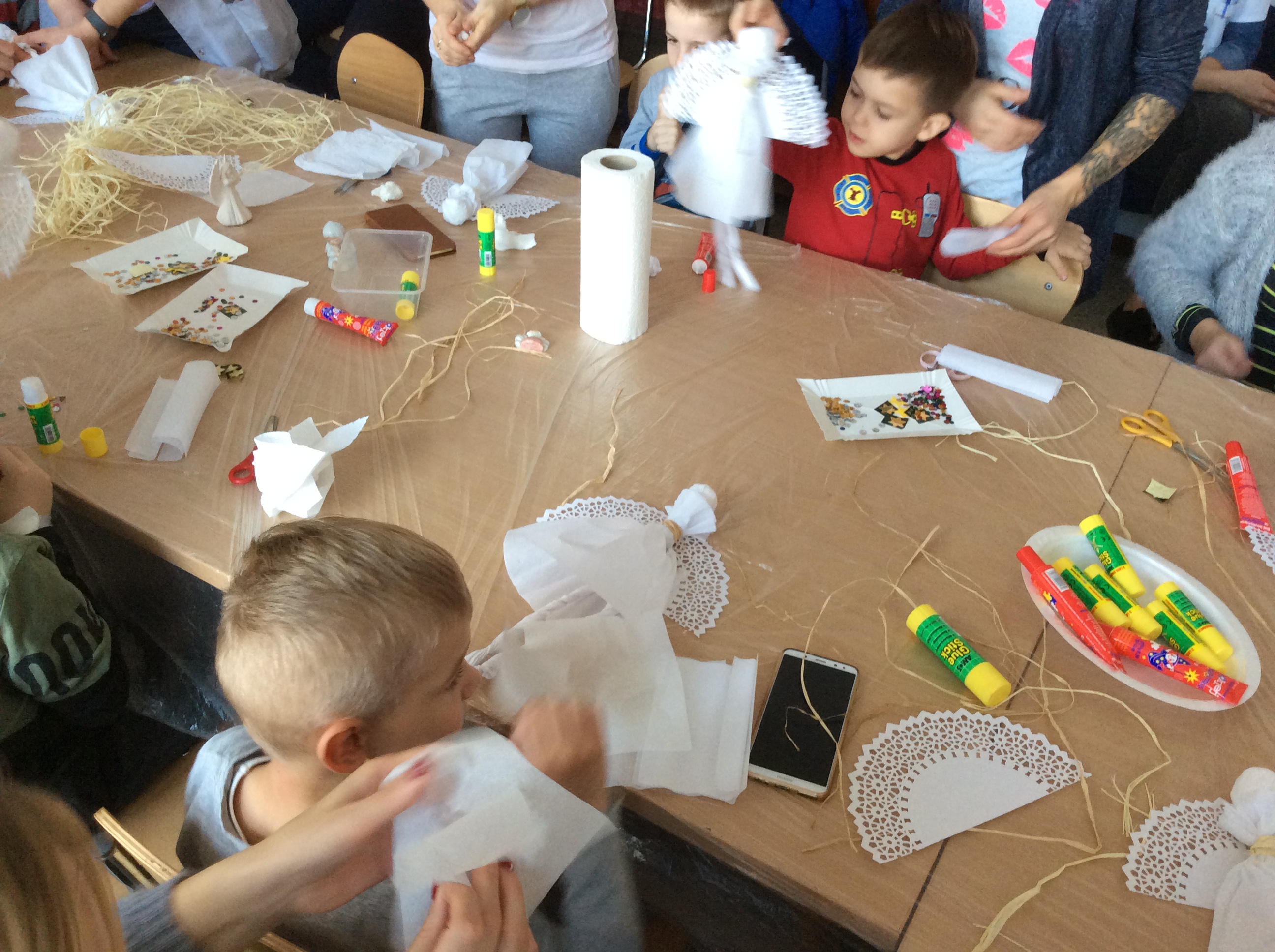 Uczestnicy, wchodząc do sali, z zainteresowaniem przyglądali się obrazom i figurkom aniołów. Po wysłuchaniu rymowanki i krótkiej rozmowie, dzieci razem z rodzicami przystąpiły do pracy. Instruowane przez prowadzącą, z zapałem ugniatały kawałki papierowych ręczników i skręcały elementy z białej bibuły marszczonej, tworząc z nich poszczególne części anioła. W całość łączyły elementy sznurkiem i rafią. Anielskie sukienki przyozdobione zostały złotymi i srebrnymi cekinami. Rafia przydała się także do wykonania anielskich włosów. Na zakończenie zajęć, w nagrodę za wykonane prace, dzieci otrzymały kolorowanki i zakładki do książek. Zadowolone z efektów swojej pracy, skocznie opuszczały salę z aniołami w rękach przy dźwiękach piosenki pt.: „Aniołki”.