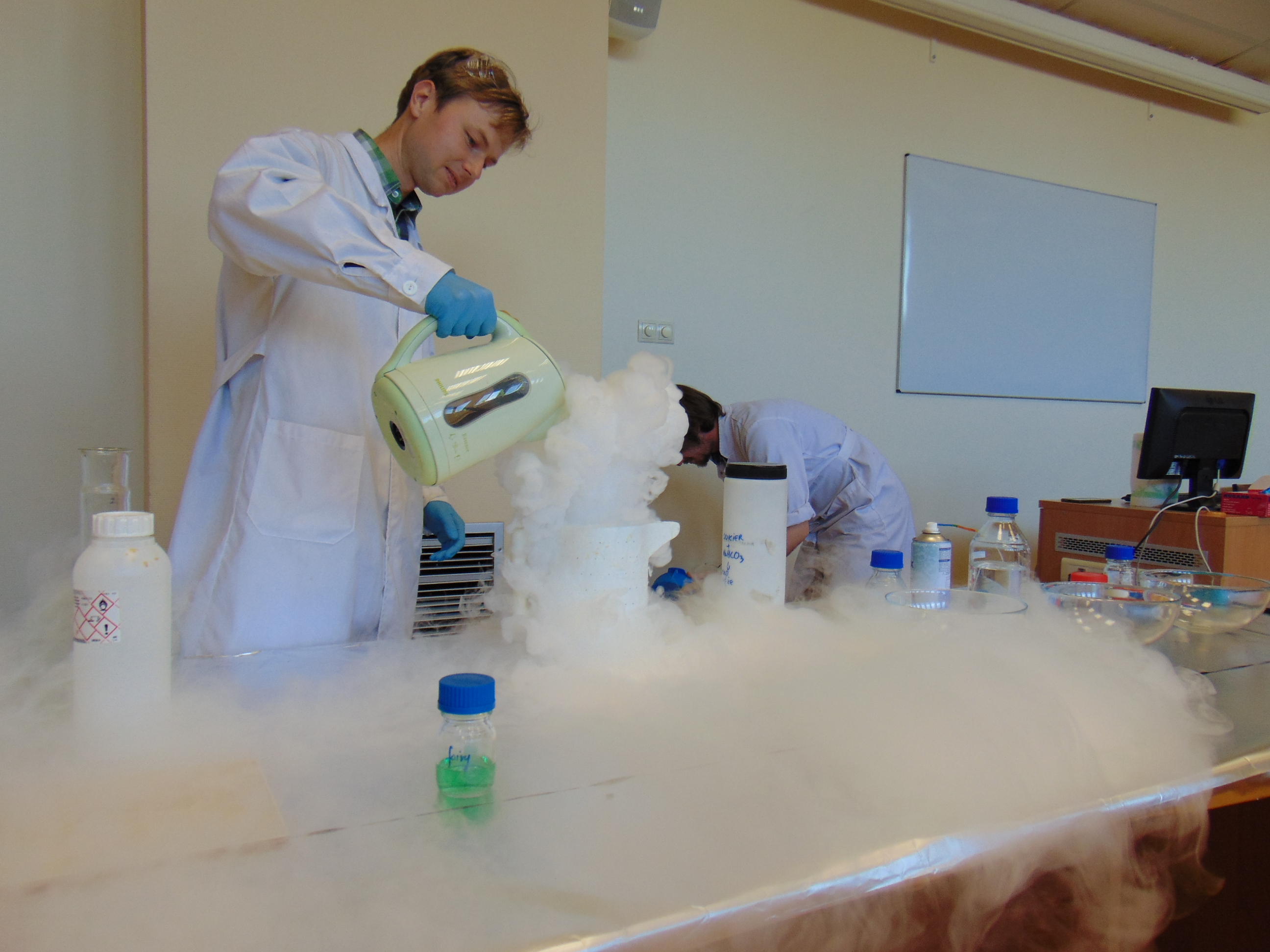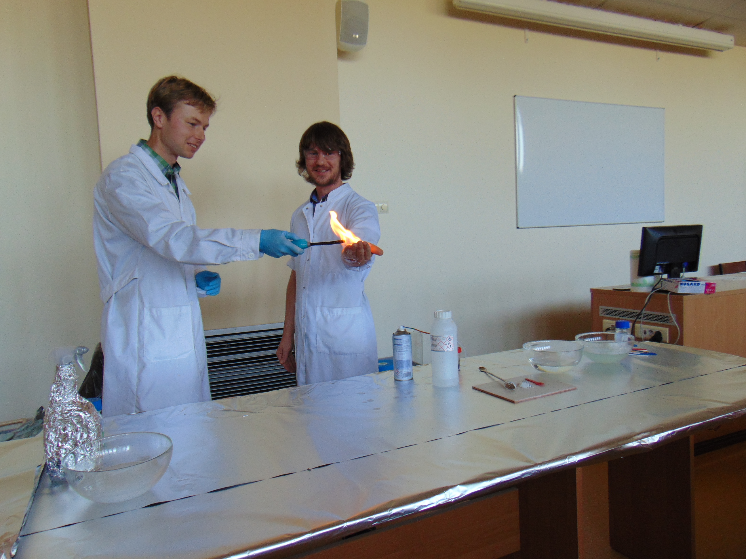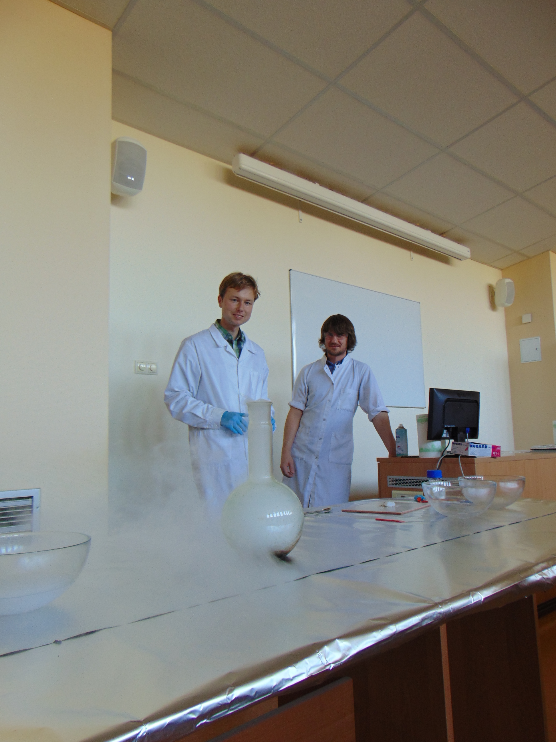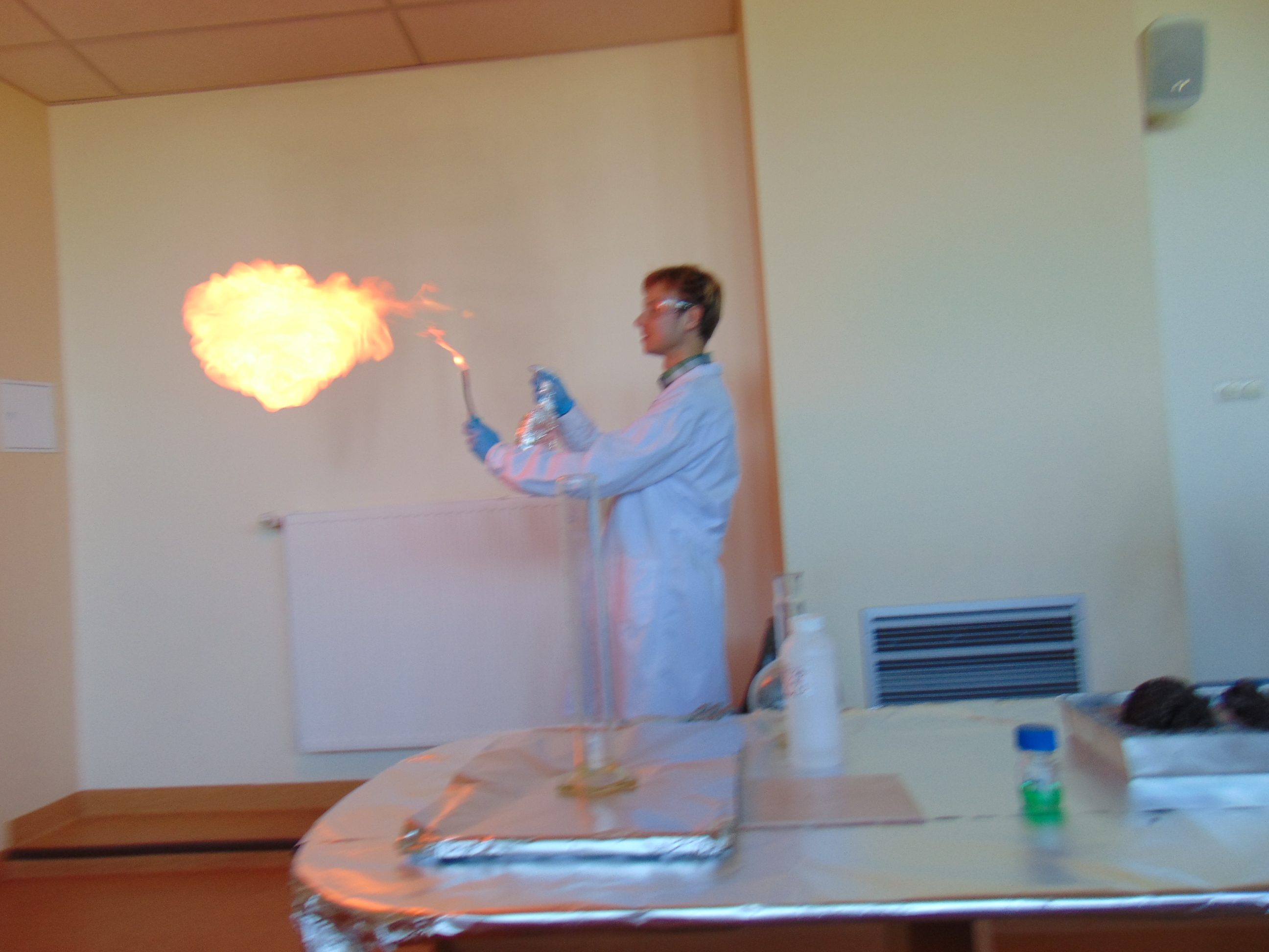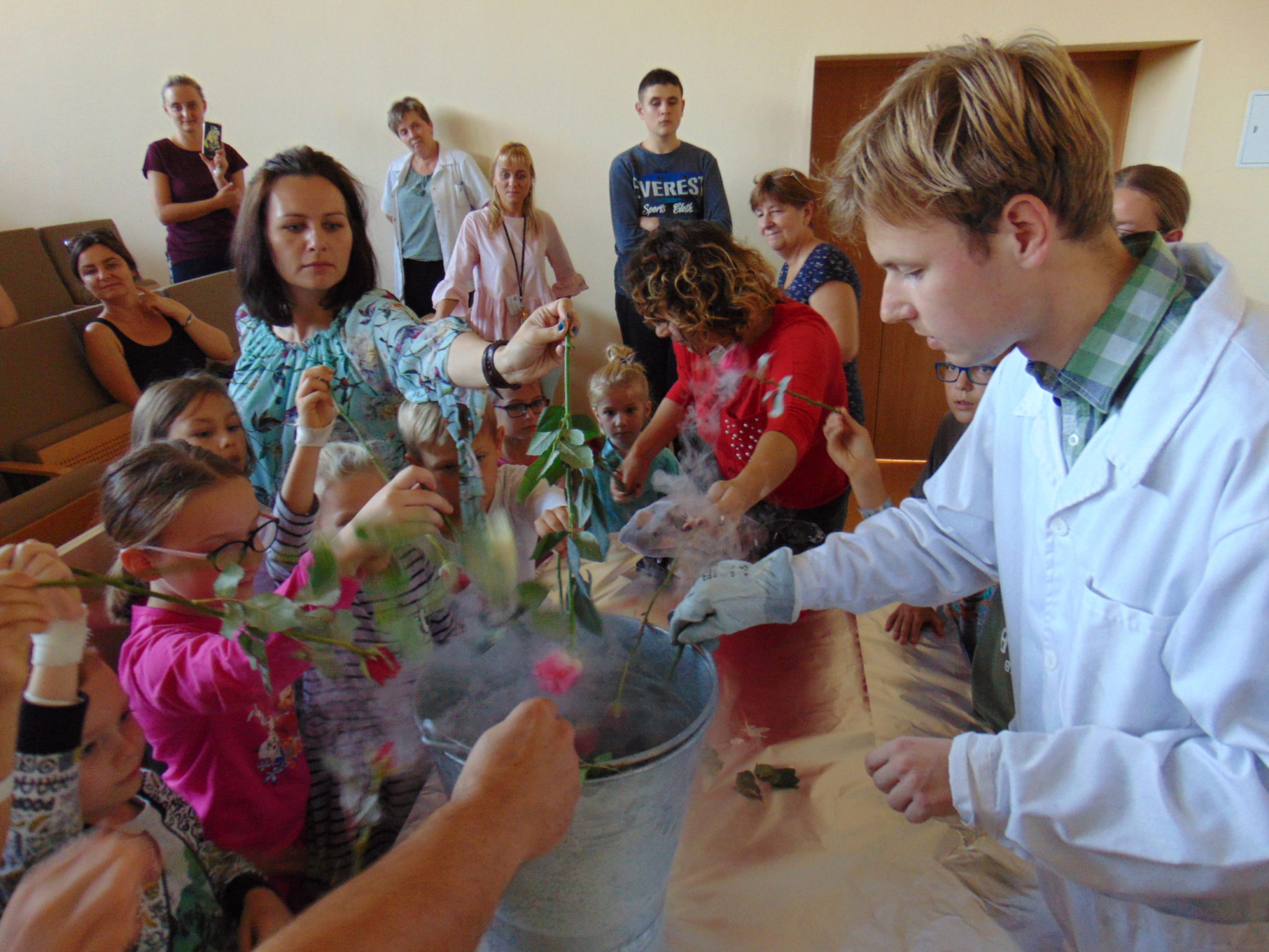 Już po raz kolejny gośćmi naszej szkoły byli pracownicy naukowi Wydziału Technologii Chemicznej Politechniki Poznańskiej: pan dr inż.Wojciech Smułek oraz mgr inż. Przemysław Aksamitowski.W auli stanęło chemiczne laboratorium. Naukowcom podczas eksperymentów asystowali uczniowie naszej szkoły. Recytacją wiersza J.Tuwima „Lokomotywa” wszyscy zebrani pomogli uruchomić dymiącą ciuchcię. Wszyscy pomogliśmy wywołać „syczące węże” faraona, udało się też spreparować ogromnych rozmiarów pastę dla słonia. Chemicy okazali się pogromcami ognia – stworzyli pianę, która płonęła na dłoni (nie parzyła). Pozornie proste reakcje zostały wyjaśnione naukowo np. uczniowie dowiedzieli się, skąd biorą się kolory w fajerwerkach oraz ćwiczyli trudną terminologię chemiczną. Niezwykle efektowny pokaz zakończył się wspólnym eksperymentowaniem – każdy uczestnik mógł osobiście zanurzyć różę w ciekłym azocie i obserwować zmianę jej właściwości fizycznych. Spotkanie dostarczyło niezwykłych doznań naukowych i było bardziej inspirujące niż kolejne rozdziały z podręcznika.