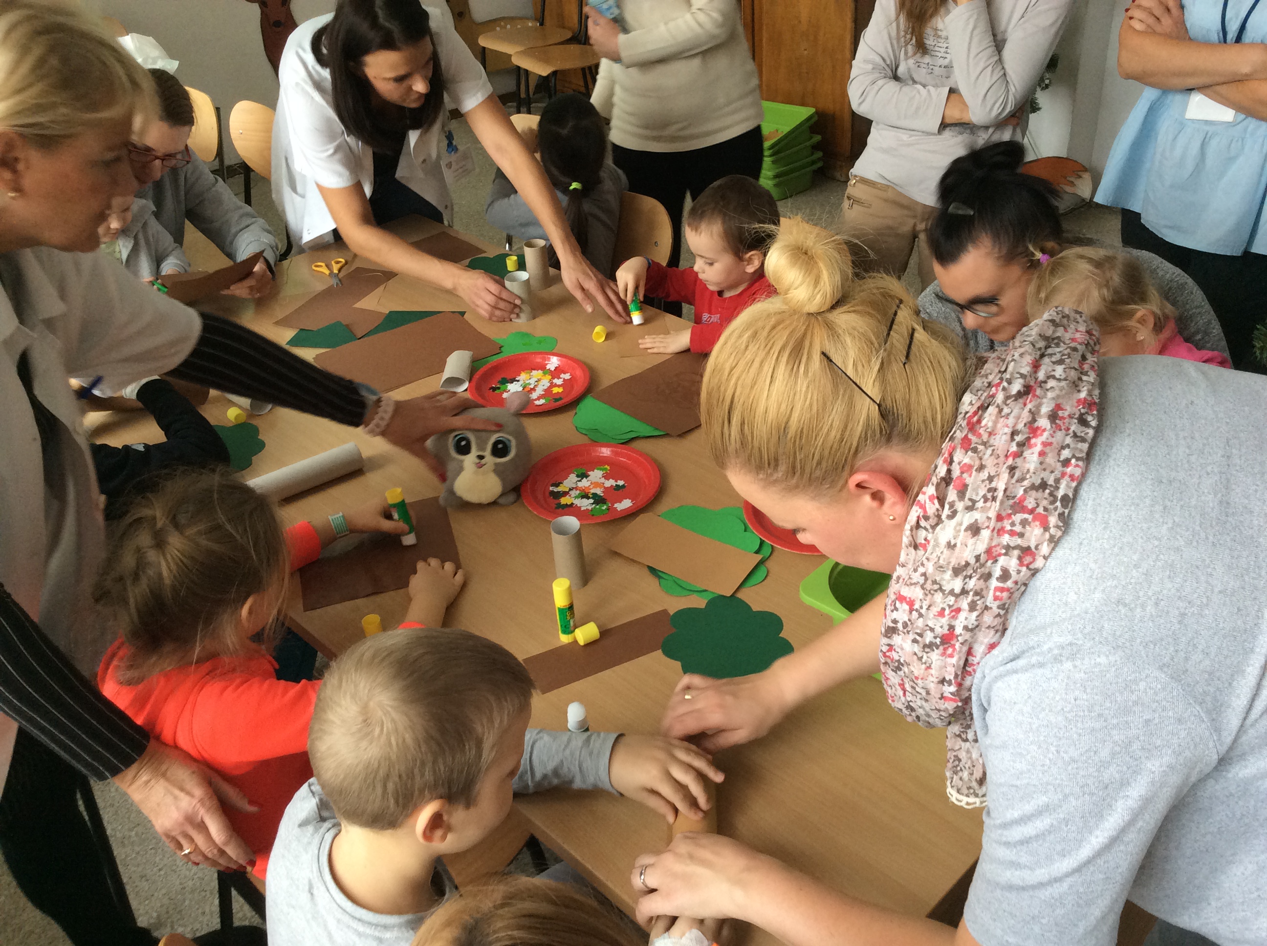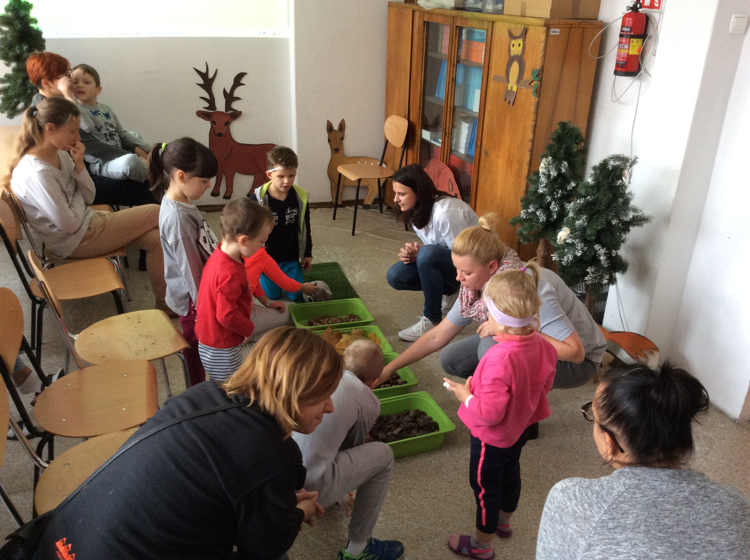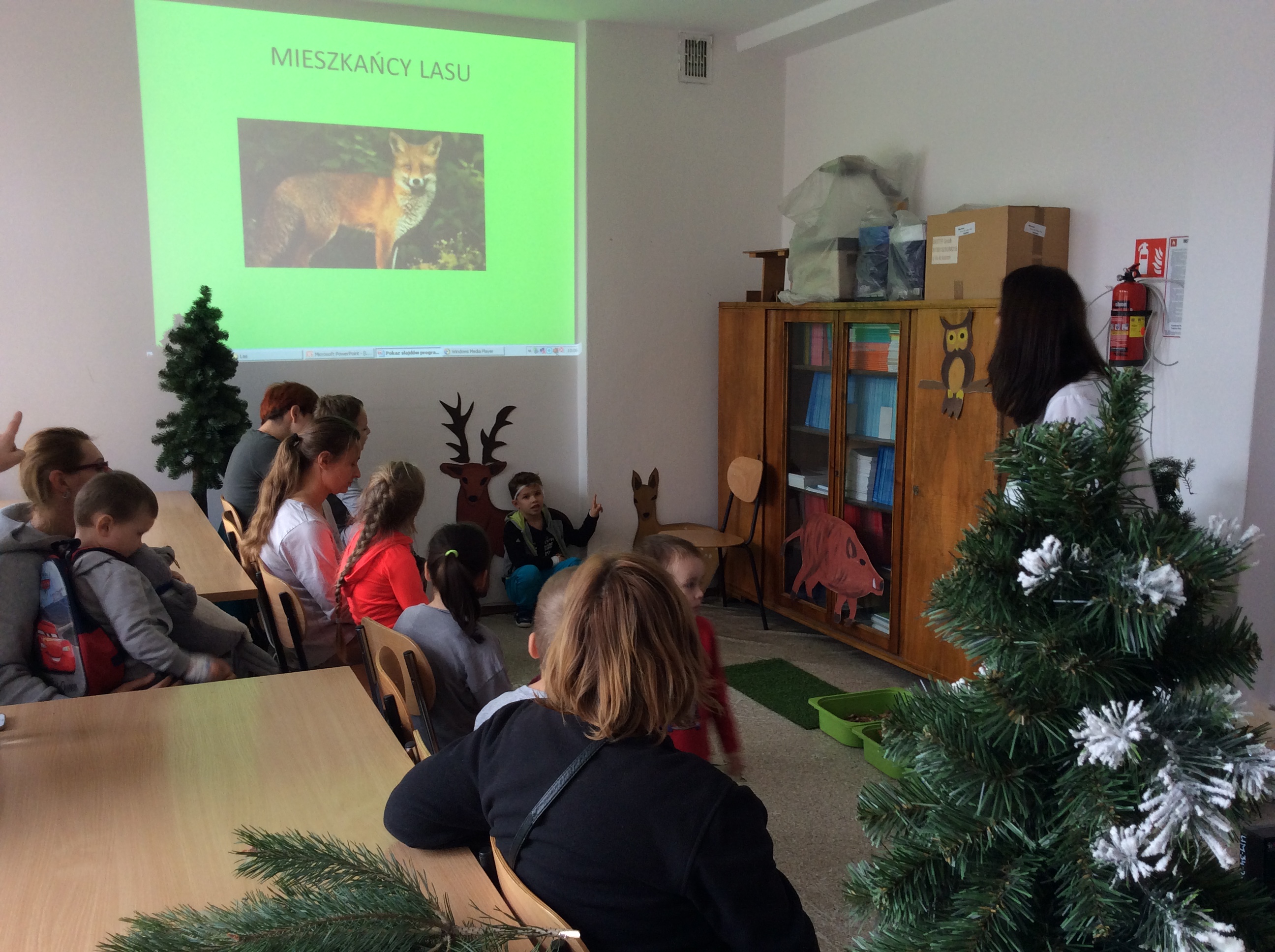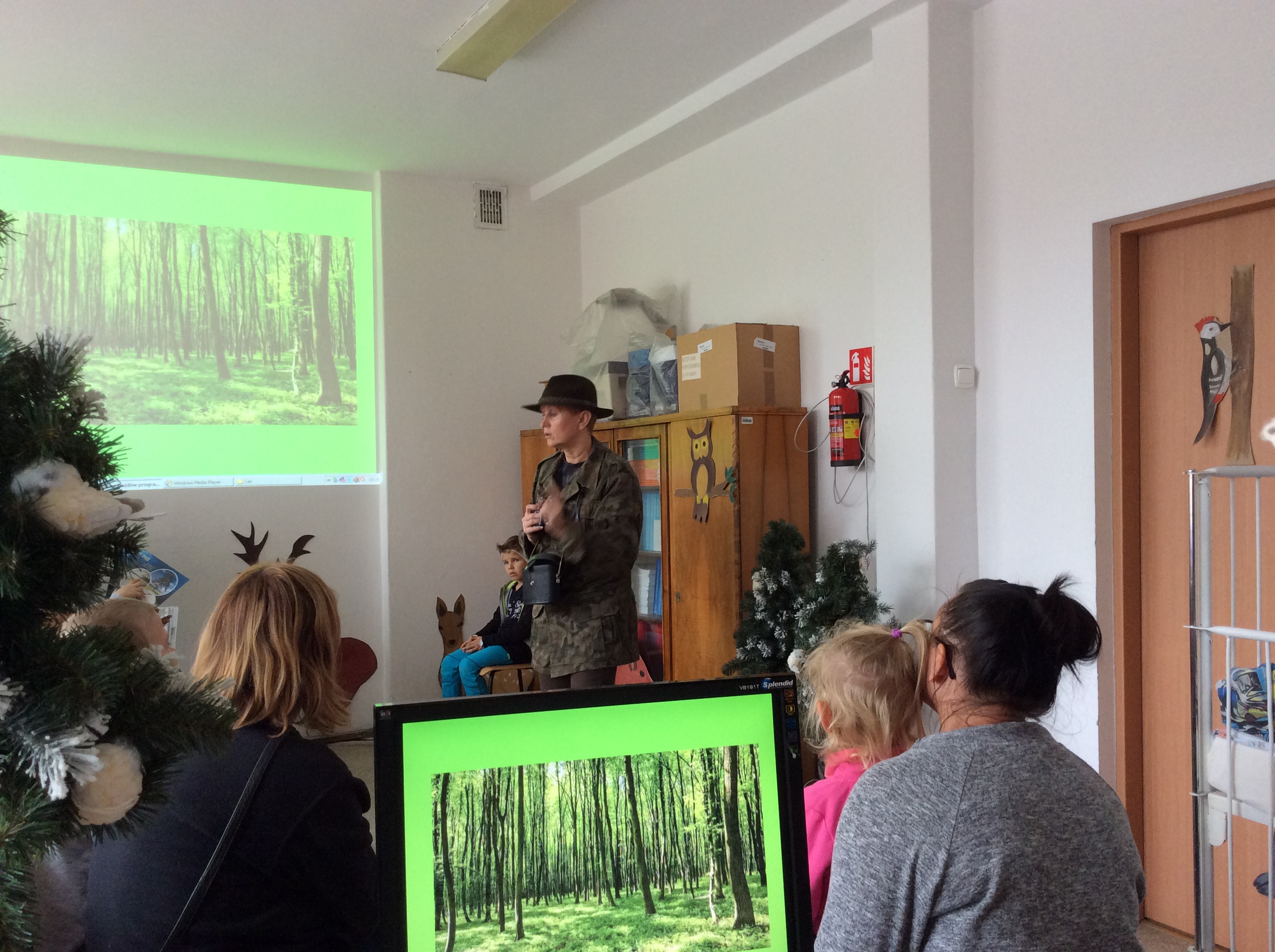 30 października 2018r., w ramach zajęć otwartych dla dzieci w wieku przedszkolnym odbyły się zajęcia pt. „Spacer po lesie”. Zajęcia rozpoczęły się od prezentacji multimedialnej podczas której dzieci poznały zwierzęta mieszkające w lesie, drzewa liściaste i iglaste. Podczas zajęć odwiedził nas Pan Leśniczy, który opowiedział o swojej pracy jak również o tym jak odpowiednio zachowywać się w lesie. Po odwiedzinach Pana Leśniczego przedszkolaki uczestniczyły w zabawach ruchowych pt „Liście na wietrze” do utworu muzycznego „Jesień” Vivaldiego z wykorzystaniem chusty Klazny. Dzieci wzięły również udział w spacerze sensoryczną trasą która rozwija u dzieci zmysł dotyku (różne rodzaje powierzchni). Na koniec zajęć dzieci wykonały prace plastyczną pt. „Drzewo”. Zajęcia upłynęły w radosnej atmosferze.