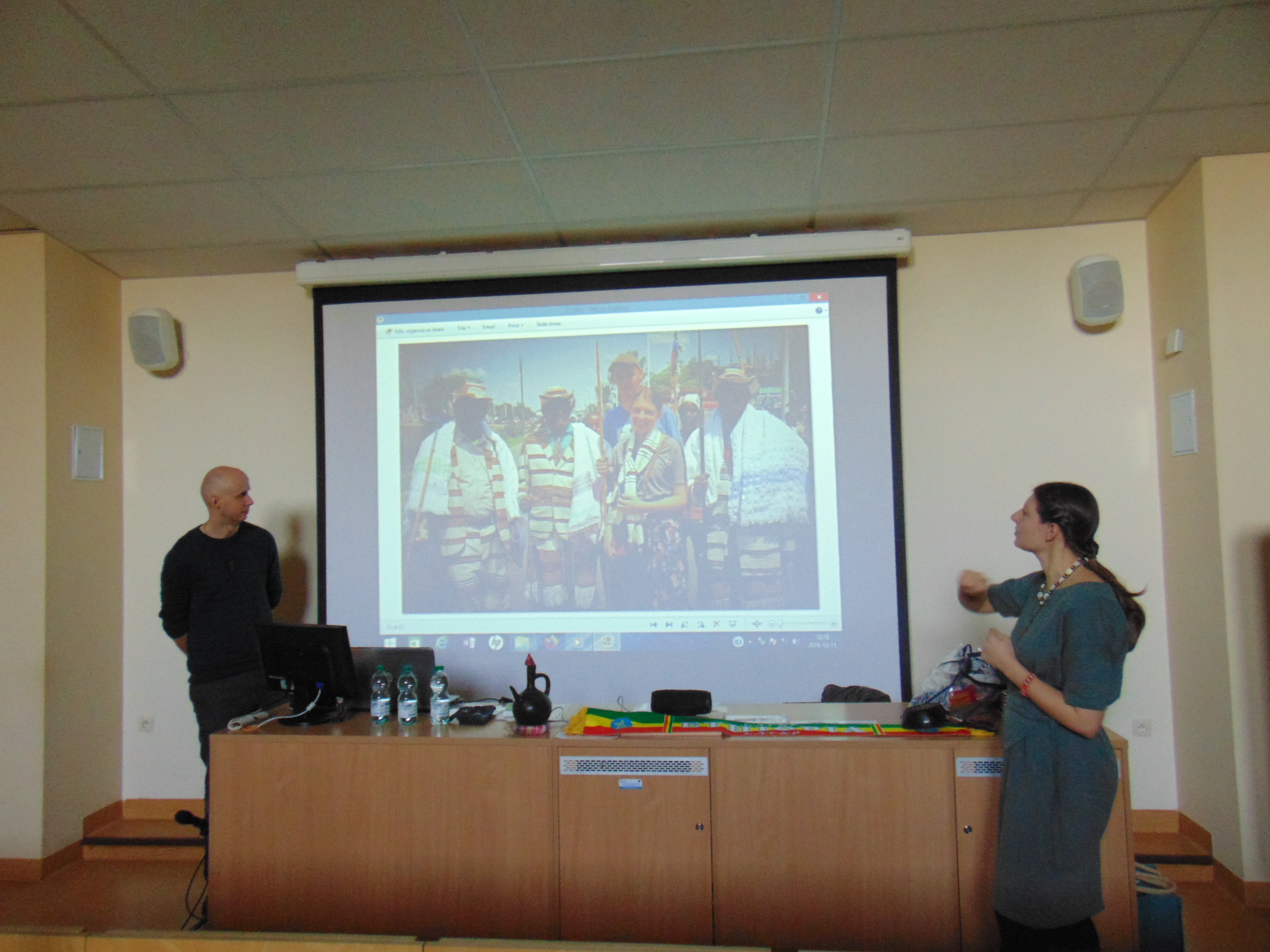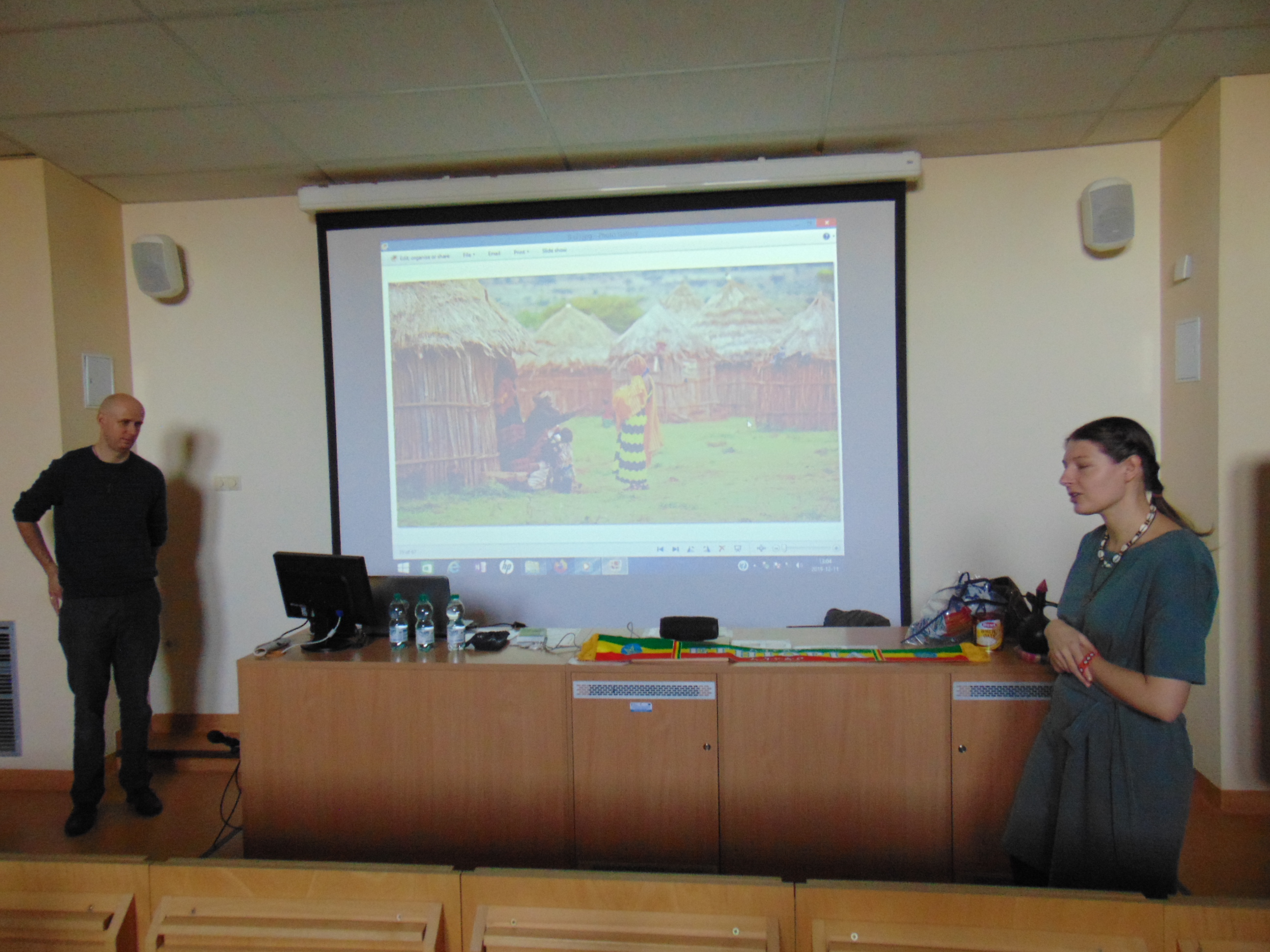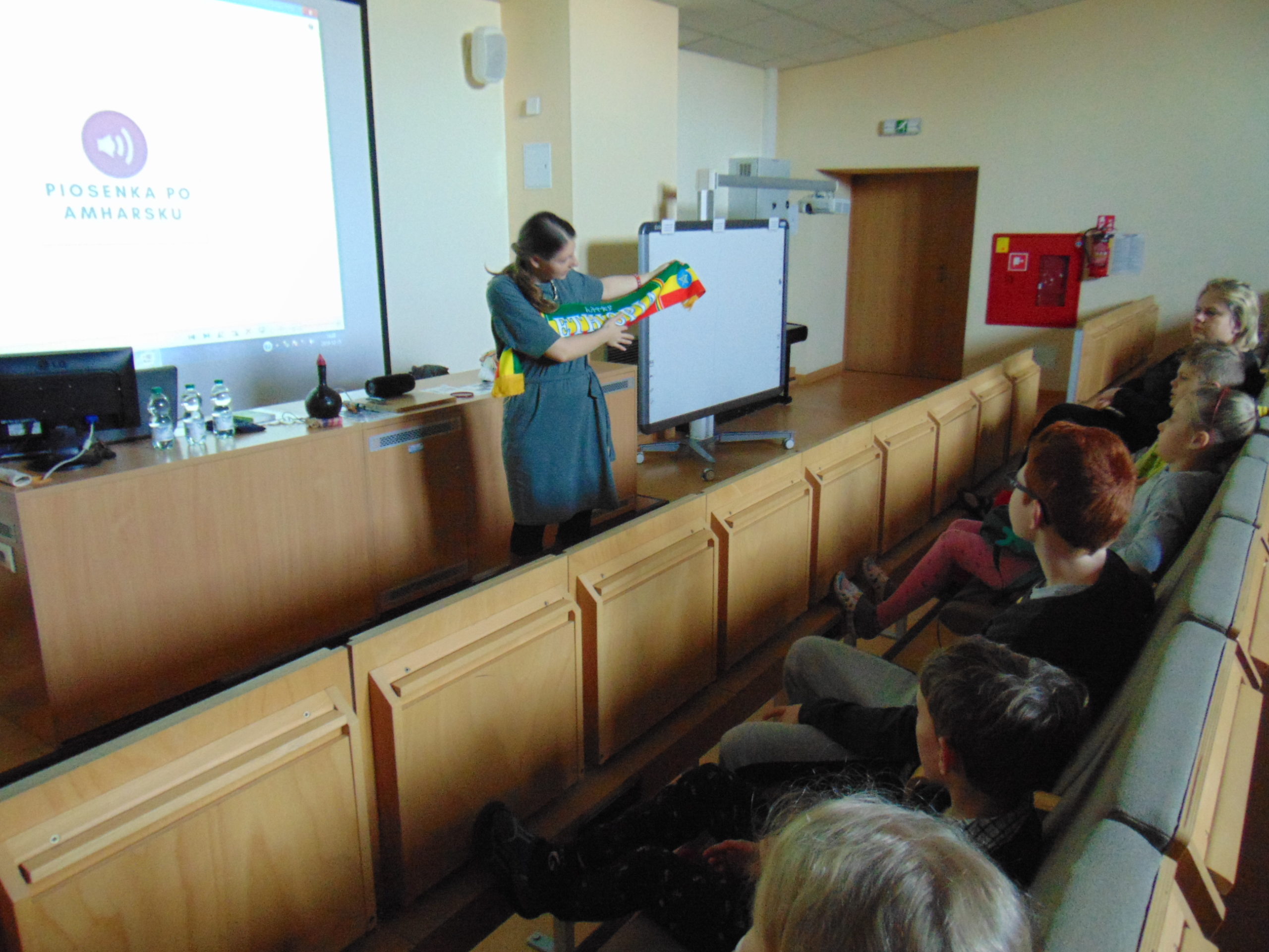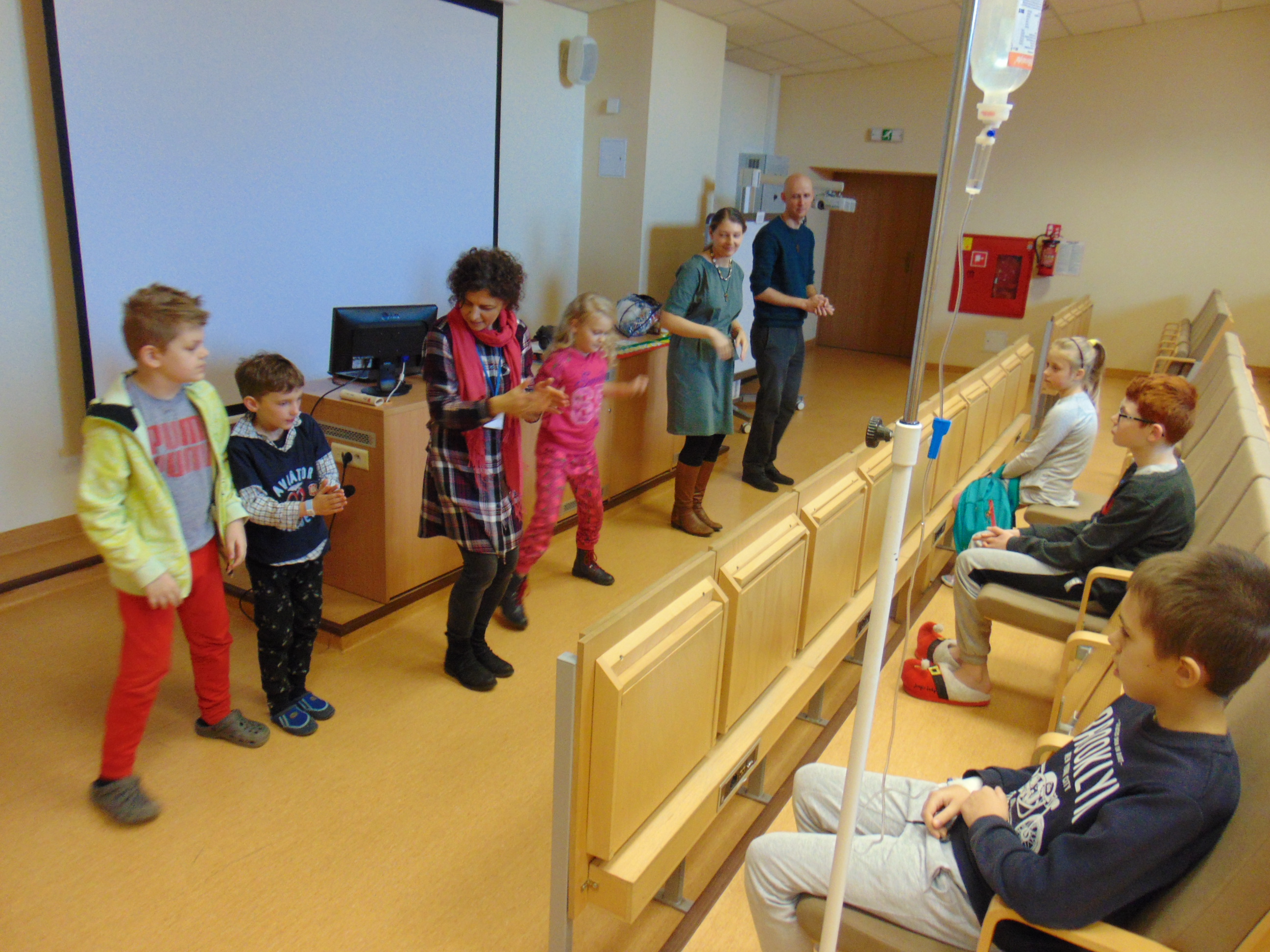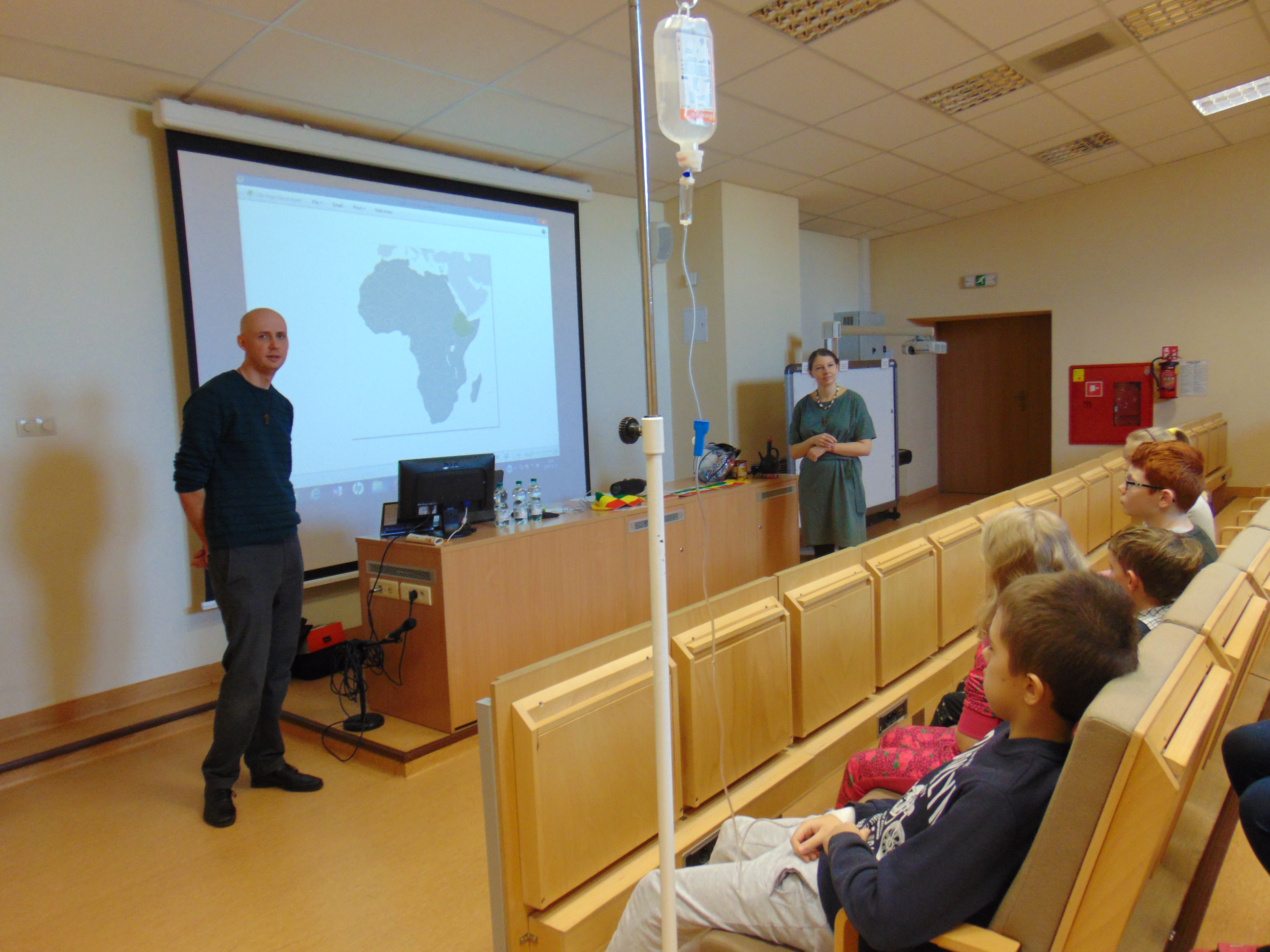 Państwo Lemańscy opowiadali o Etiopii, w której spędzili ponad dwa lata, ale w sumie na Czarnym Lądzie mieszkali cztery, ponieważ odwiedzili jeszcze Republikę Południowej Afryki. W bardzo ciekawy sposób małżeństwo opowiadało o przyrodzie, jedzeniu, oraz zwyczajach i legendach  etiopskich. Dzieci miały też okazję nauczyć się afrykańskich piosenek i zatańczyć w ich rytm. Mali pacjenci mogli się też ubrać w egzotyczne stroje i nauczyć się kilka słów w języku amharskim. Na koniec uczniowie rozwiązywali quiz o Etiopii i przy afrykańskich dźwiękach powróciły na oddziały.