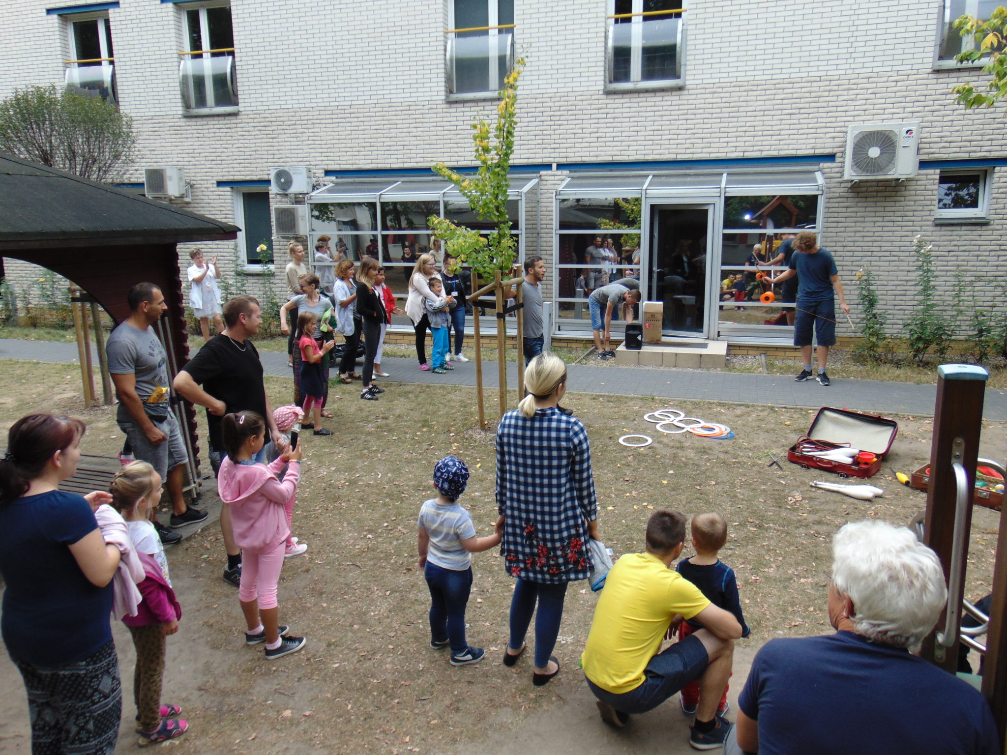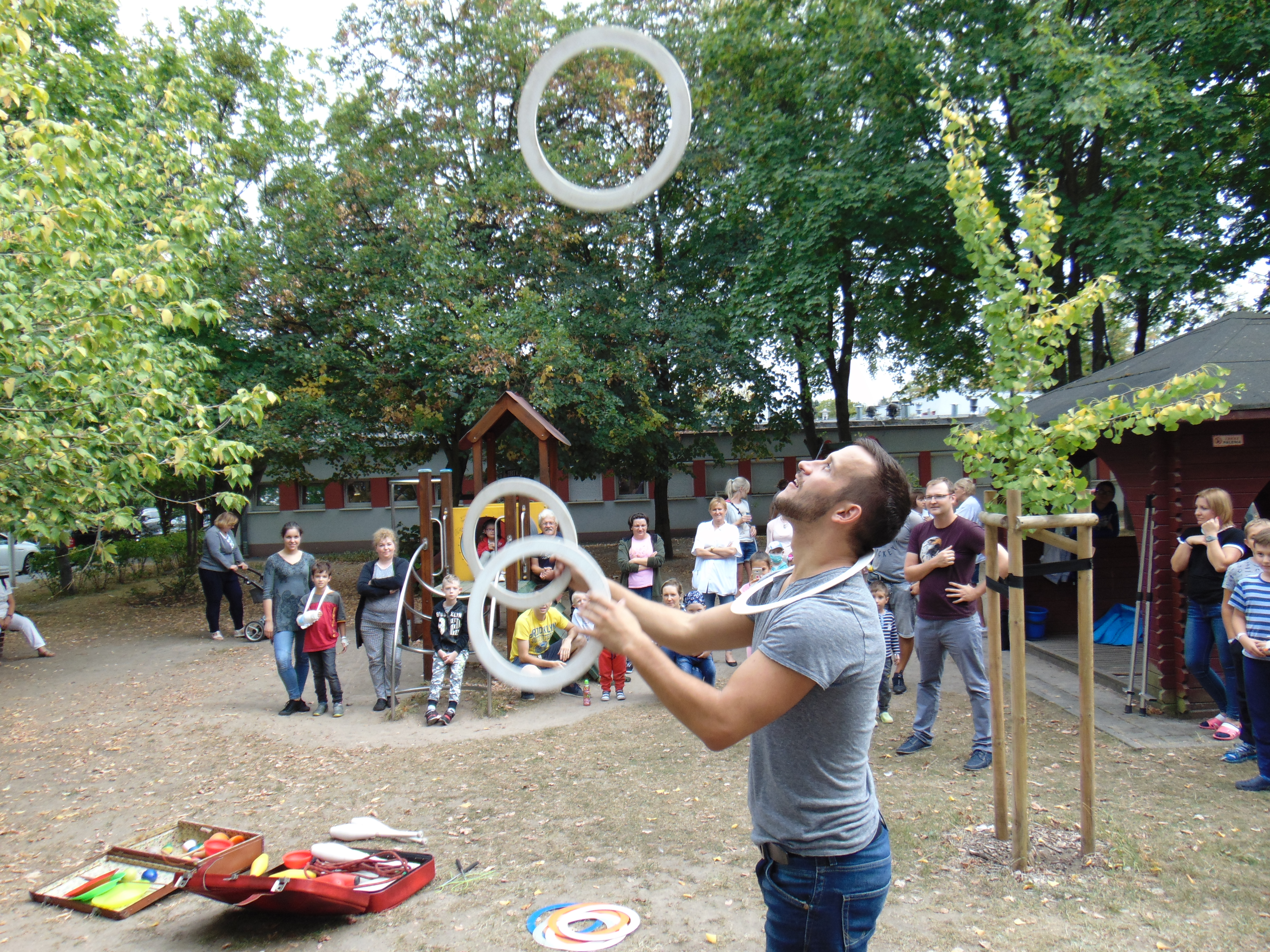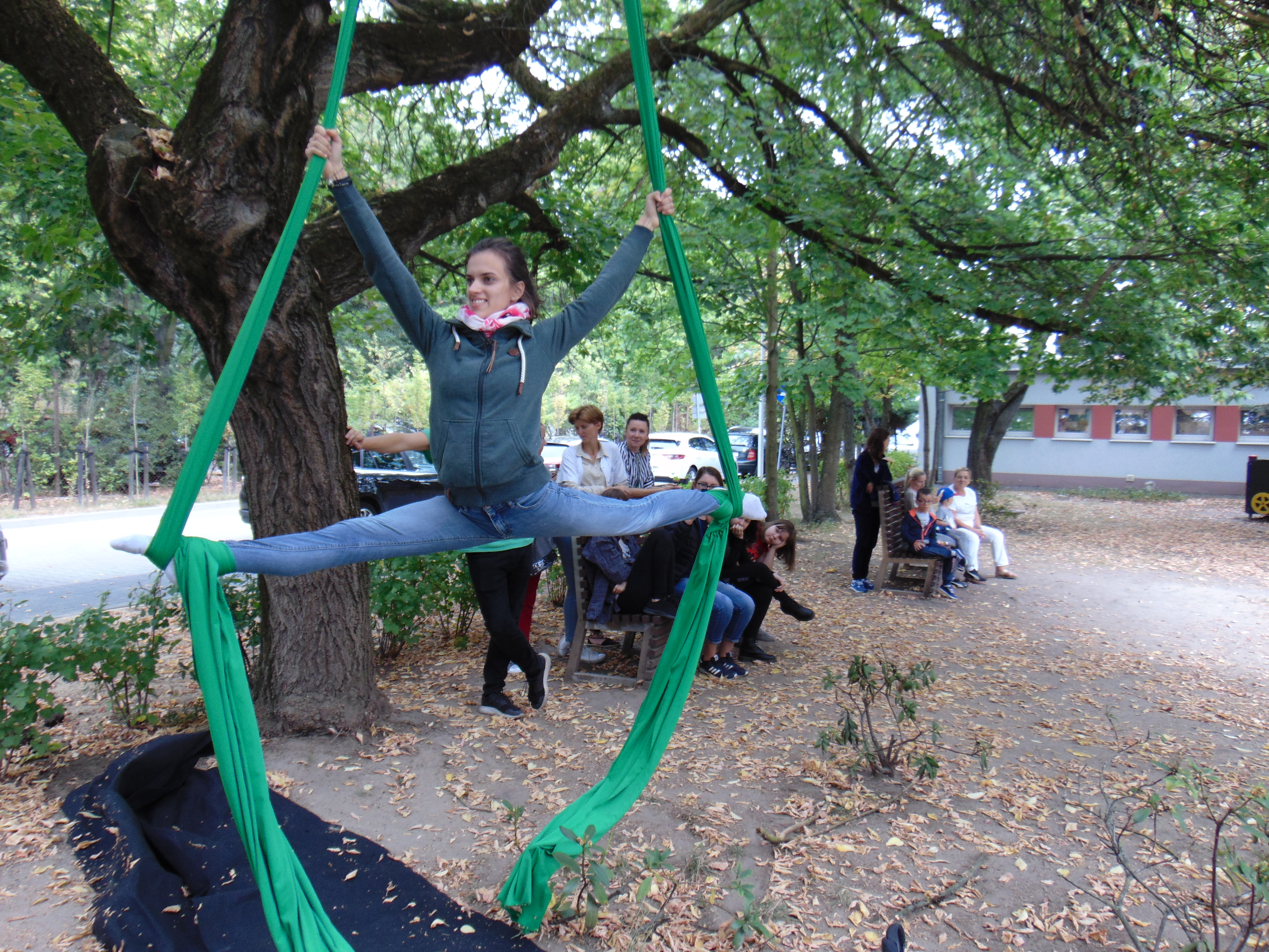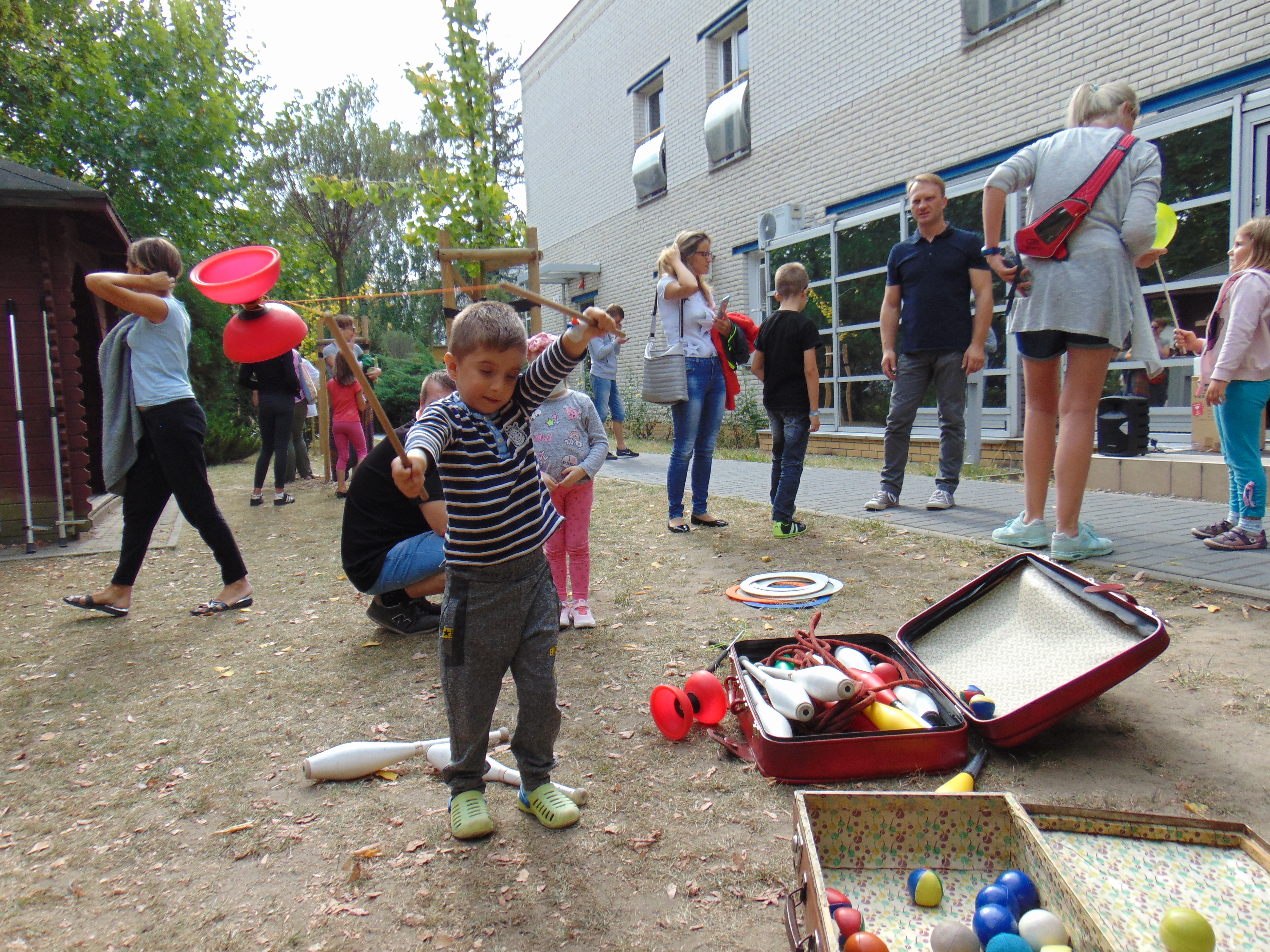 Warsztaty ze sztuki cyrkowej,które odbyły się na świeżym powietrzu sprawiły dzieciom ogromna radość. Każdy mógł spróbować swoich sił w chodzeniu po slackline, żonglerce czy chodzeniu na szczudłach.