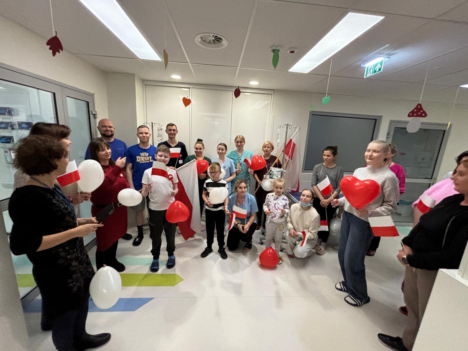 Najpierw uczniowie przygotowywali okolicznościowe rozety w barwach narodowych, uczyli się piosenek i pieśni patriotycznych oraz polskich tańców. Uczestniczyli też w zajęciach dotyczących historii naszego hymnu państwowego i pozostałych symboli narodowych. Nagraliśmy również recytacje wierszy w wykonaniu uczniów oraz piosenkę „Płynie Wisła”. Kulminacją było uroczyste odśpiewanie „Mazurka Dąbrowskiego” i zatańczenie poloneza. W akcję włączyła się cała społeczność szpitala: rodzice, personel, a nawet odwiedzający. Świętowanie zakończyliśmy zjedzeniem rogali marcińskich – zgodnie z poznańską tradycją obchodzoną 11 listopada.