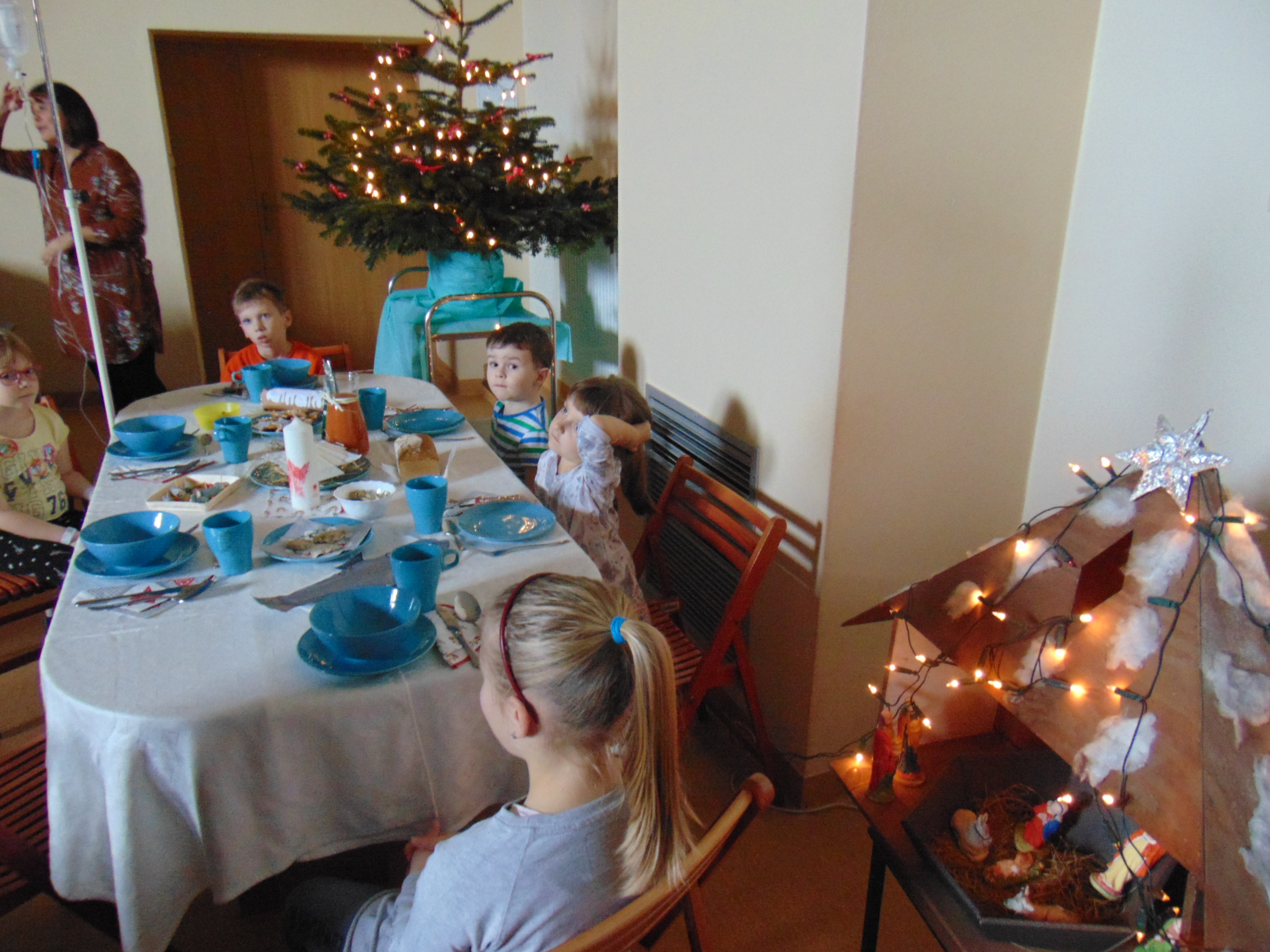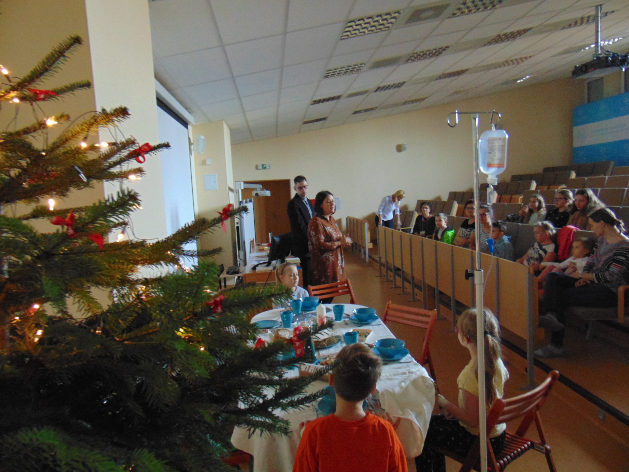 Na oddziałach dzieci przygotowywały potrawy wigilijne z papieru, plasteliny i innych tworzyw.Przy okazji rozmawiały z wychowawcami i opiekunami o tradycjach Bożonarodzeniowych, aby nie zniknęły z naszej polskiej bogatej kultury. Po południu uczniowie prezentowali swoje potrawy, a nauczyciele wyjaśniali ich symbolikę. Spotkanie okraszone było kolędowaniem i tańcem. Radości, zabawy, wzruszeń, a nawet podniosłego nastroju było co niemiara. Na koniec Pani Dyrektor złożyła wszystkim życzenia świąteczne i z niełatwym zadaniem domowym (napisaniem życzeń dla personelu medycznego na kartce własnoręcznie wykonanej) mali pacjenci rozeszli się na oddziały.