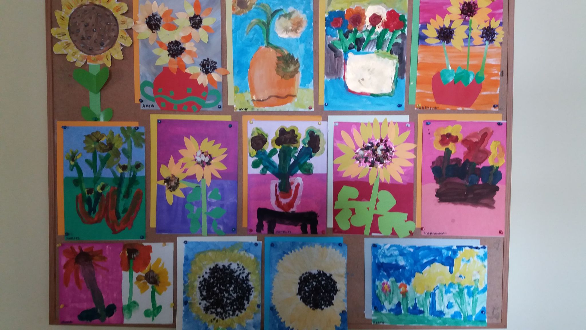 Tej jesieni rozpoczęliśmy z przedszkolakami cykl spotkań ze sztuką pt. „Sztuka puka do malucha”. Pierwsze zajęcia oparte były na obrazach Vincenta van Gogha pt. „Słoneczniki”. Oglądaliśmy ich różne wersje, malowane zarówno w jednej, jak i różnych gamach kolorystycznych, gdyż autor namalował ich aż jedenaście. Zwracaliśmy także uwagę na charakterystyczną fakturę obrazu. Z ciekawostek dowiedzieliśmy się o trudnym życiu artysty i jego zmaganiach ze zbyciem obrazów. Tak popularnemu dziś artyście za życia udało się sprzedać jedynie jeden.