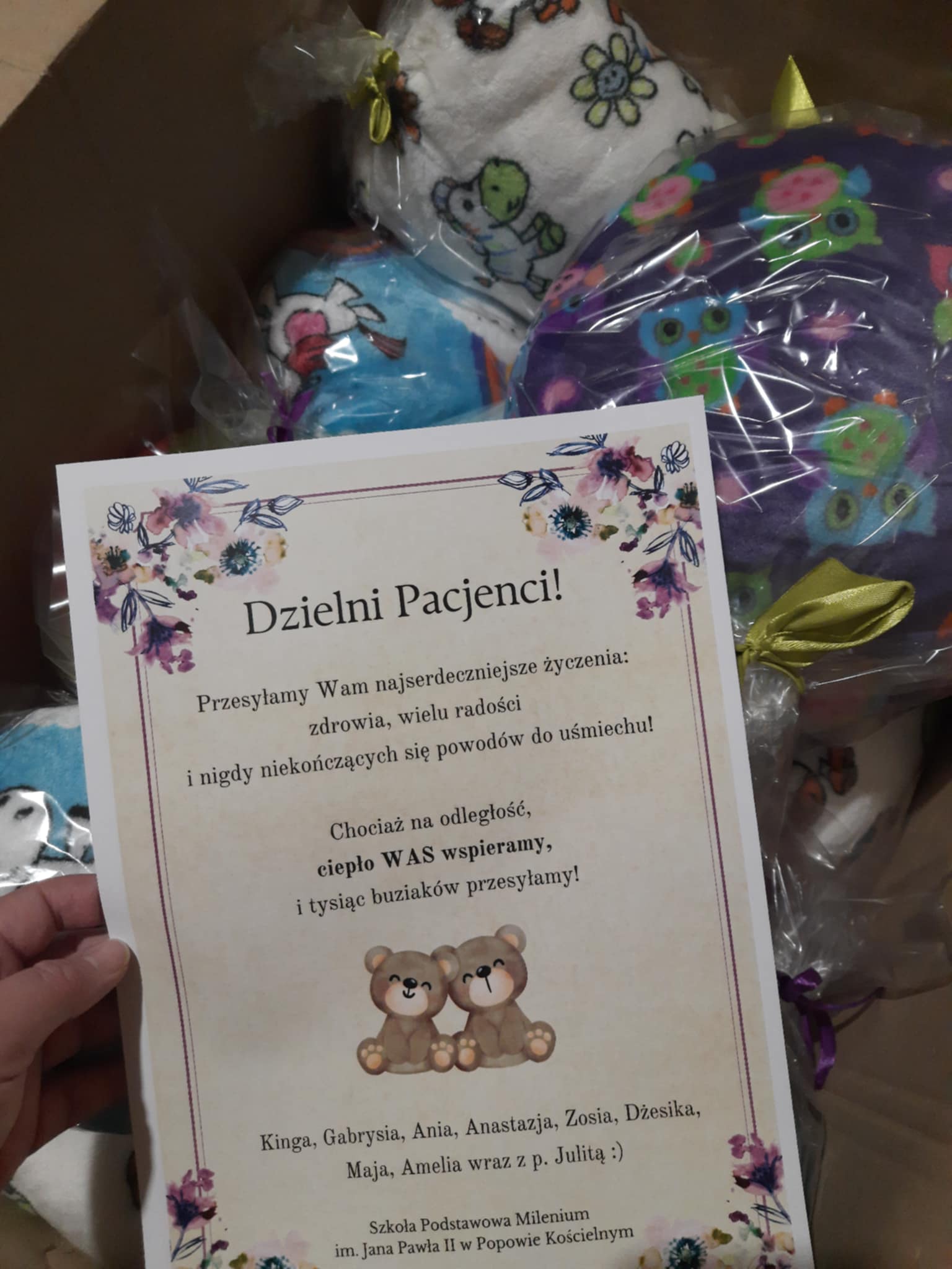 Uczniowie rozwiązywali zagadki oraz mikołajkowe zdania. Na koniec zajęć Święty Mikołaj rozdał dzieciom poduszki, które zostały uszyte przez uczniów ze Szkoły Podstawowej Milenium im. Jana Pawła II w Popowie Kościelnym.