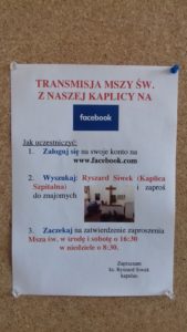 Dzięki inicjatywie ks. Ryszarda Siwka, nauczyciela religii i kapelana w naszym szpitalu możemy prowadzić „na żywo” transmisje np. Mszy Św. z kaplicy szpitalnej, ale także różnych wydarzeń np. koncertów, przedstawień teatralnych itp., które odbywają się w sali wykładowej szpitala. Wszystkie chętne dzieci (i ich rodzice), które nie mogą opuszczać szpitalnego oddziału mogą uczestniczyć w tych wydarzeniach za pośrednictwem Facebooka.