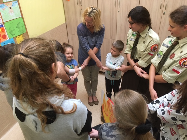 Już kolejny raz odwiedzili nas członkowie „Royal Rangers Polska” (RRP) – Międzynarodowej Chrześcijańskiej Organizacji Skautowej. Harcerki odwołały się do tradycji skautingu i harcerstwa. Dzieci poznały symbole harcerstwa, pozdrowienie „czuwaj” oraz ideały wychowawcze – „Złota zasada” i „Przyrzeczenia”. Celem działalności RRP jest fizyczny, psychiczny, społeczny i duchowy rozwój dzieci i młodzieży w duchu wartości chrześcijańskich, patriotycznych i obywatelskich. Na zakończenie spotkania dzieci wykonały wspólnie harcerskie lampiony, przekazały sobie „iskierkę pokoju” i uroczyście odśpiewały „Płonie ognisko”.