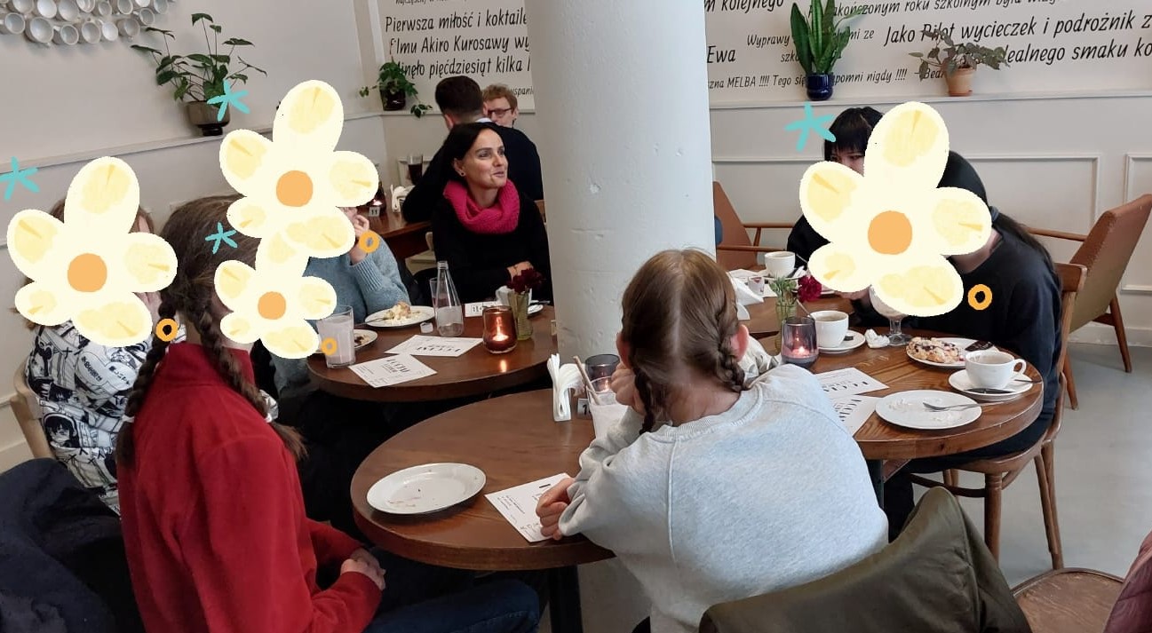 Po obejrzeniu filmu odwiedziliśmy pobliską kawiarnię „Kociak”. Pyszne słodkości wszystkim bardzo smakowały, a pałaszując desery dyskutowaliśmy o filmie.
