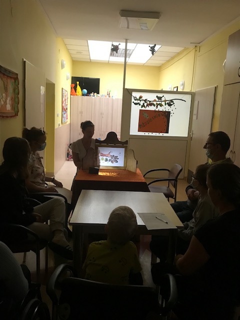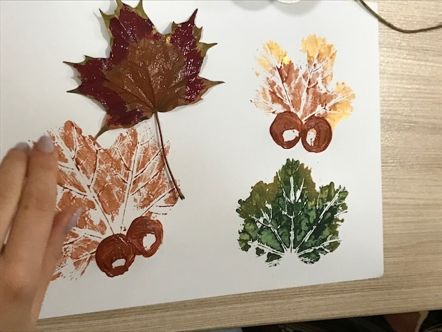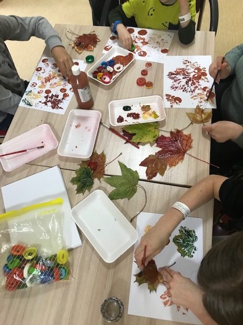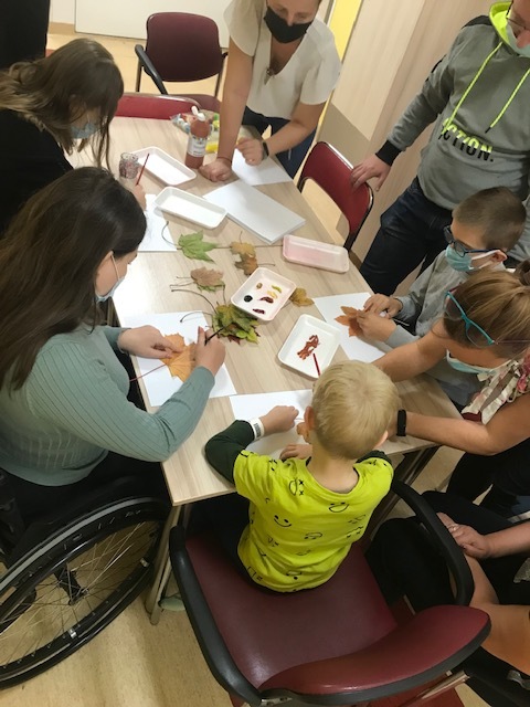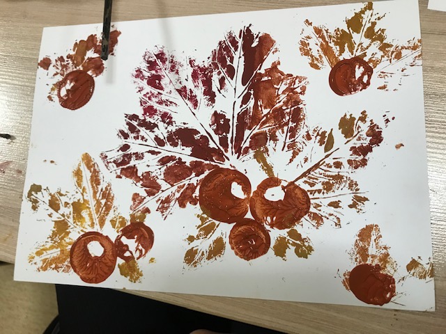 Pani Monika opowiedziała ciekawą historię ,,Zaczarowanego Kasztanka”. W części warsztatowej pani Edyta pokazała technikę stemplowania na płaszczyźnie liściem i plastikowym korkiem . W końcowym efekcie powstały piękne prace ,,Kasztany w liściach”.