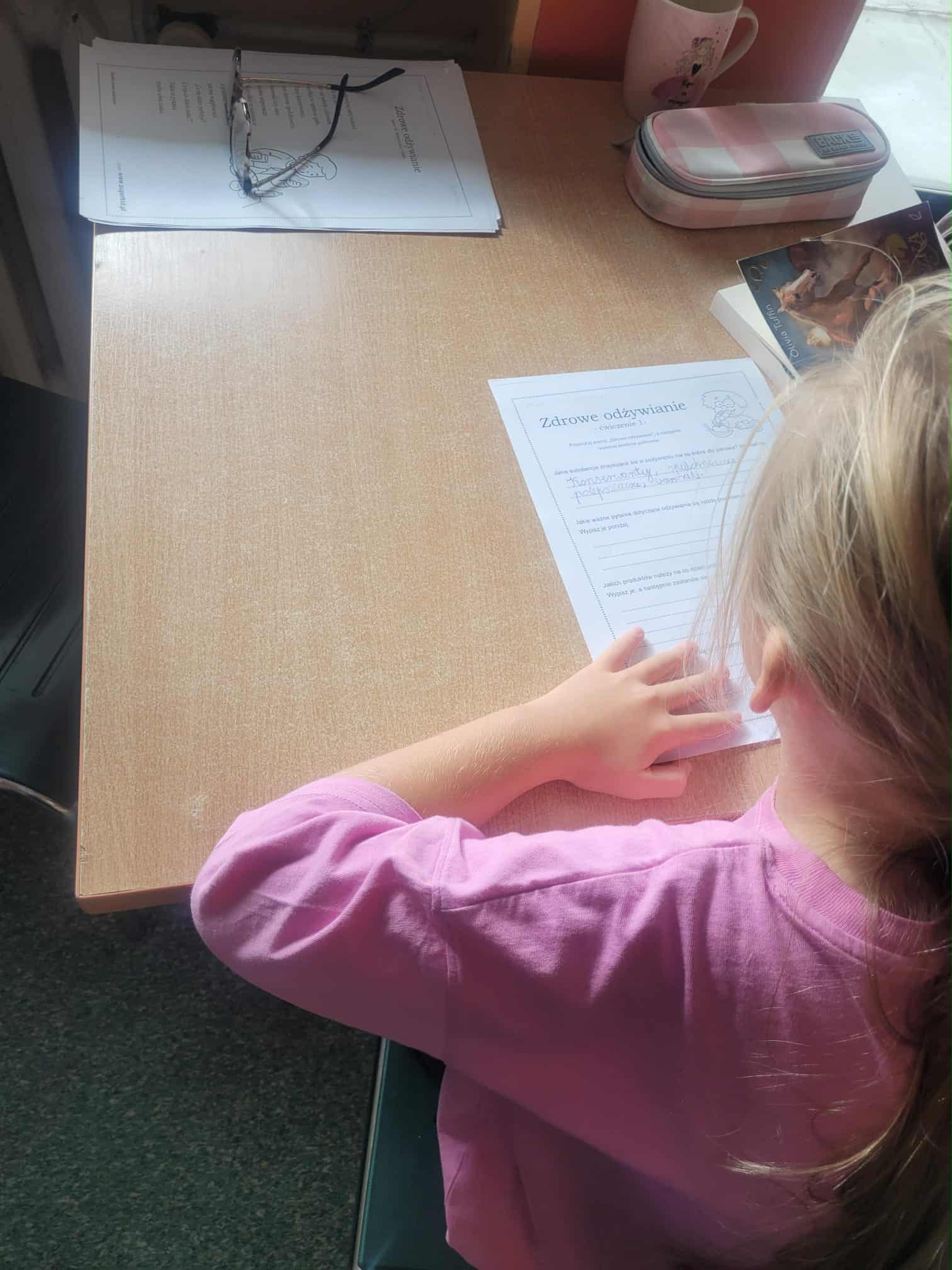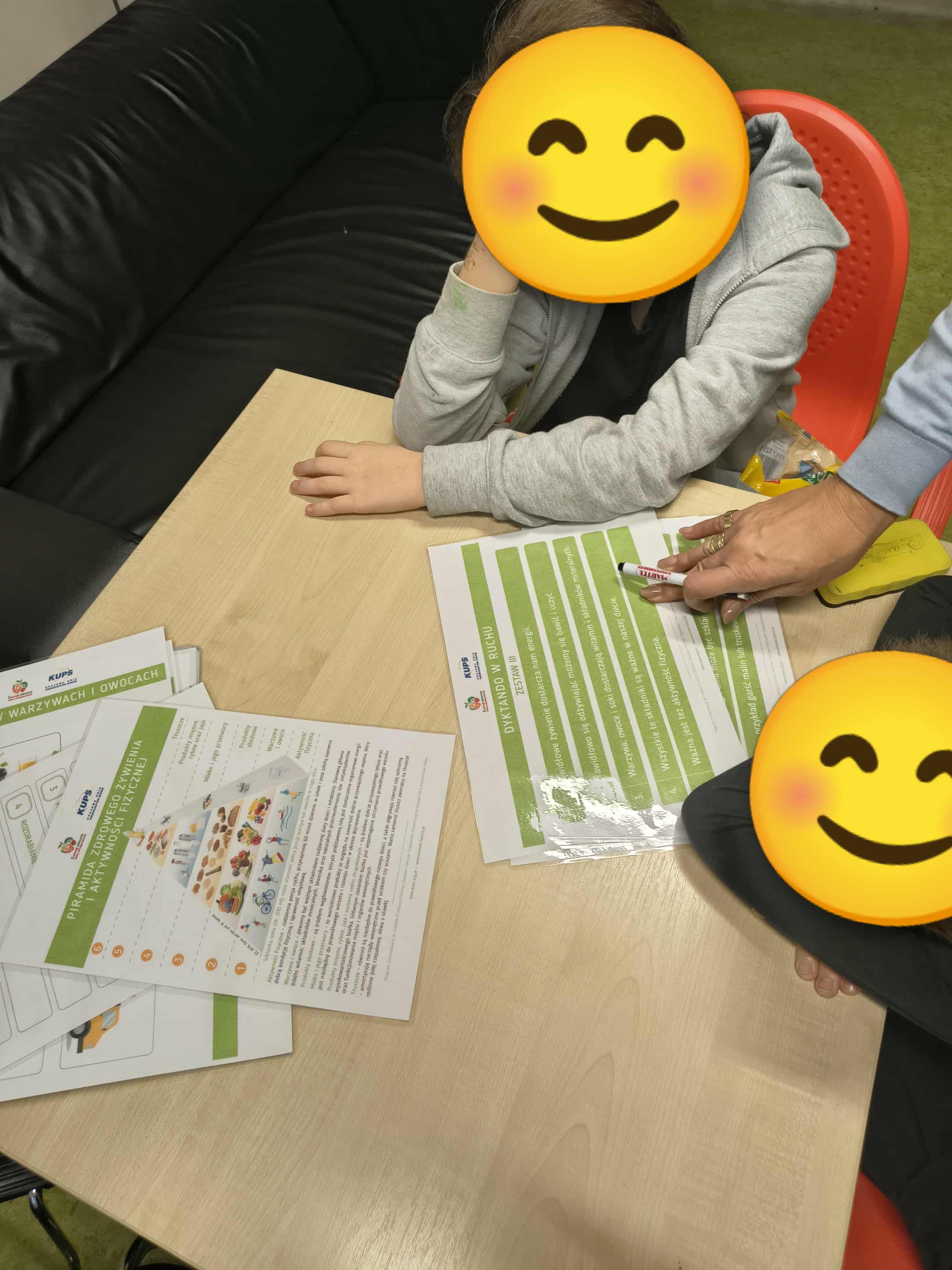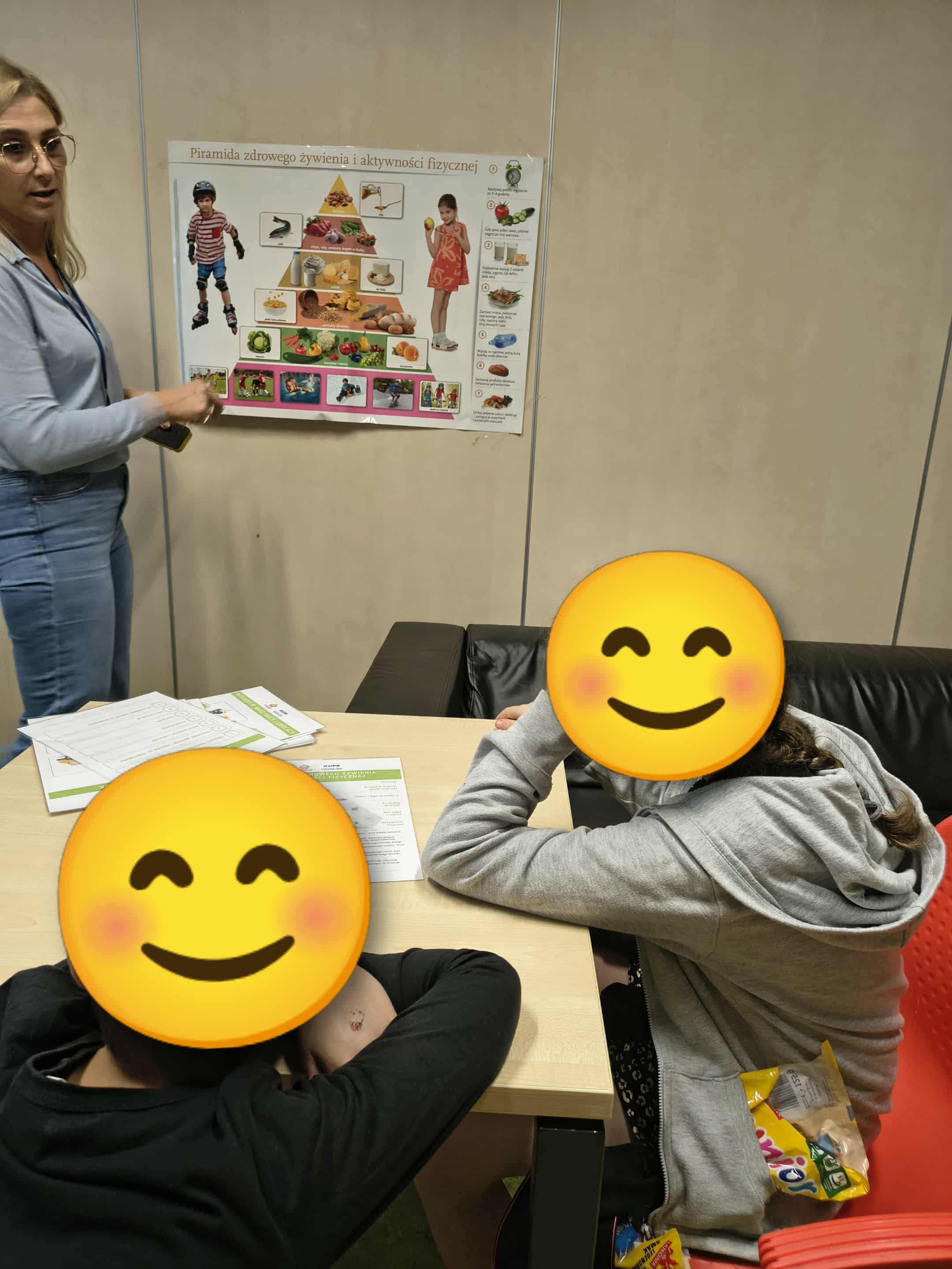 Dzieci poznały piramidę zdrowego żywienia, która pokazuje, jakie produkty powinniśmy jeść najczęściej, a jakie rzadziej. Rozwiązywaliśmy rebusy i karty pracy o zdrowym jedzeniu. Uczniowie rozmawiali o tym, co szkodzi zdrowiu – np. zbyt dużo słodyczy, chipsów, napojów gazowanych i brak ruchu. Na koniec przypomnieliśmy, że aby być zdrowym, trzeba: jeść różnorodne posiłki, pić dużo wody, ruszać się każdego dnia, dobrze się wysypiać i dbać o odpoczynek.